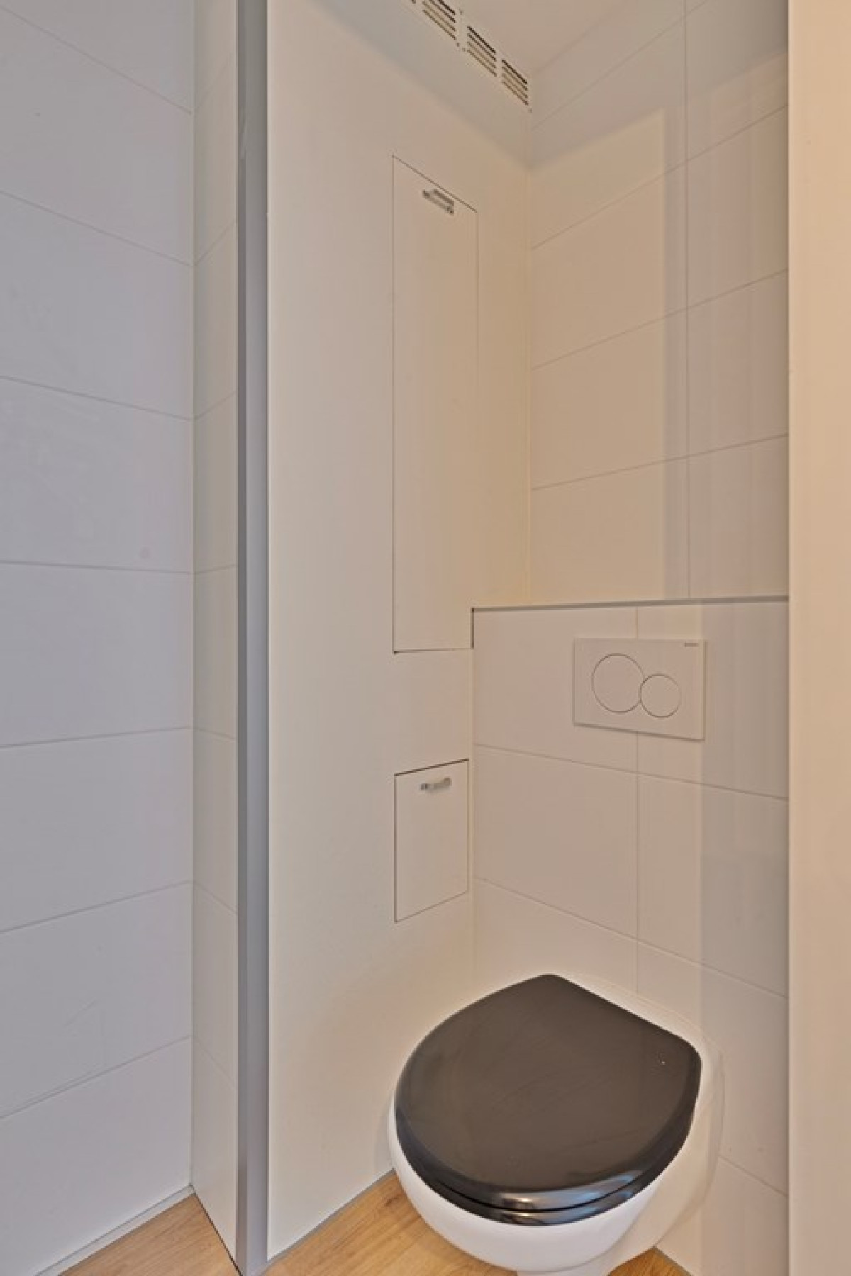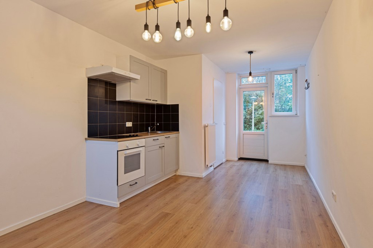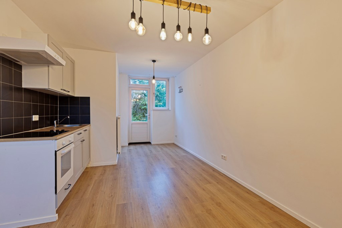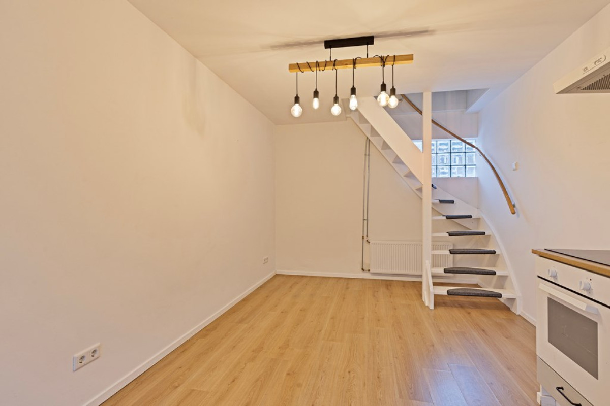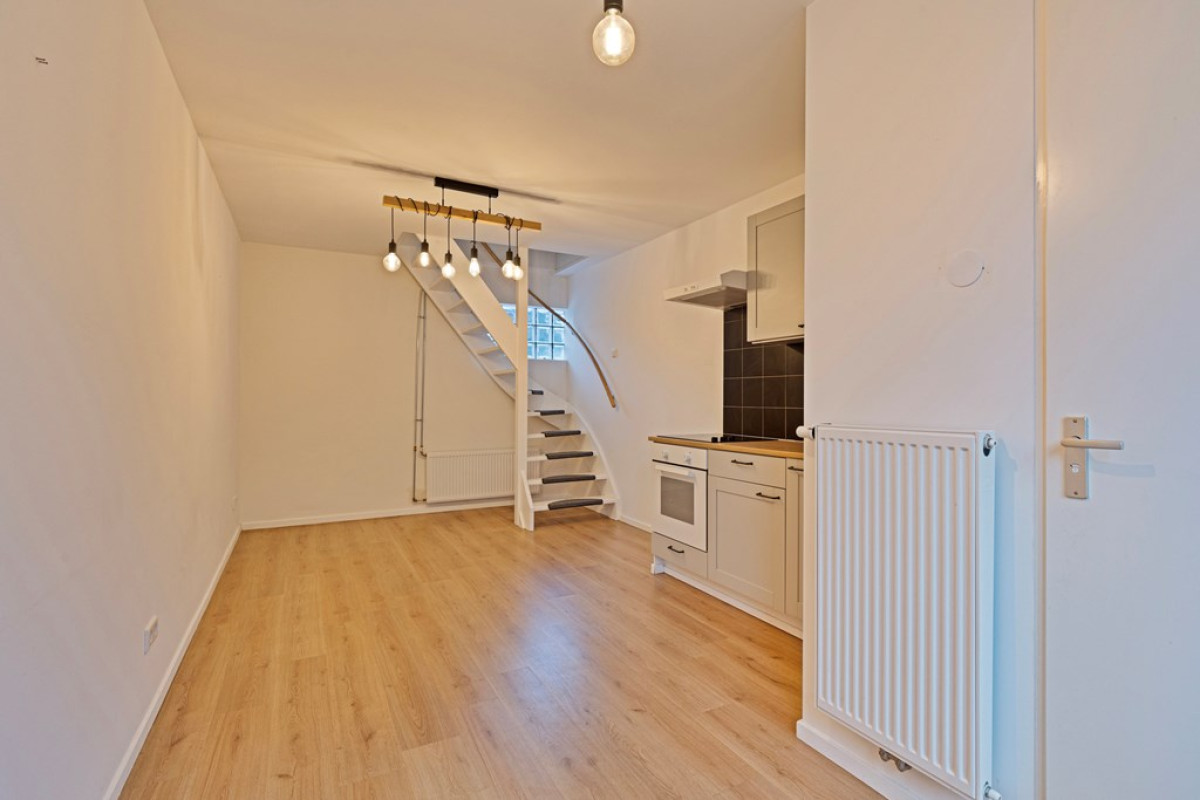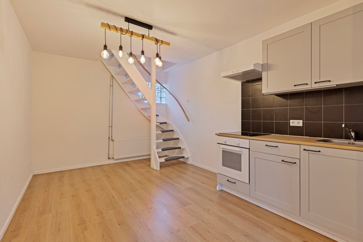 Entree met rechts een deur naar aparte toilet . Lichte woonkamer met een open moderne keuken, uitgerust met inbouwapparatuur en een inductiekookplaat. Mooie wenteltrap naar de eerste verdieping.