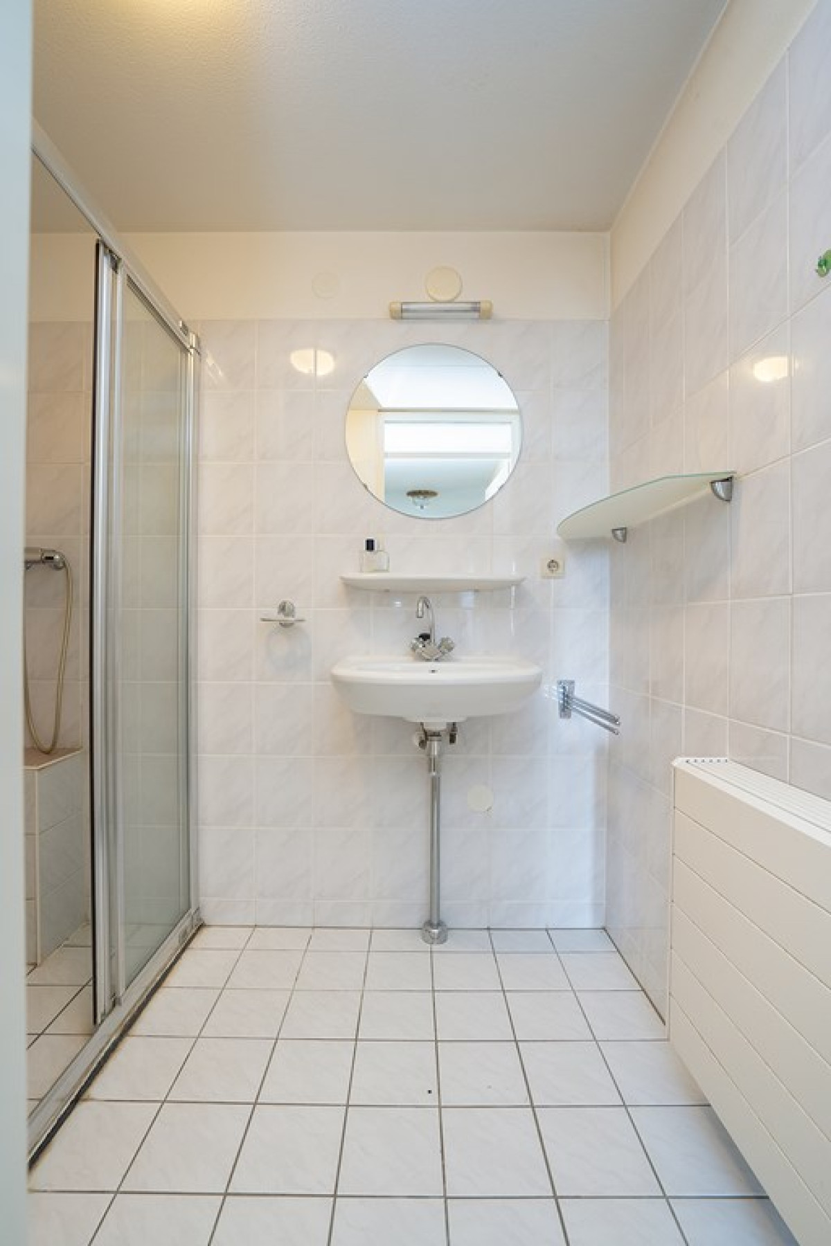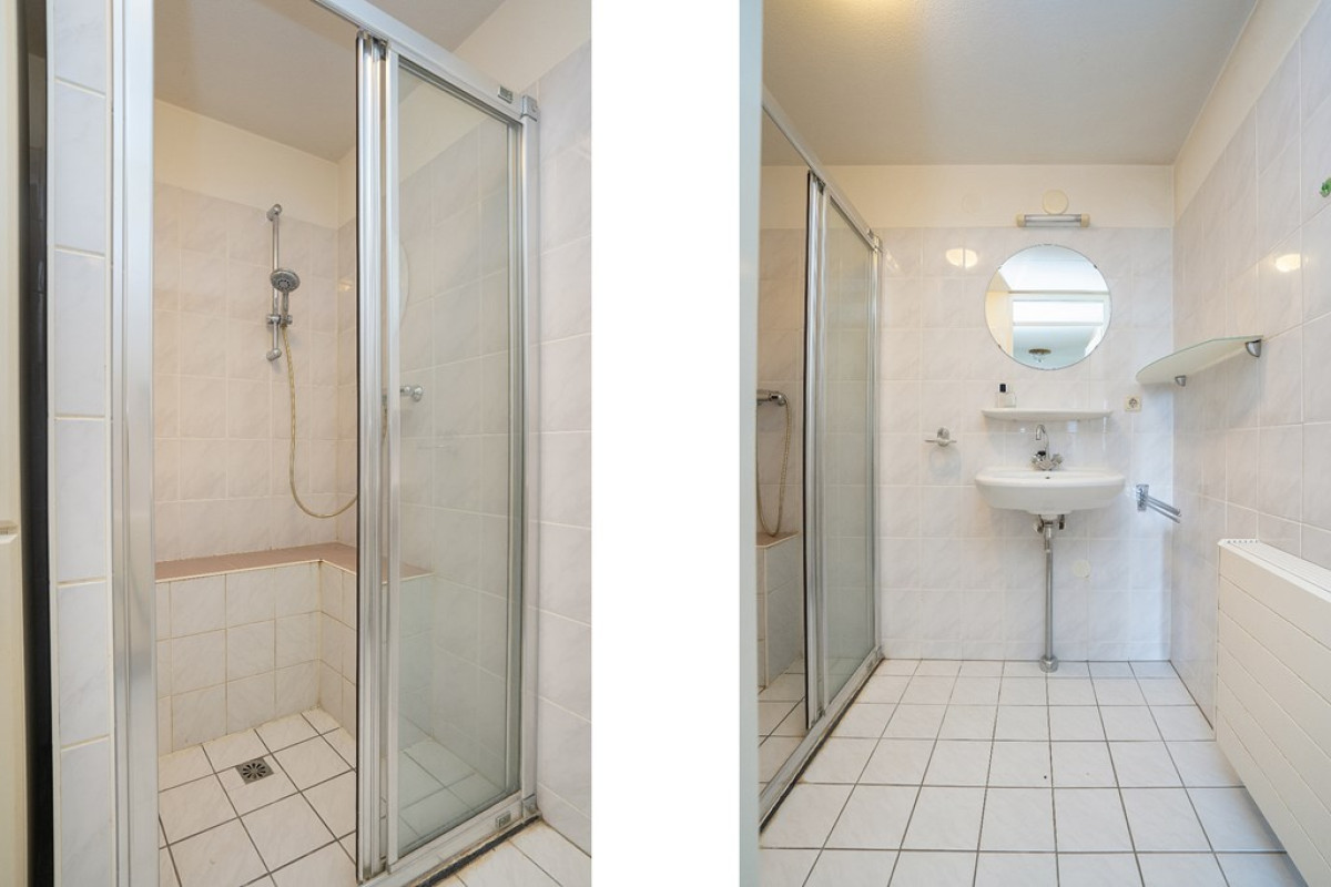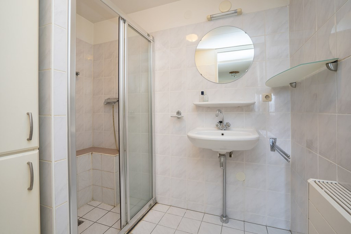 De badkamer is ontworpen met een douchecabine en een wastafel. Lichte vloer- en wandtegels creëren een frisse uitstraling.