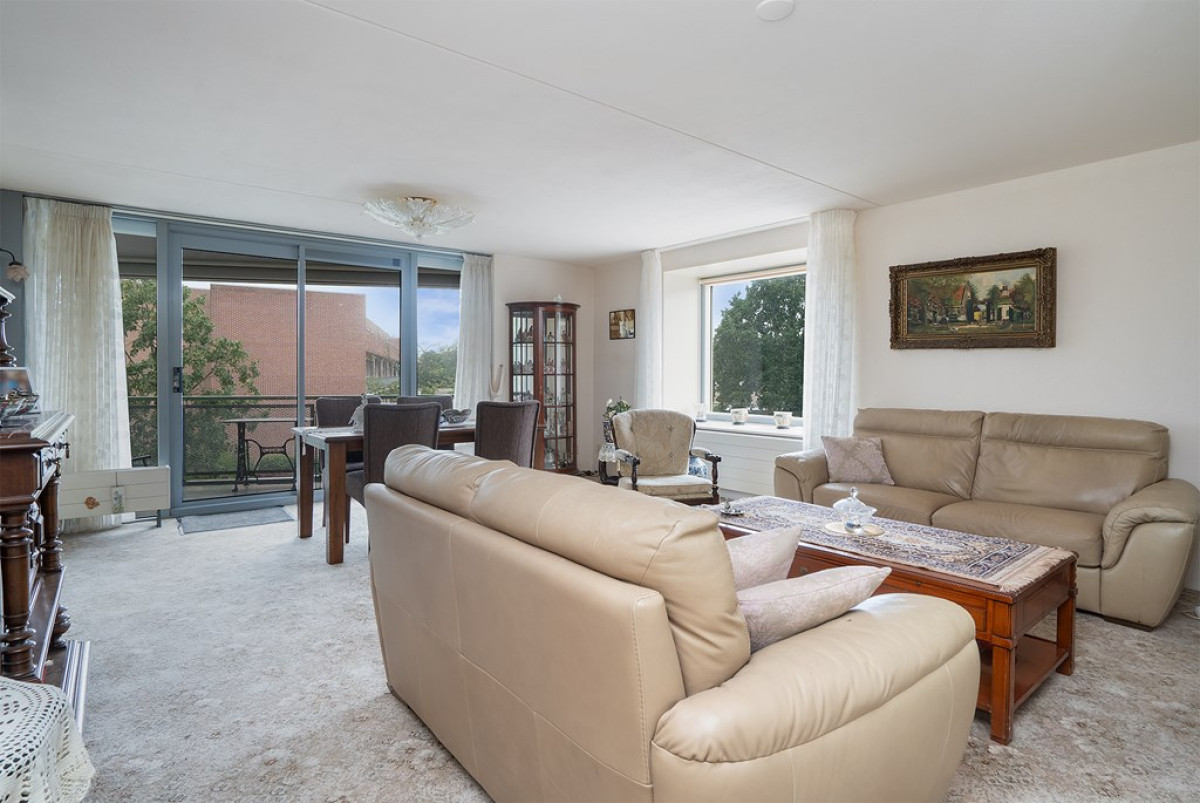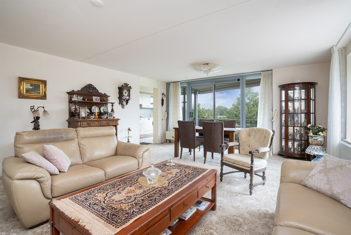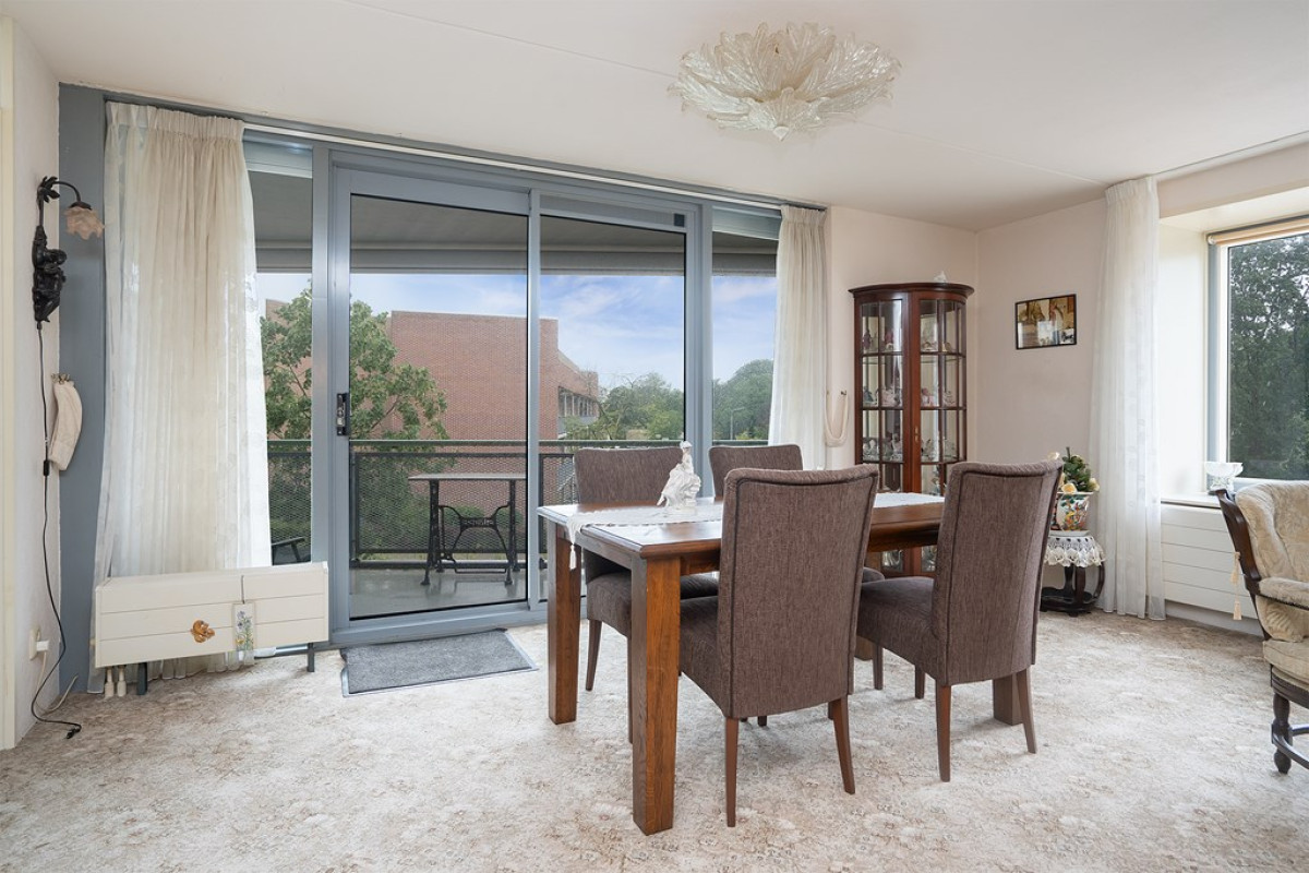 De woonkamer is een ware oase van natuurlijk daglicht, dankzij de overvloedige raampartijen die de ruimte verlichten. Een beige tapijt vormt een comfortabele basis voor het zit- en eetgedeelte, dat met zorg is ingericht. Vanuit de woonkamer heb je direct toegang tot een balkon, waar je kunt genieten van frisse lucht en een moment van ontspanning kunt beleven.