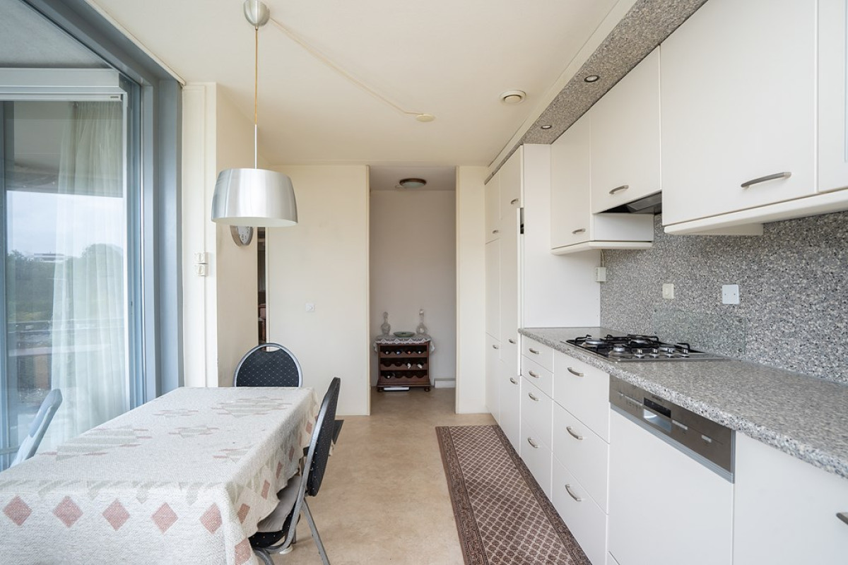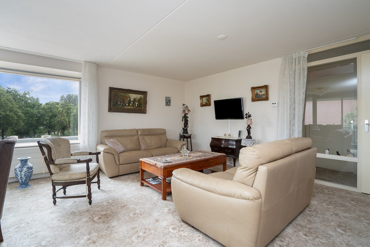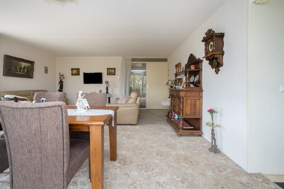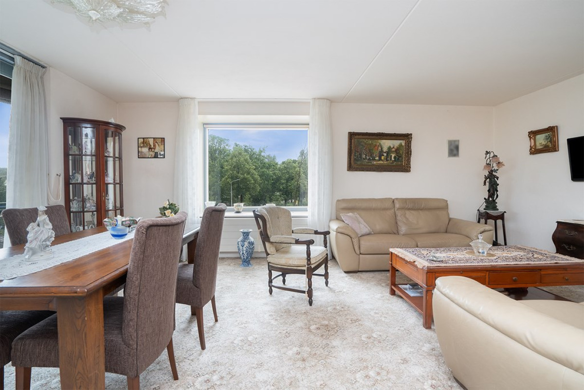 De woonkamer is een ware oase van natuurlijk daglicht, dankzij de overvloedige raampartijen die de ruimte verlichten. Een beige tapijt vormt een comfortabele basis voor het zit- en eetgedeelte, dat met zorg is ingericht. Vanuit de woonkamer heb je direct toegang tot een balkon, waar je kunt genieten van frisse lucht en een moment van ontspanning kunt beleven.