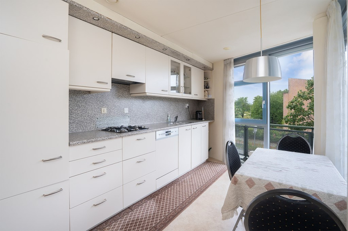 De keuken is een prima, met lichtspots die de ruimte verlichten. Lichte keukenkasten met chromen handvatten en een mooi granieten keukenblad. De keuken is volledig uitgerust met een gaskookplaat, afzuigunit, vaatwasser van Siemens en een koel/vriescombinatie.