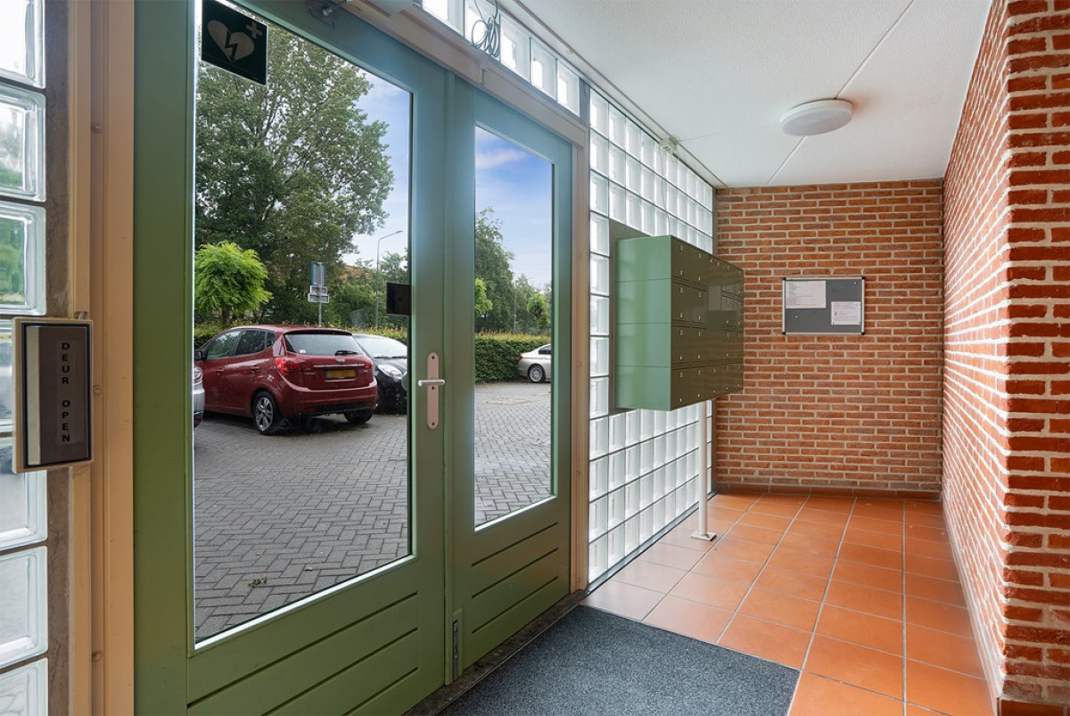 Bij binnenkomst in het complex word je verwelkomd door een fraaie centrale entree, waar je via een trap of lift toegang krijgt tot de verdieping van het appartement. De hal van de woning verwelkomt je met een donker tapijt en lichte wanden, wat direct een warme en uitnodigende sfeer creëert. Vanuit hier kun je alle kanten op: twee slaapkamers, een separaat toilet, een badkamer en natuurlijk de woonkamer.