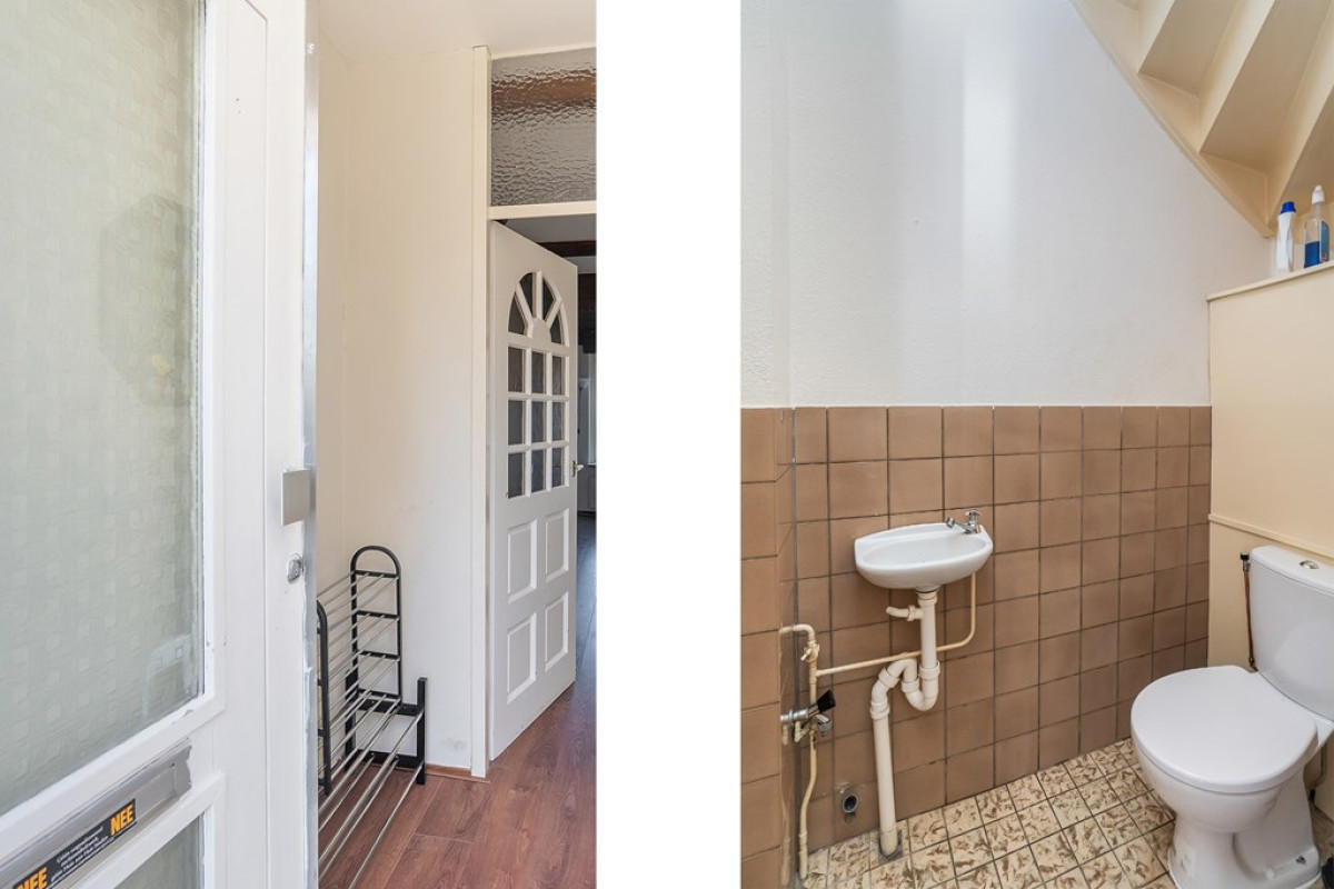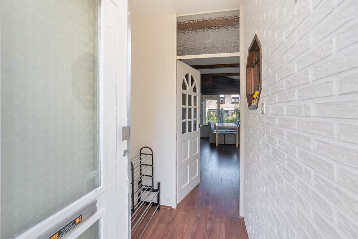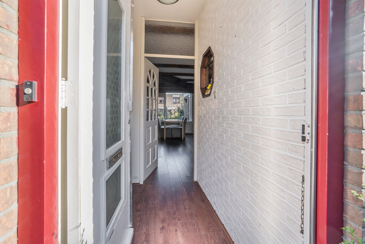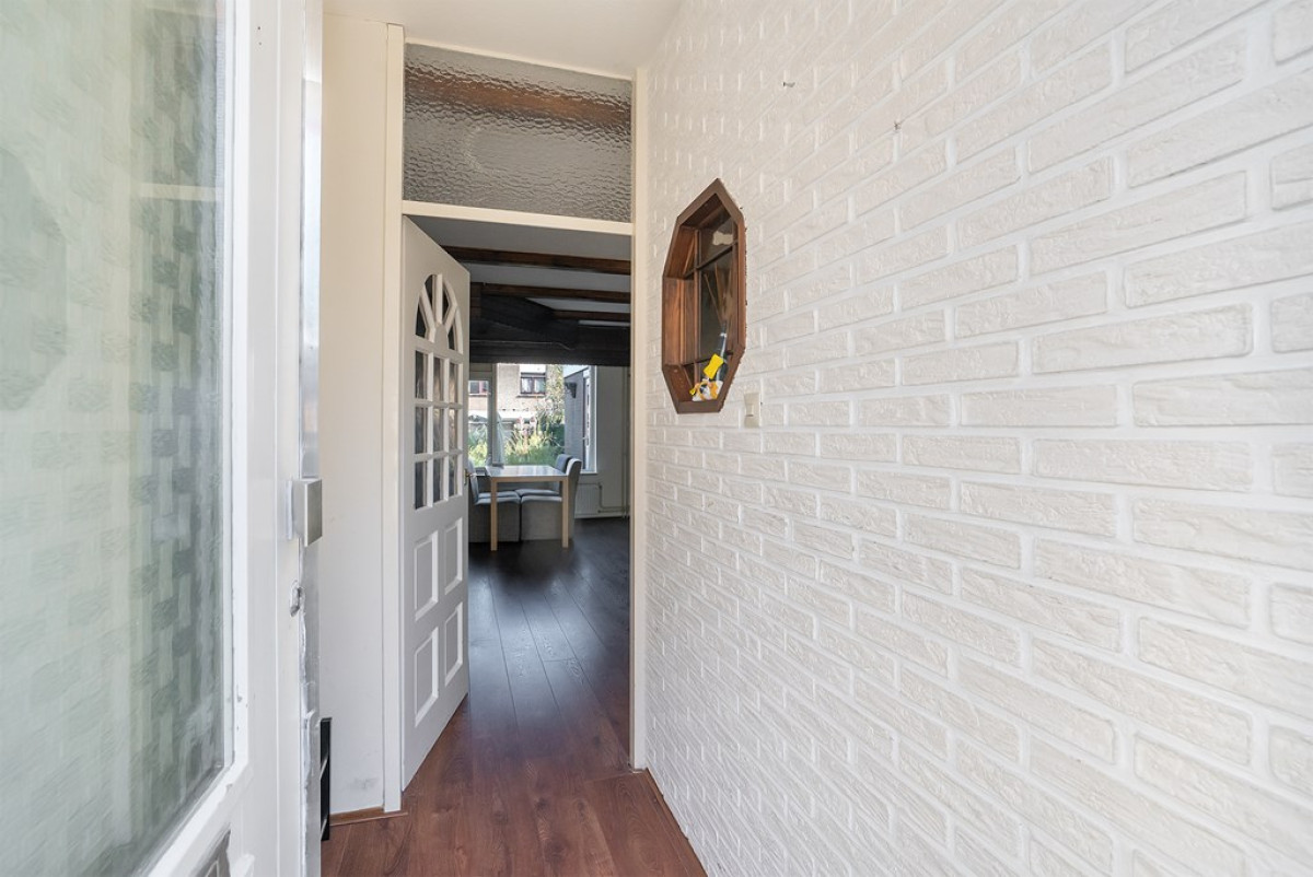 De centrale entree brengt je in een uitnodigende hal die leidt naar de woonkamer. Hier voel je de sfeer meteen door de houten steunbalken die de ruimte karakter geven. Visualiseer jezelf hier met vrienden en familie voor een gezellige filmavond of een intiem diner. Een aangrenzende hal biedt toegang tot de eerste verdieping en het toilet. De woonkamer stroomt naadloos over in de keuken.