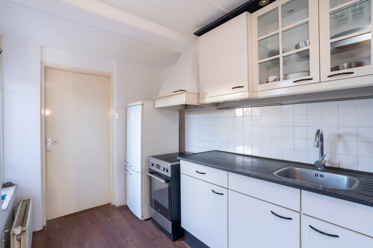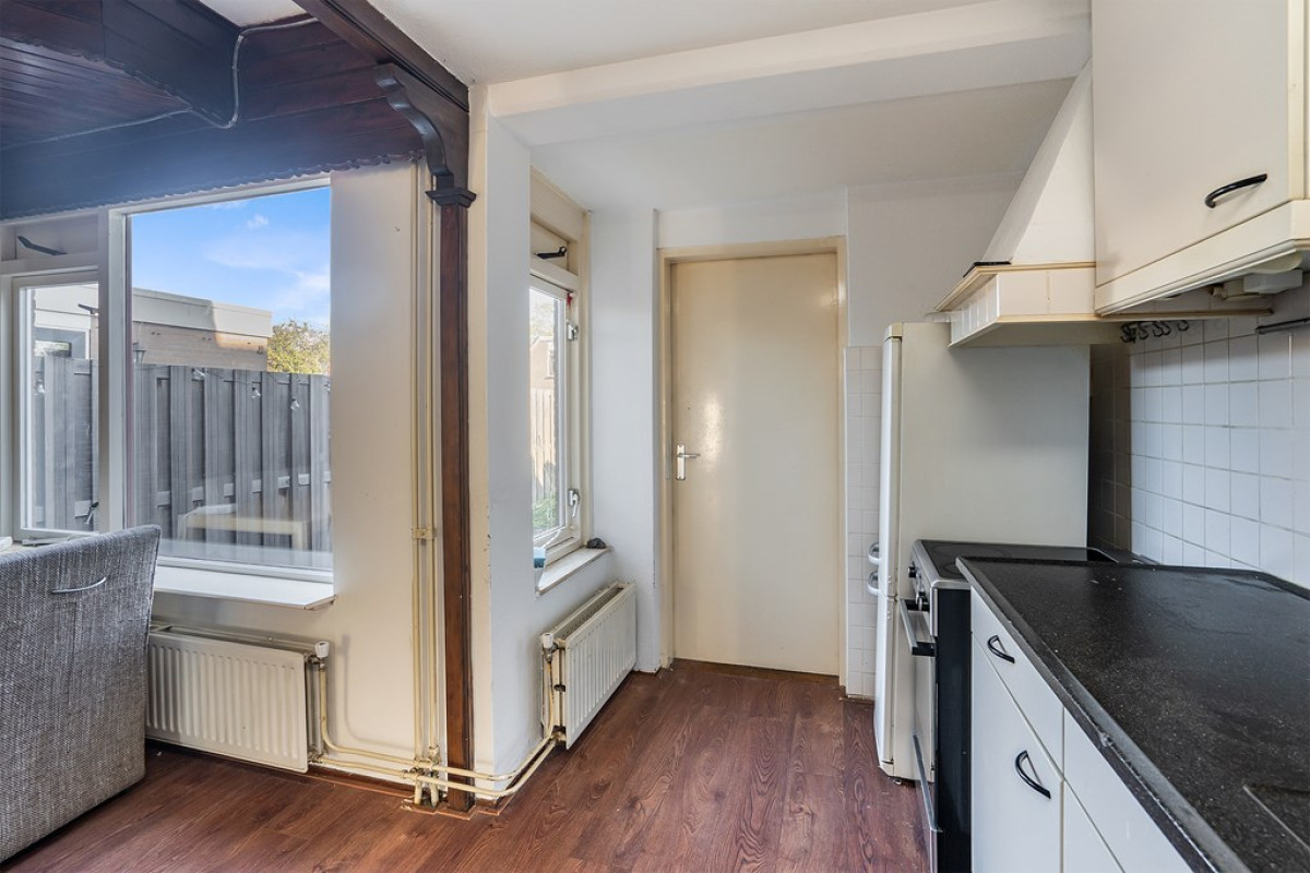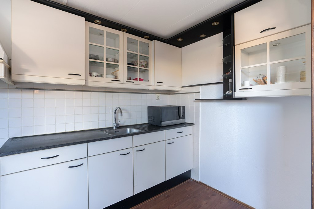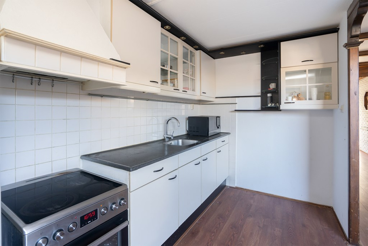 In de keuken zijn de witte keukenkasten met zwarte handvatten en een donker keukenblad niet alleen stijlvol, maar ook functioneel. Hier ben je voorzien van een fornuis en een koel-/vriescombinatie. Aansluitend vind je een bijkeuken die je naar de achtertuin leidt.