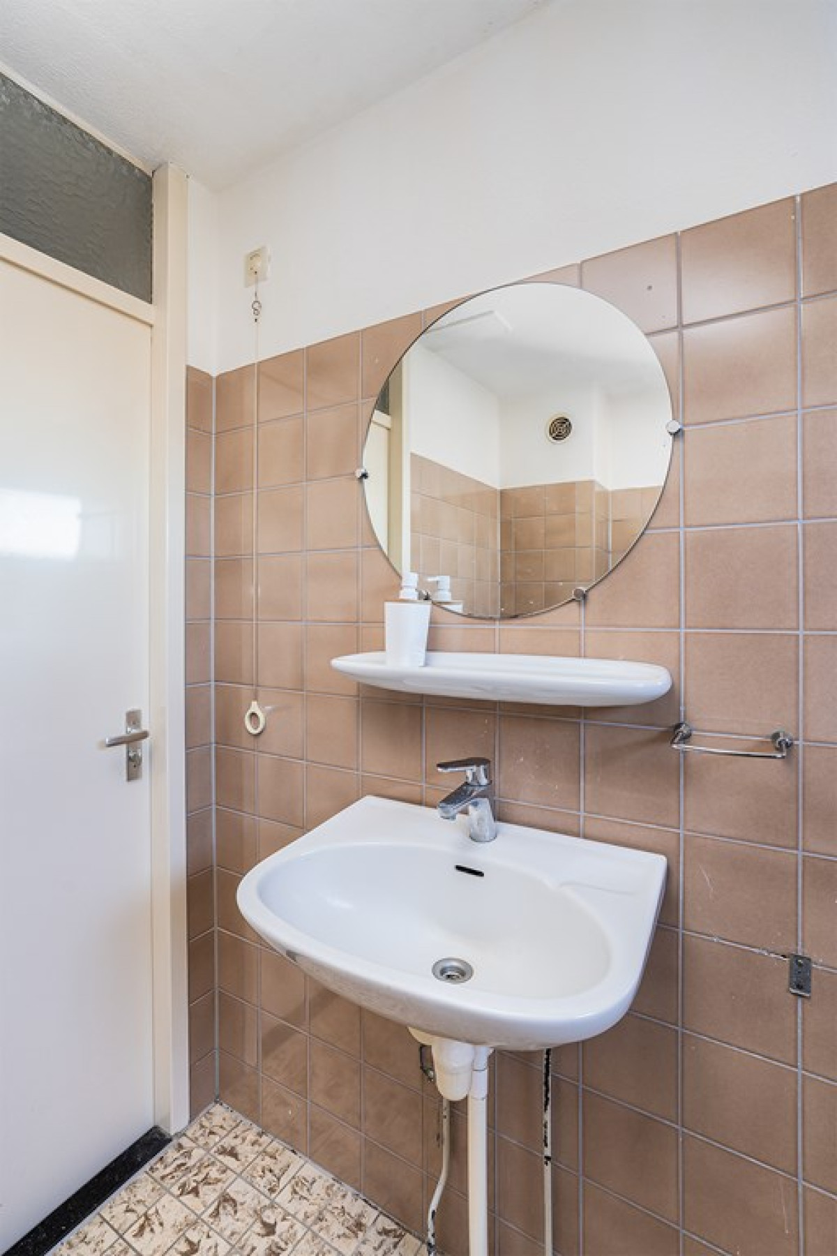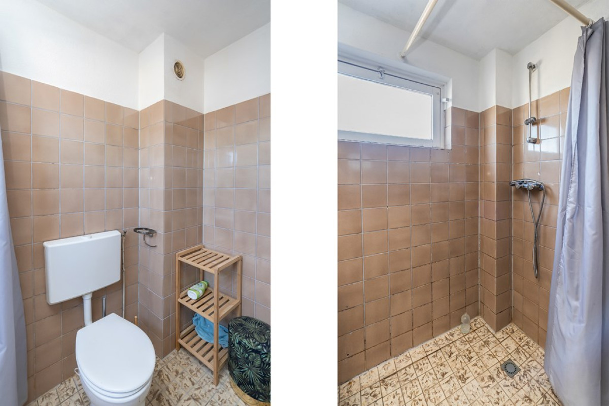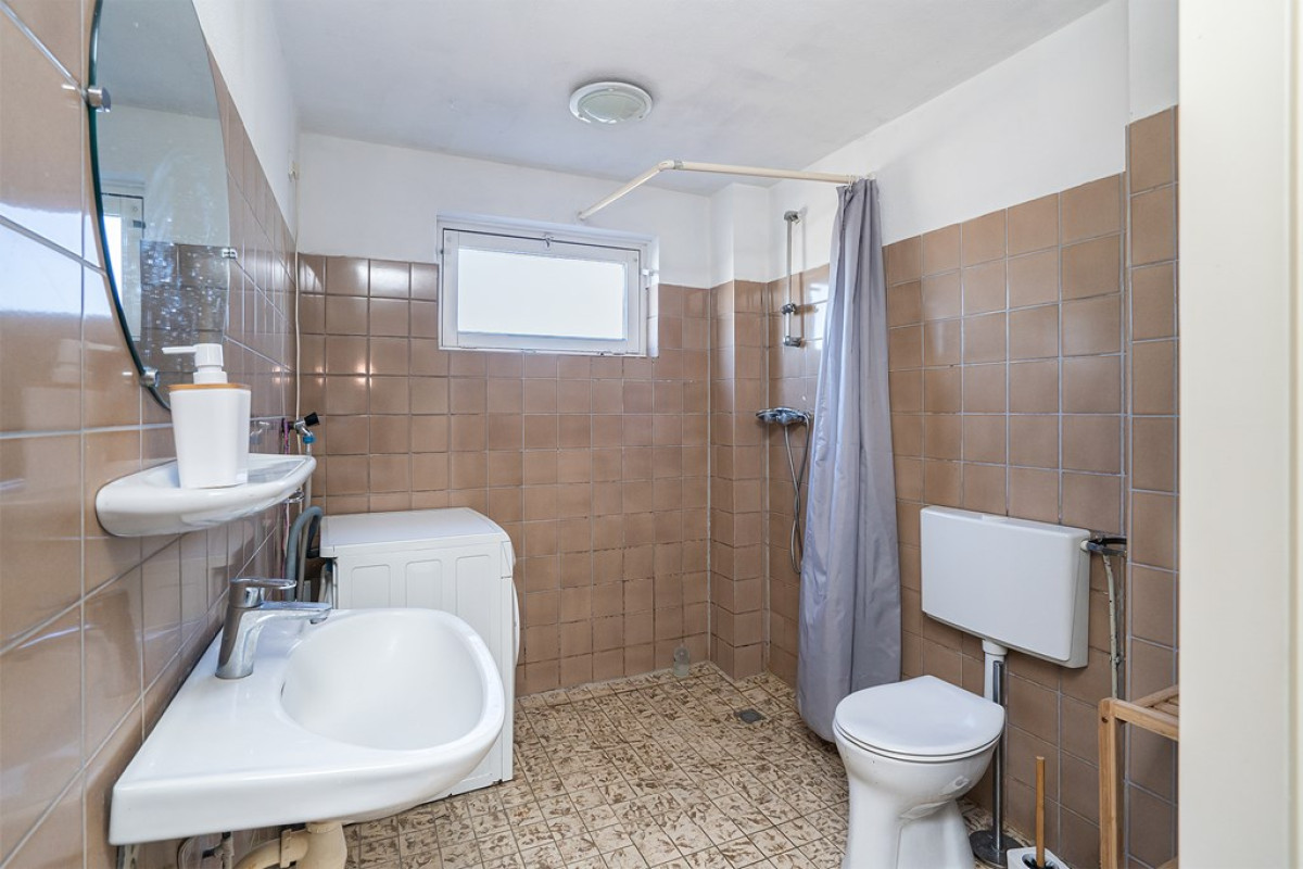 Een vaste trap brengt je naar de overloop op de eerste verdieping. Hier tref je twee slaapkamers en een badkamer. De badkamer is uitgerust met lichte vloertegels en bruine wandtegels. Het beschikt over een vast toilet, wasmachine/droger aansluiting, wastafel.