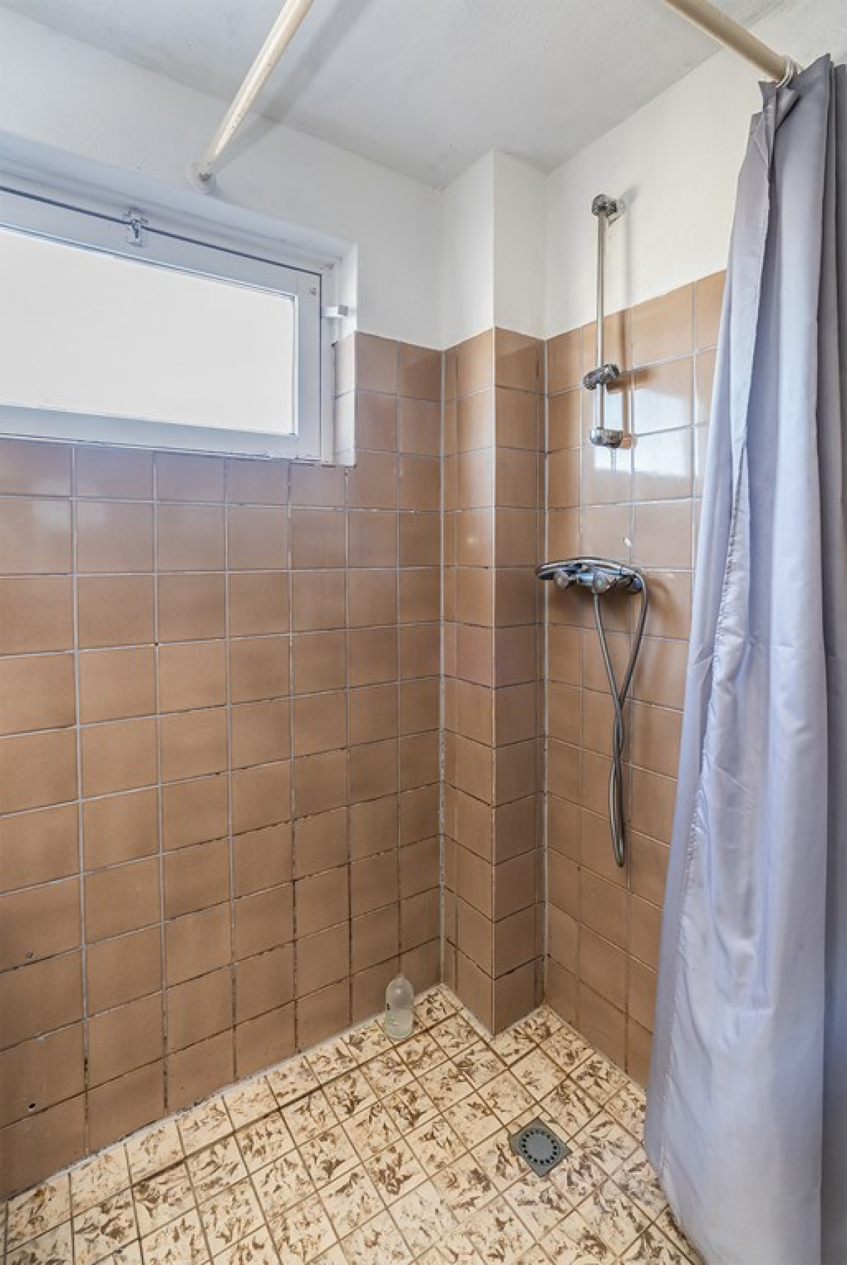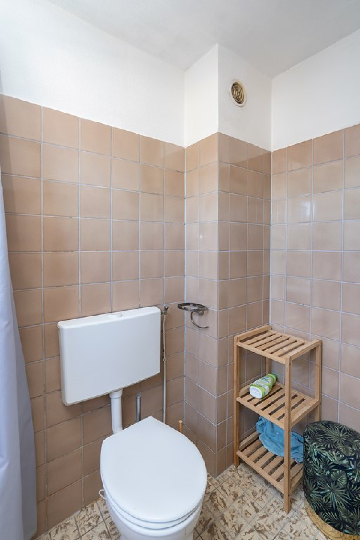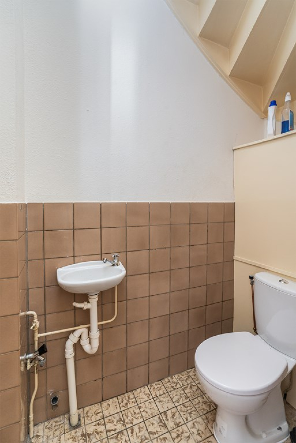 Een vaste trap brengt je naar de overloop op de eerste verdieping. Hier tref je twee slaapkamers en een badkamer. De badkamer is uitgerust met lichte vloertegels en bruine wandtegels. Het beschikt over een vast toilet, wasmachine/droger aansluiting, wastafel.