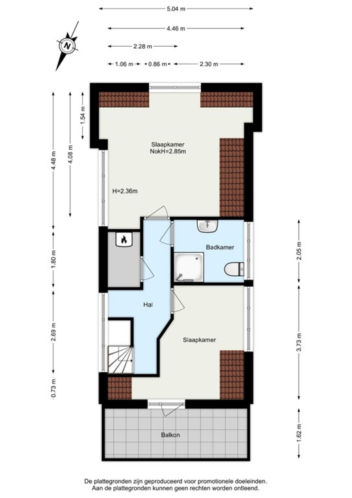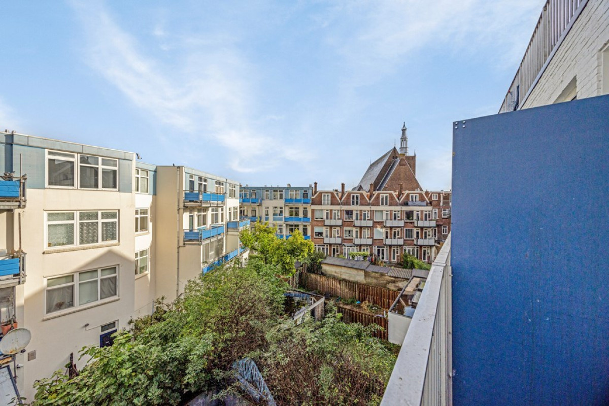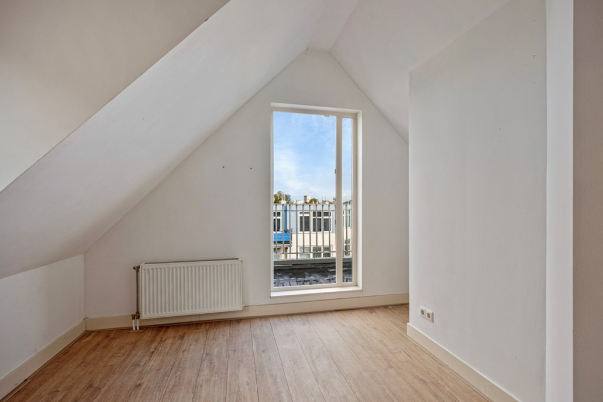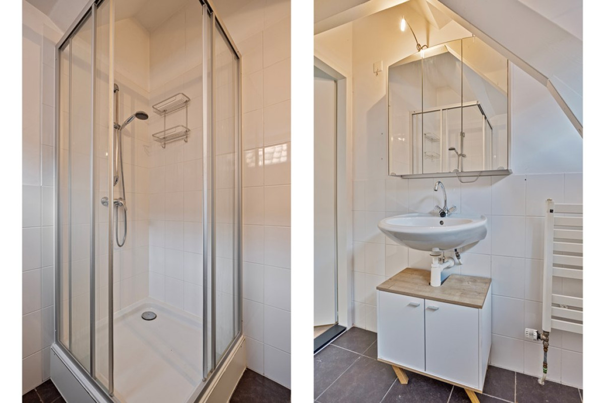 4e Verdieping: De vierde verdieping herbergt een ruime slaapkamer aan de voorzijde. De badkamer, bereikbaar via de overloop, is uitgerust met een wastafelmeubel, toilet en douche. Aan de achterzijde bevindt zich een tweede slaapkamer, die toegang biedt tot een royaal balkon.