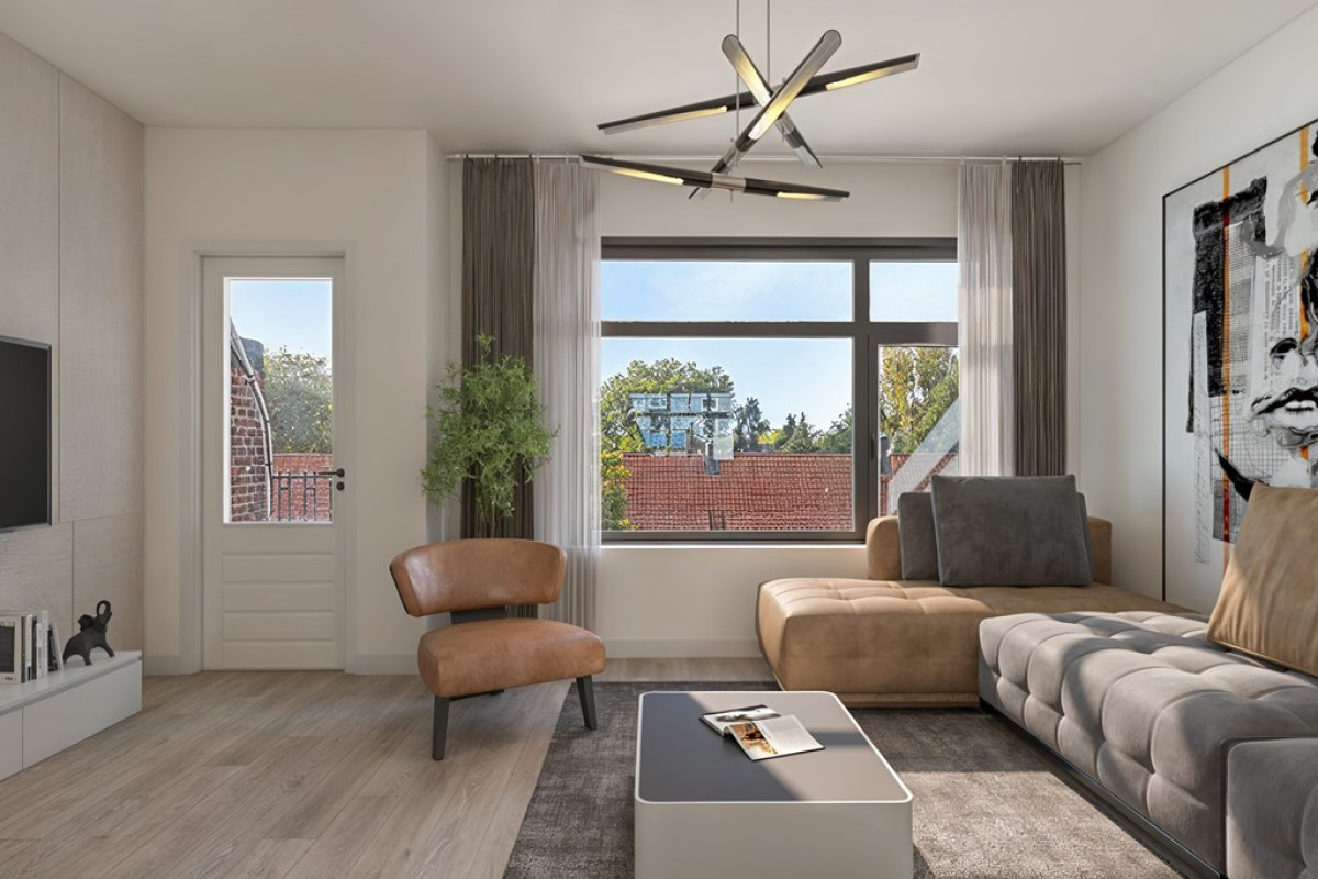 3e Verdieping: De woning biedt een ruime woonkamer aan de voorzijde, voorzien van een balkon. Aan de achterzijde vind je de eetkamer met een open keuken, die toegang biedt tot het balkon aan de achterzijde. Vanuit de hal bereik je het eerste toilet.