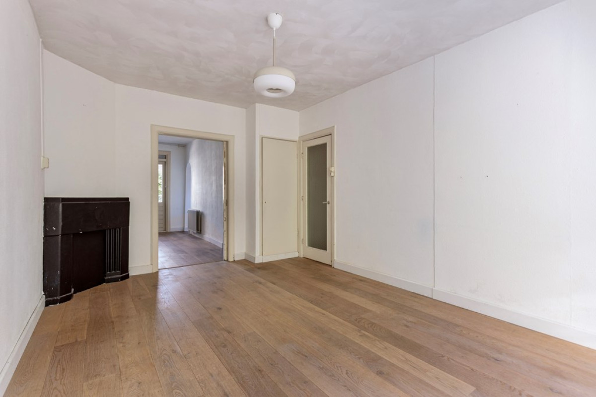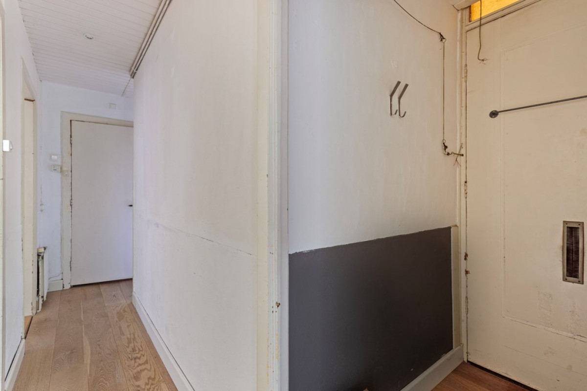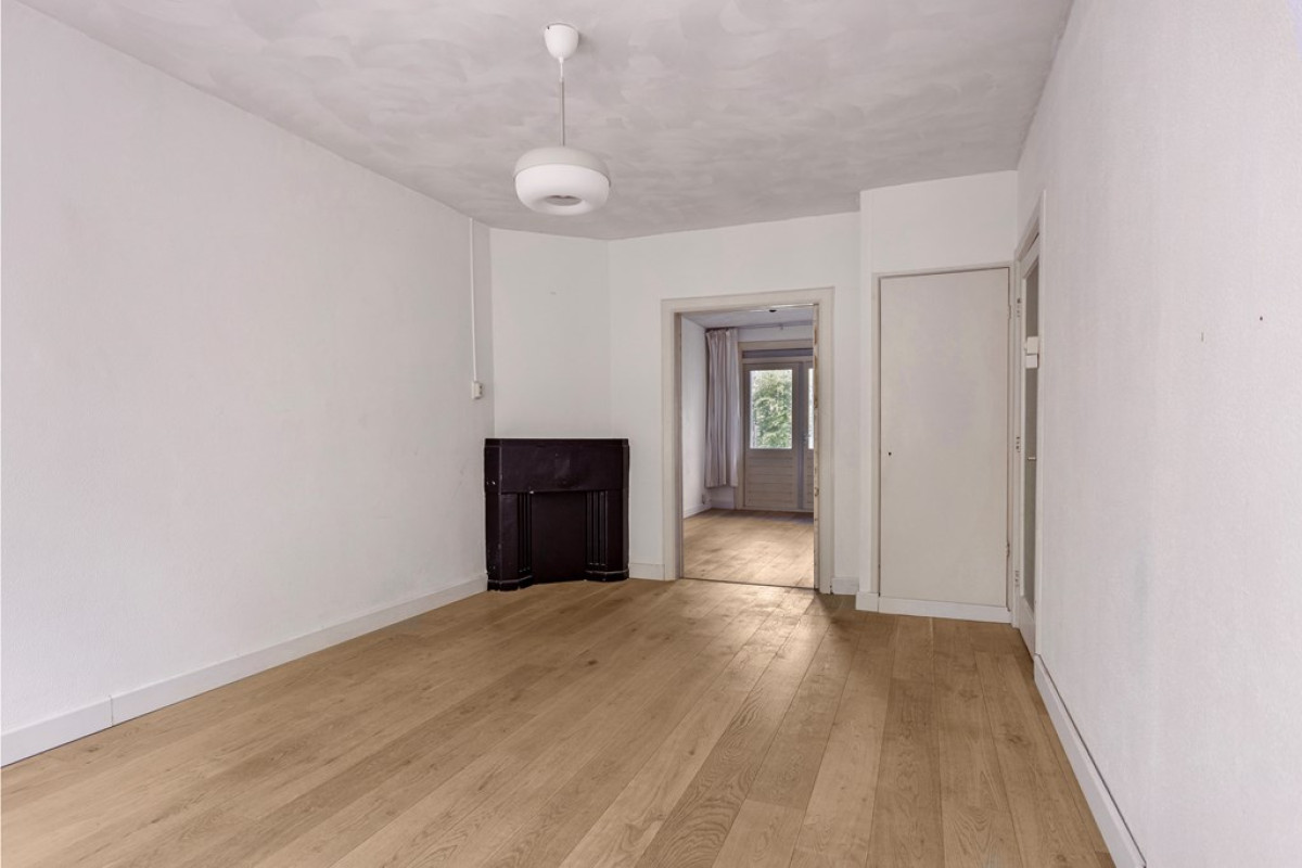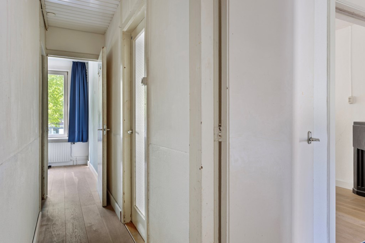 At the entrance you will find an open porch and an enclosed (shared) stairwell from the first floor. Upon entering you enter a central hall that connects all rooms. The living room is located at the front of the house and has an en-suite room at the back. This en-suite room, previously used as a bedroom, can also serve as a dining room. Next to the living room is a spacious bedroom with a large built-in wardrobe. The kitchen is located at the back and is openly connected to the en-suite room. Next to the kitchen is the bathroom with a shower, washbasin, towel radiator and washing machine connection. The toilet is separate.