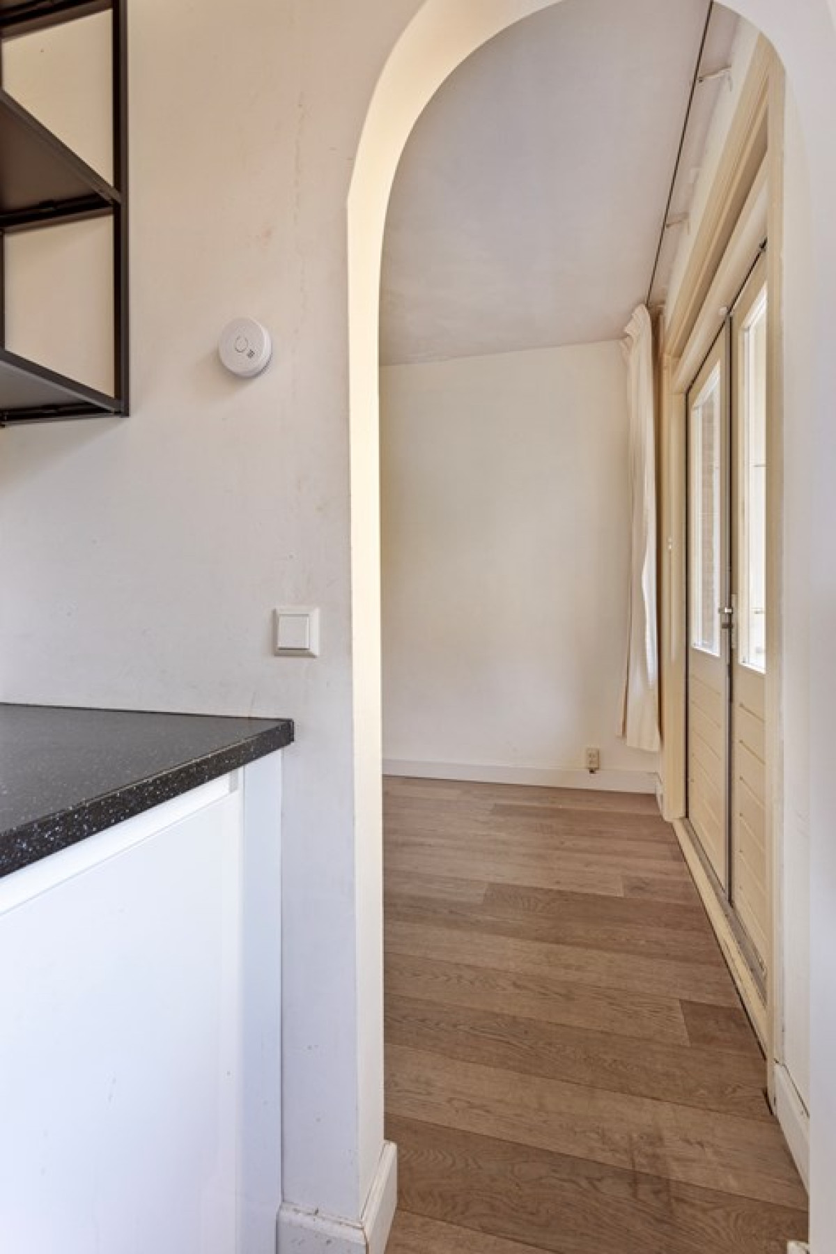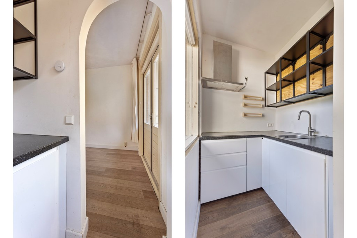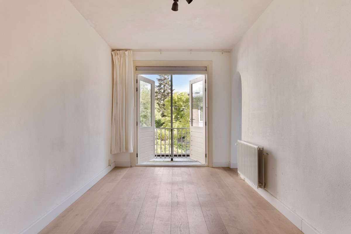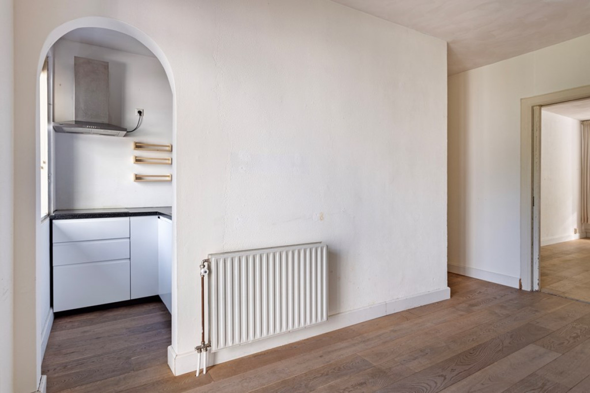 At the entrance you will find an open porch and an enclosed (shared) stairwell from the first floor. Upon entering you enter a central hall that connects all rooms. The living room is located at the front of the house and has an en-suite room at the back. This en-suite room, previously used as a bedroom, can also serve as a dining room. Next to the living room is a spacious bedroom with a large built-in wardrobe. The kitchen is located at the back and is openly connected to the en-suite room. Next to the kitchen is the bathroom with a shower, washbasin, towel radiator and washing machine connection. The toilet is separate.
