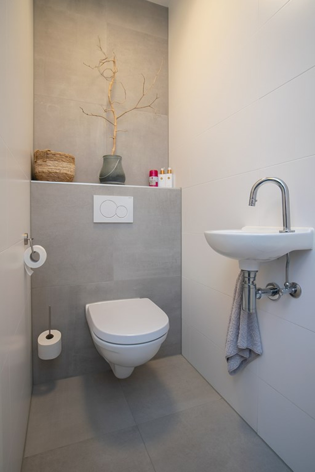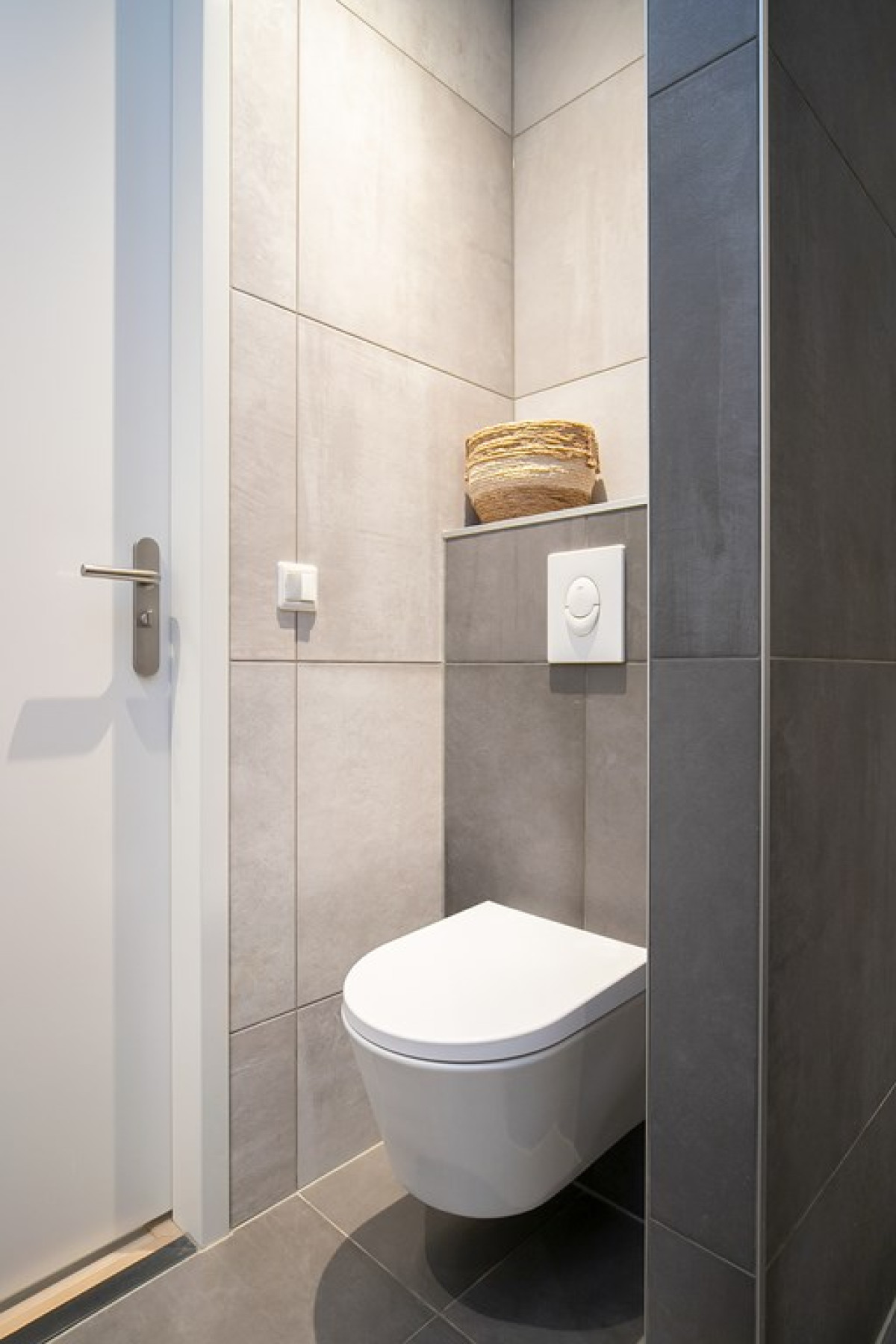 Het toilet is volledig betegeld en voorzien van een zwevend wandcloset en een fonteintje.