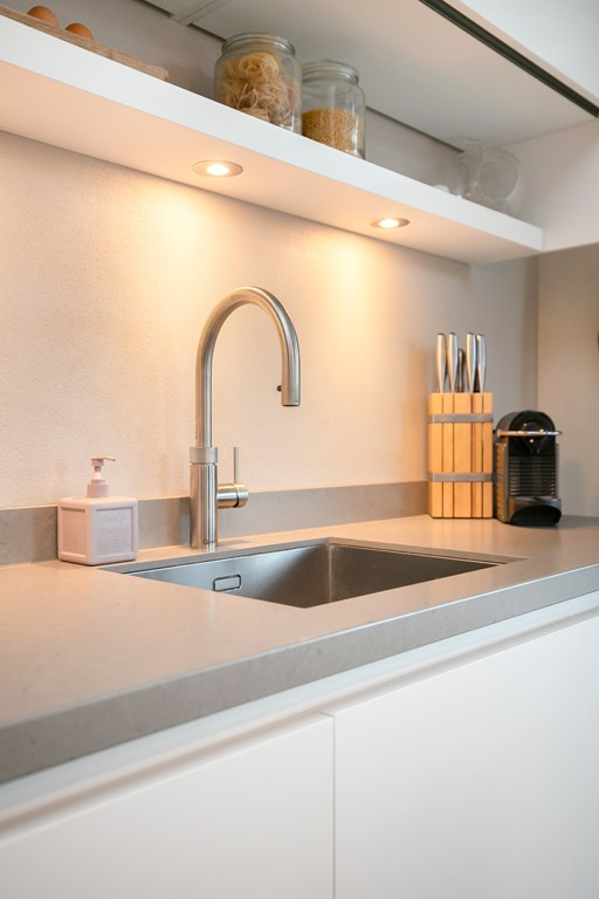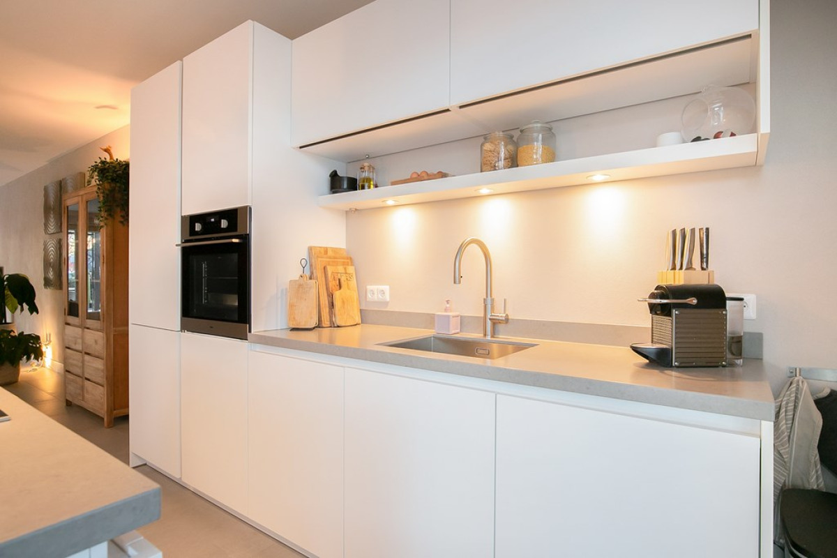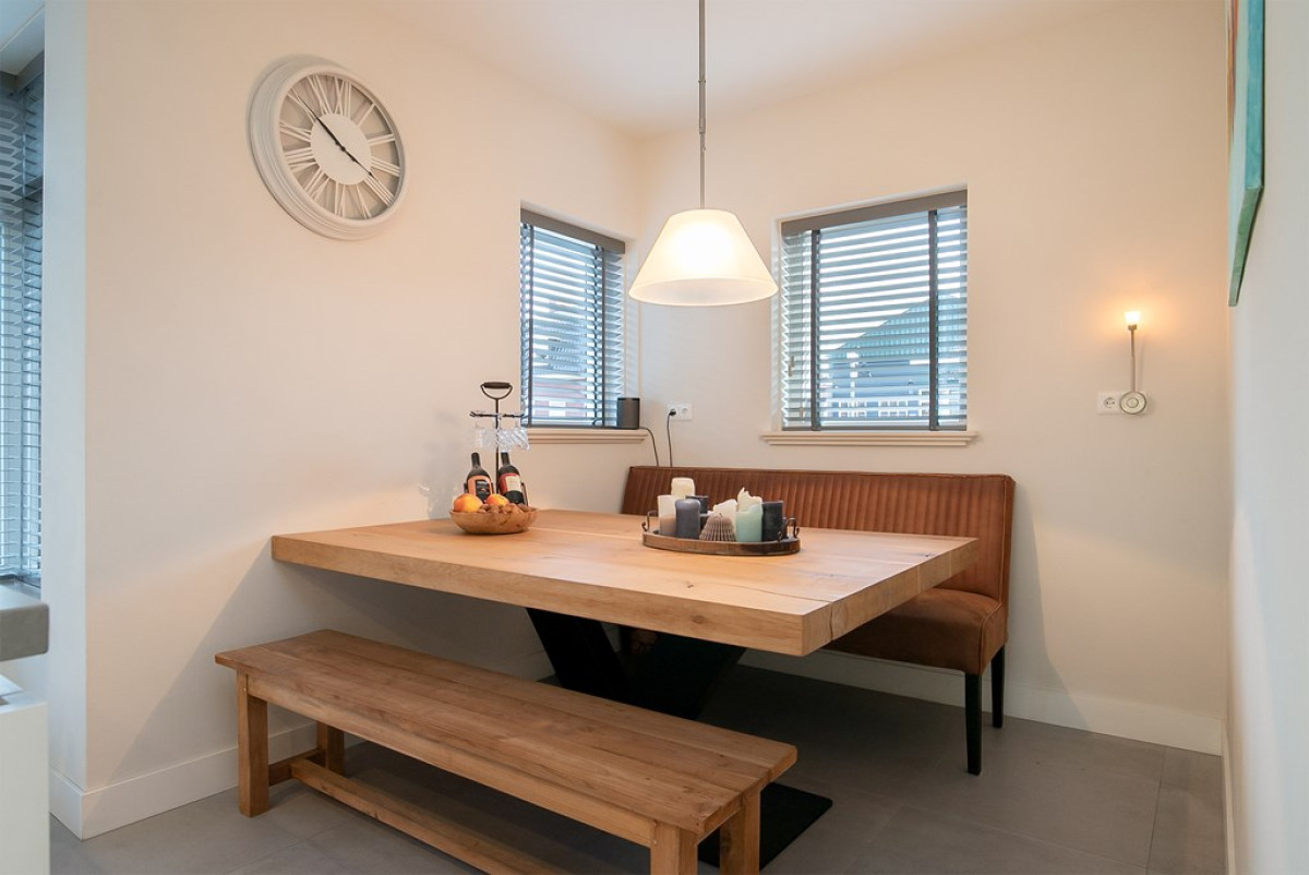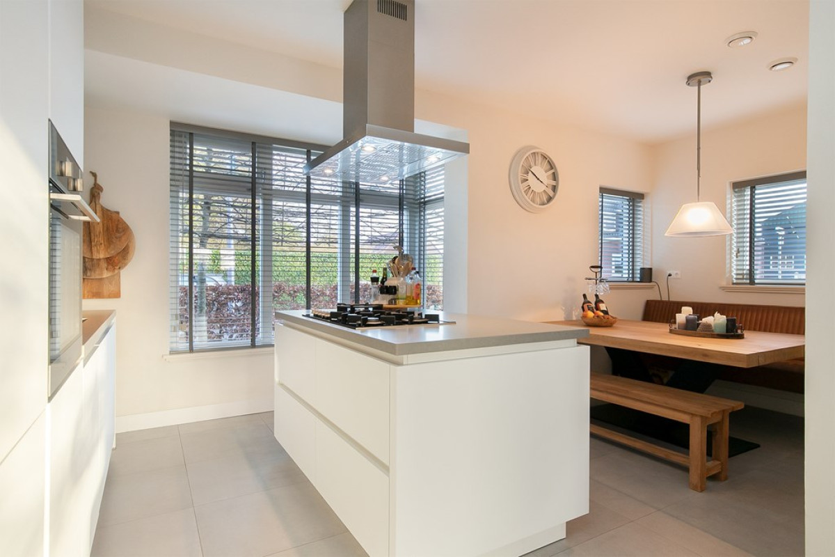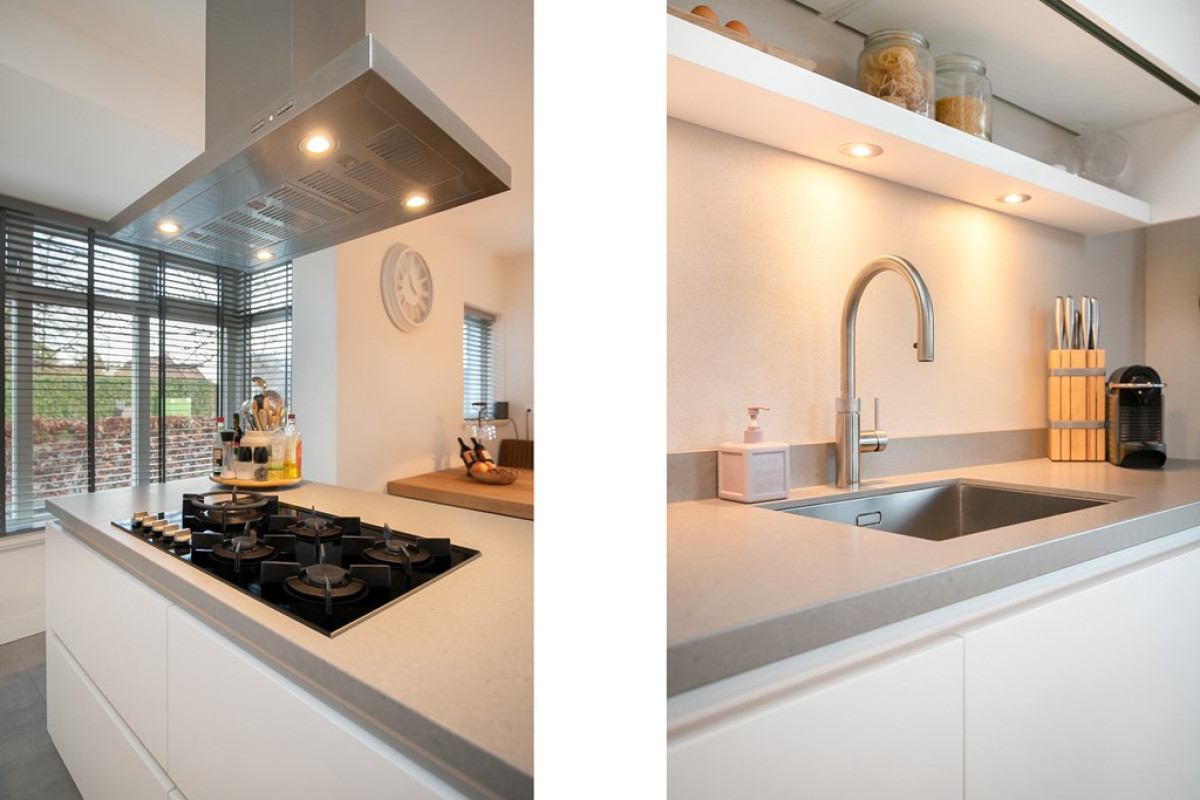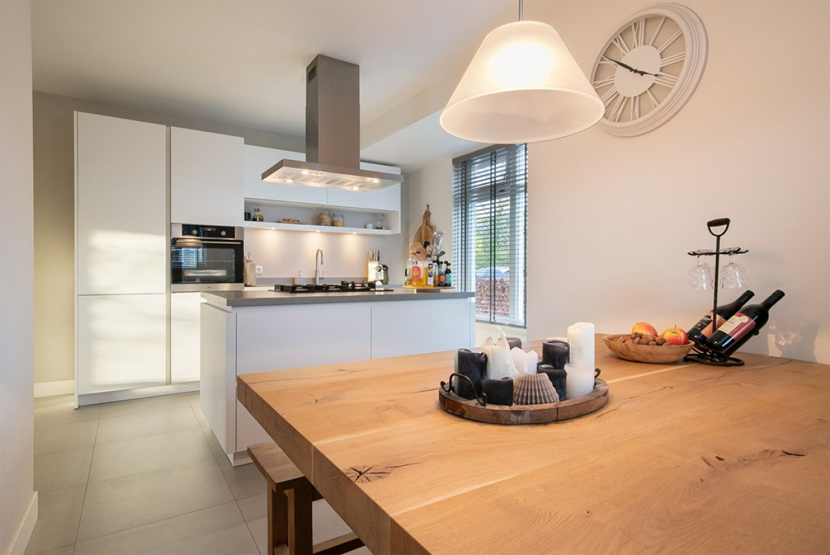 Aan de voorkant van de woning bevindt zich het keukengedeelte met voldoende ruimte voor een eethoek.
