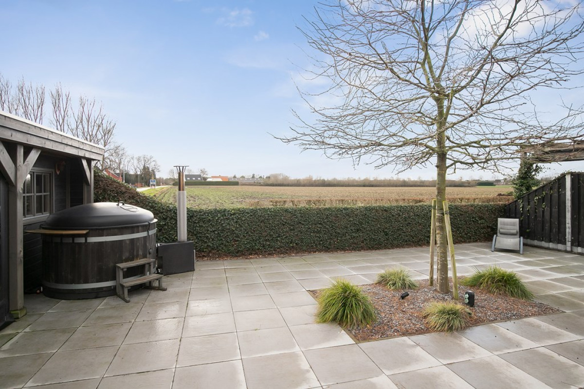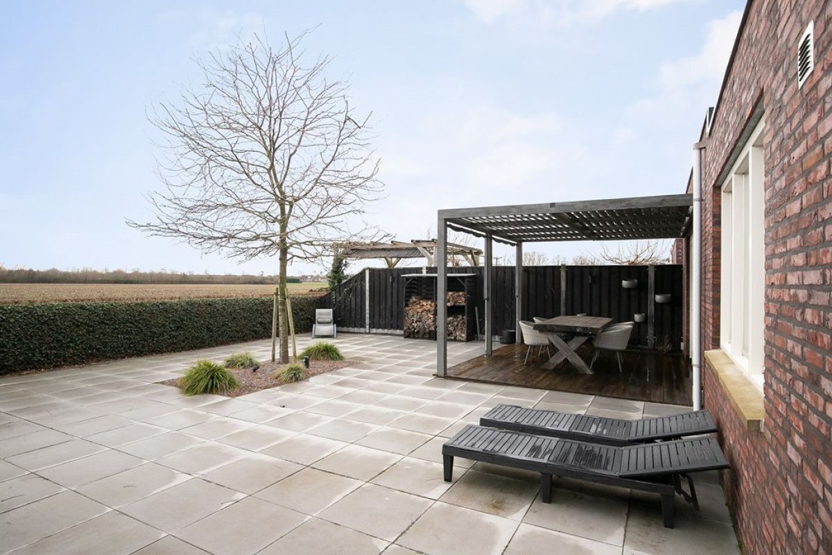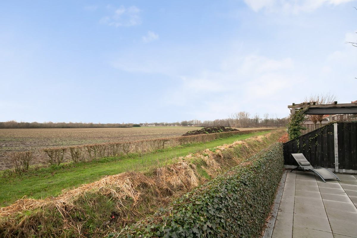 Het zitgedeelte is aan de achterkant van de woning en door de grote raampartij met openslaande tuindeuren heb je een mooi vrij uitzicht op de tuin en landerijen. Vanuit het zitgedeelte is de inpandige garage te bereiken.
