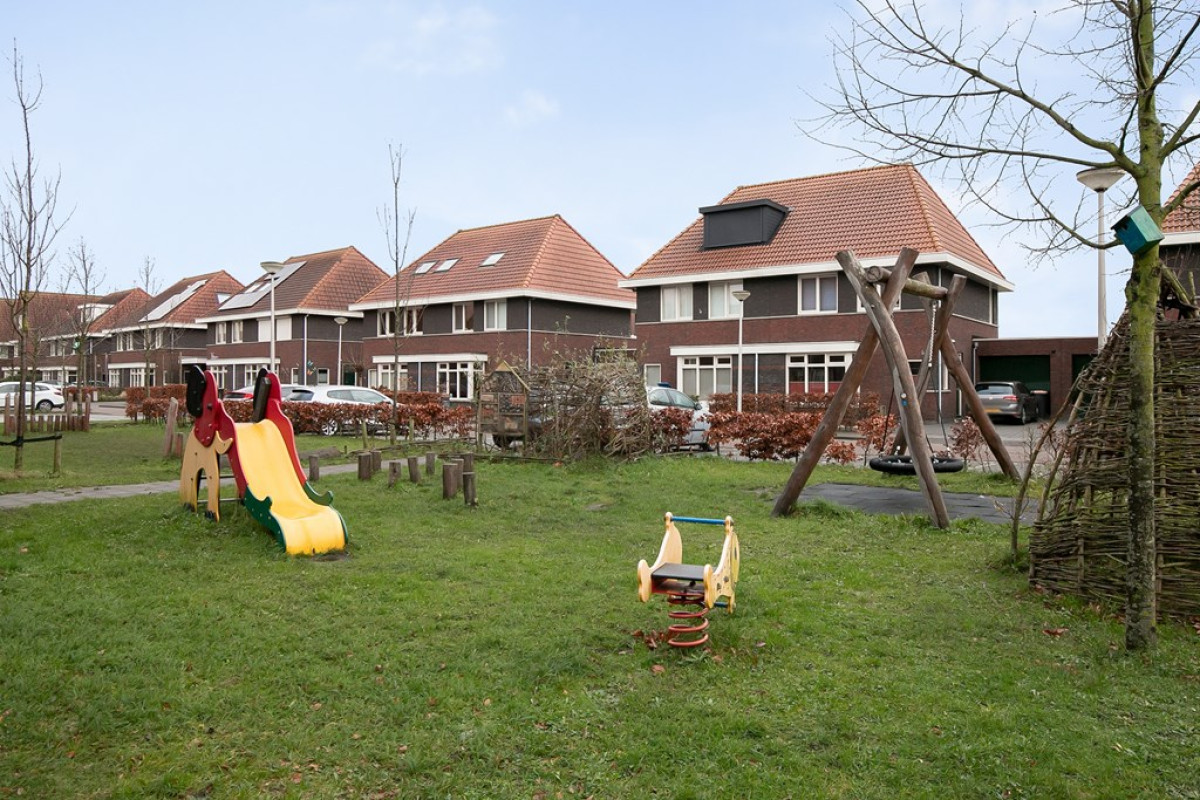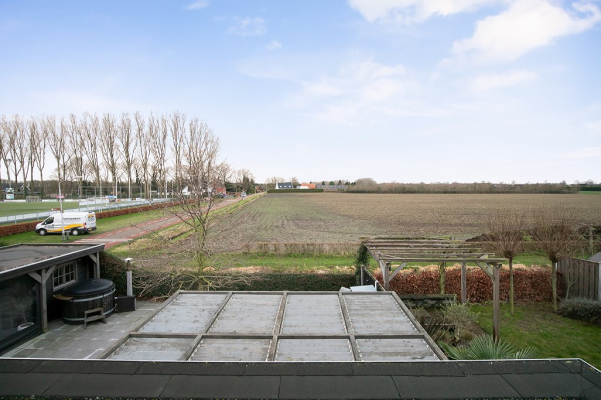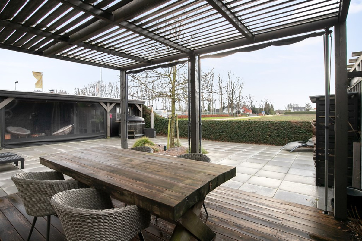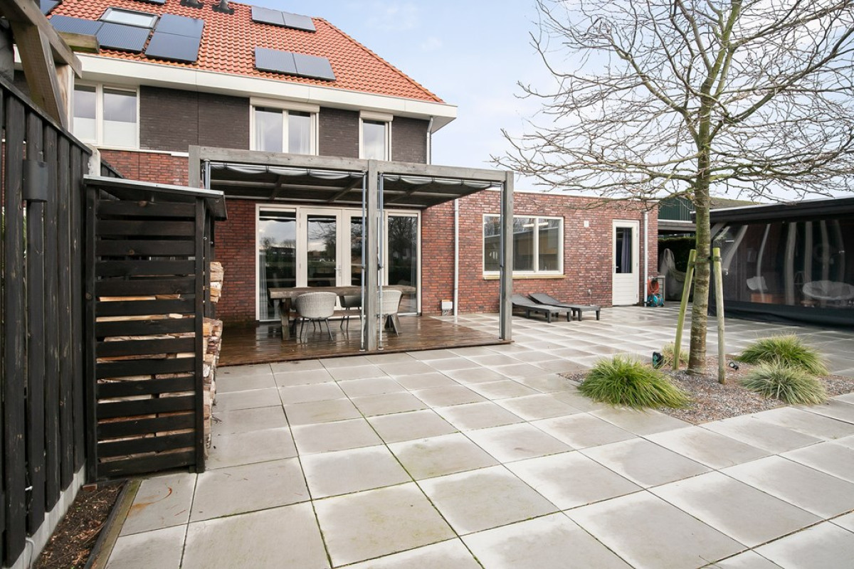 Het zitgedeelte is aan de achterkant van de woning en door de grote raampartij met openslaande tuindeuren heb je een mooi vrij uitzicht op de tuin en landerijen. Vanuit het zitgedeelte is de inpandige garage te bereiken.
