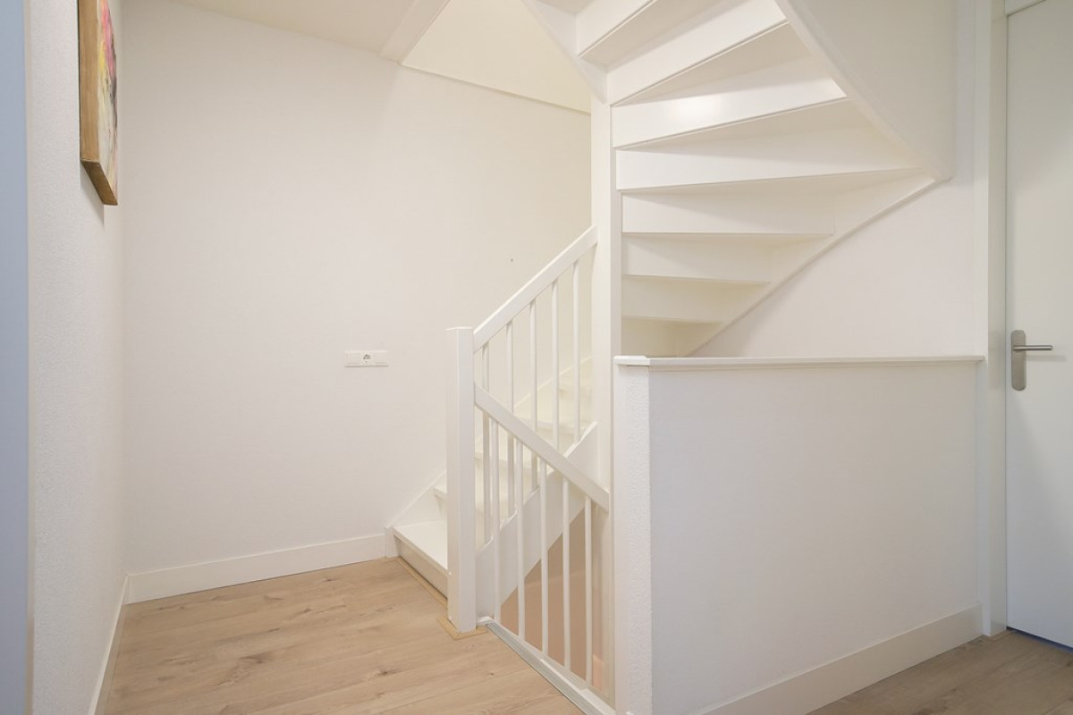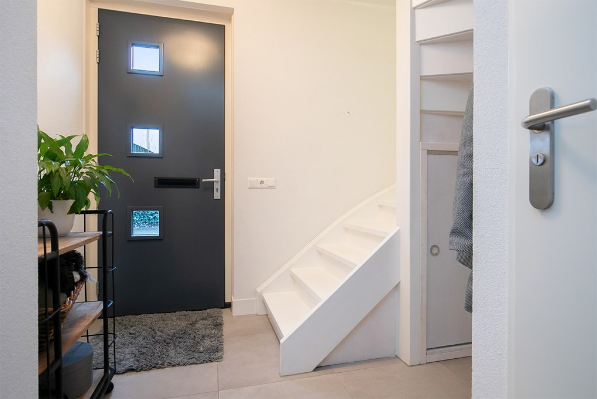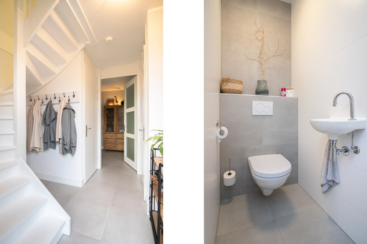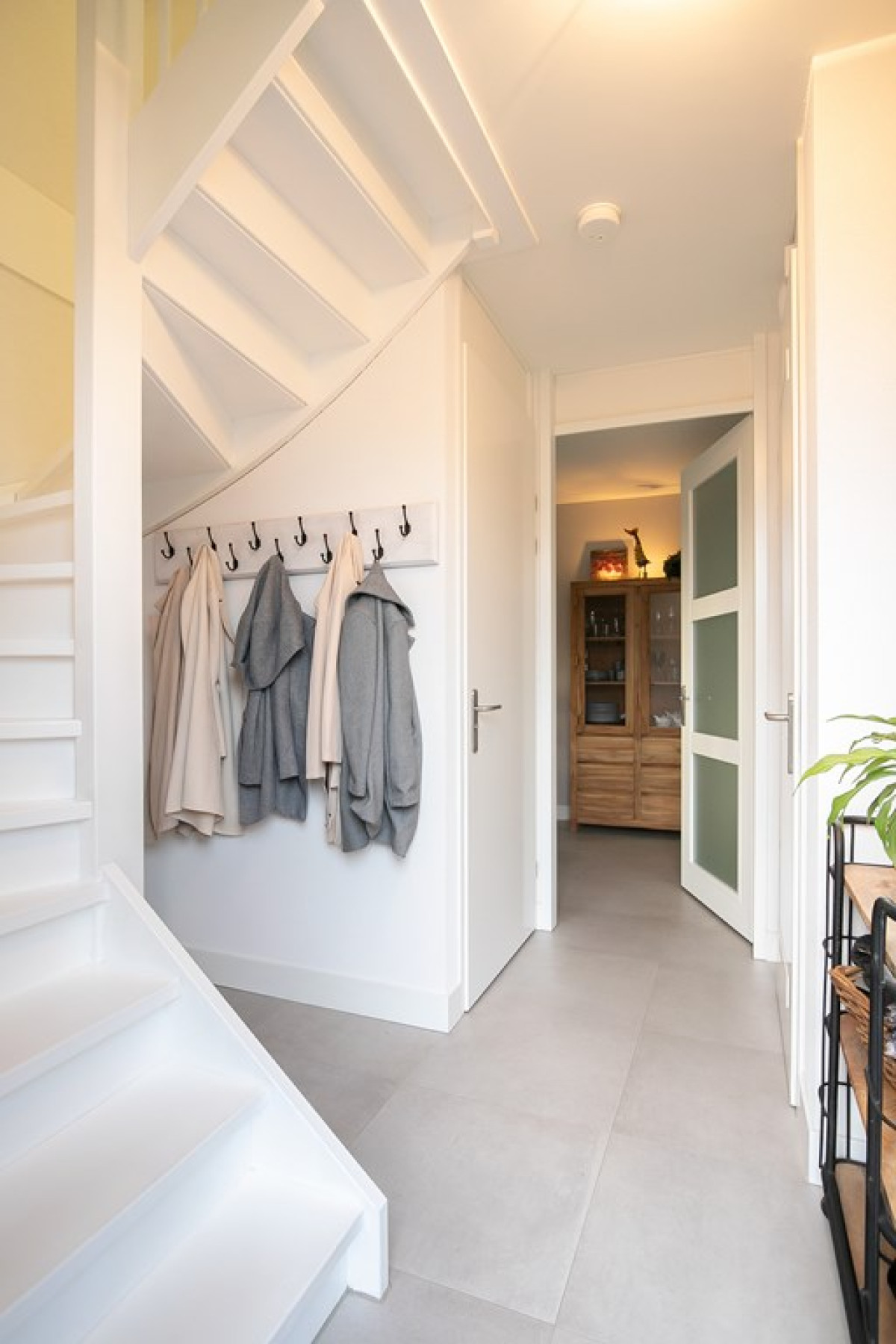 Na het openen van de voordeur stap je een lichte ruime hal binnen waar je naast een garderoberuimte ook de meterkast, trapopgang naar de eerste verdieping en het toilet kunt vinden.