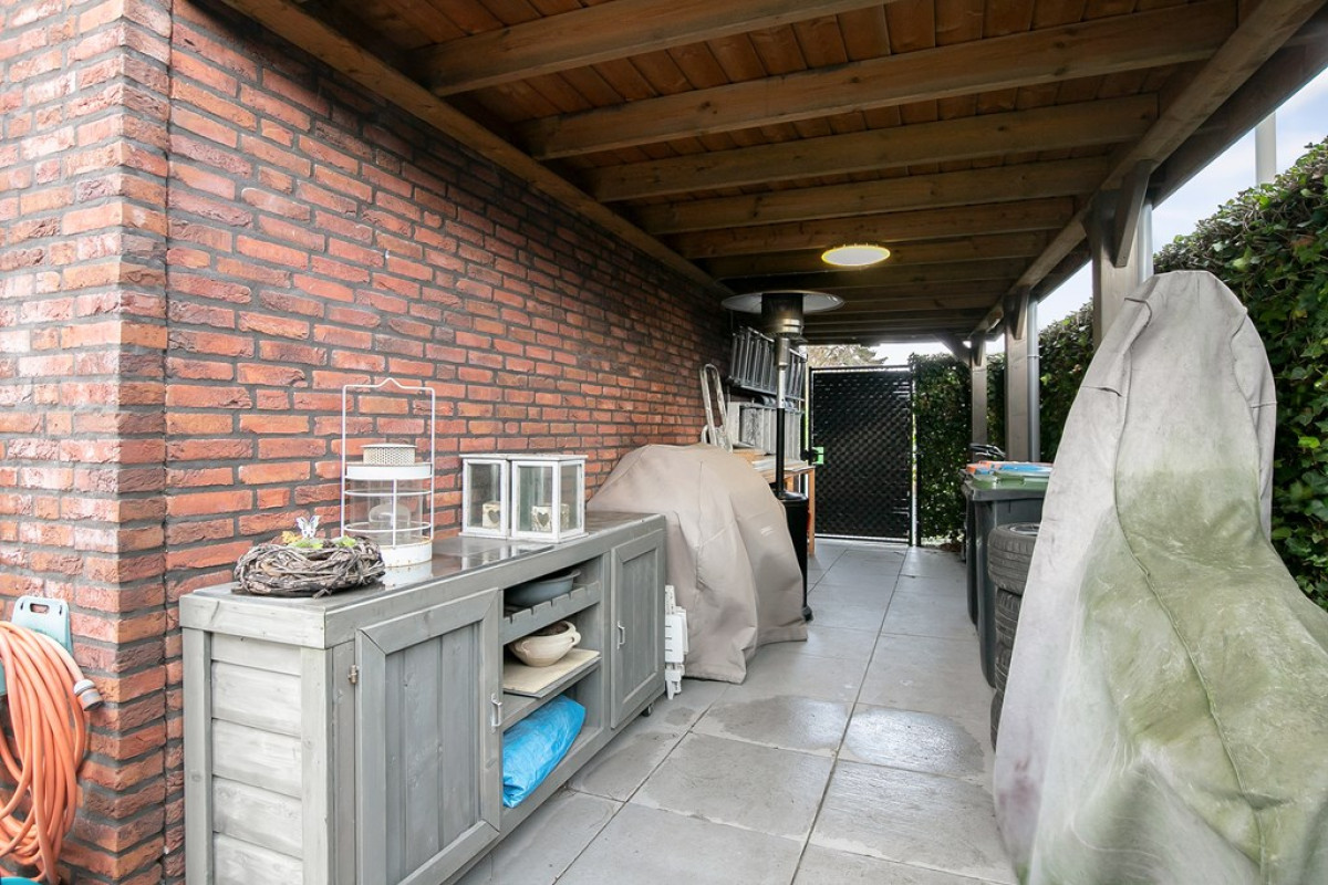 Aan de zijkant van de garage is nog een overkapping te vinden met een poort naar de oprit.