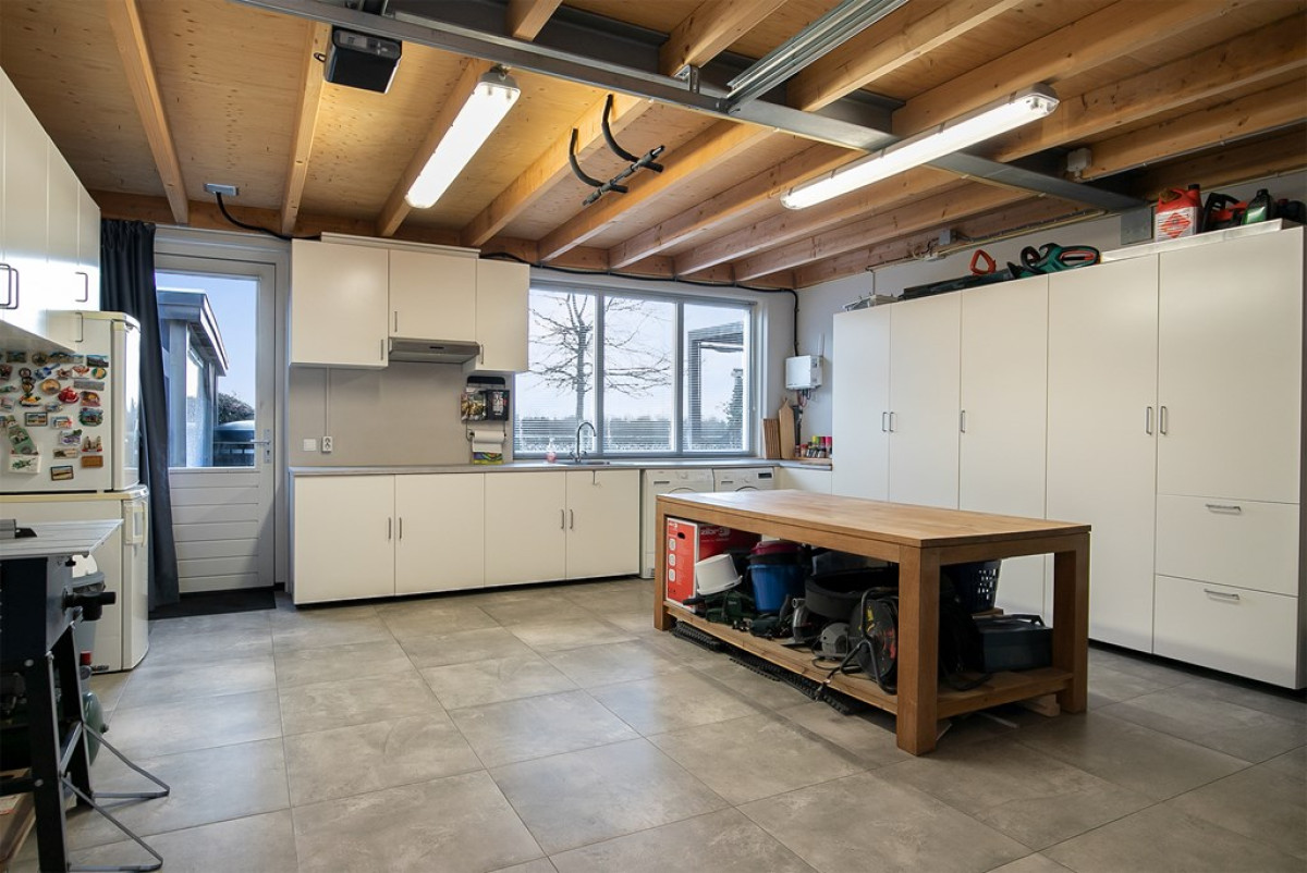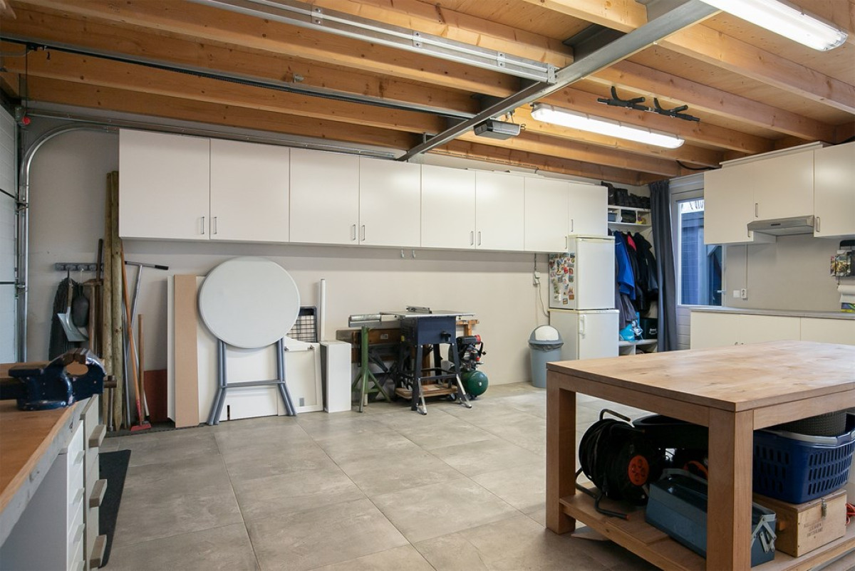 De garage van ruim 36m2 , met elektrische kanteldeur, wateraansluiting en afzuigkap, is vanuit de living te bereiken. Vanwege zijn formaat kan hij voor verschillende doeleinden gebruikt worden. De garage wordt momenteel o.a als wasruimte en hobbyruimte gebruikt. Via de loopdeur is de achtertuin te bereiken.