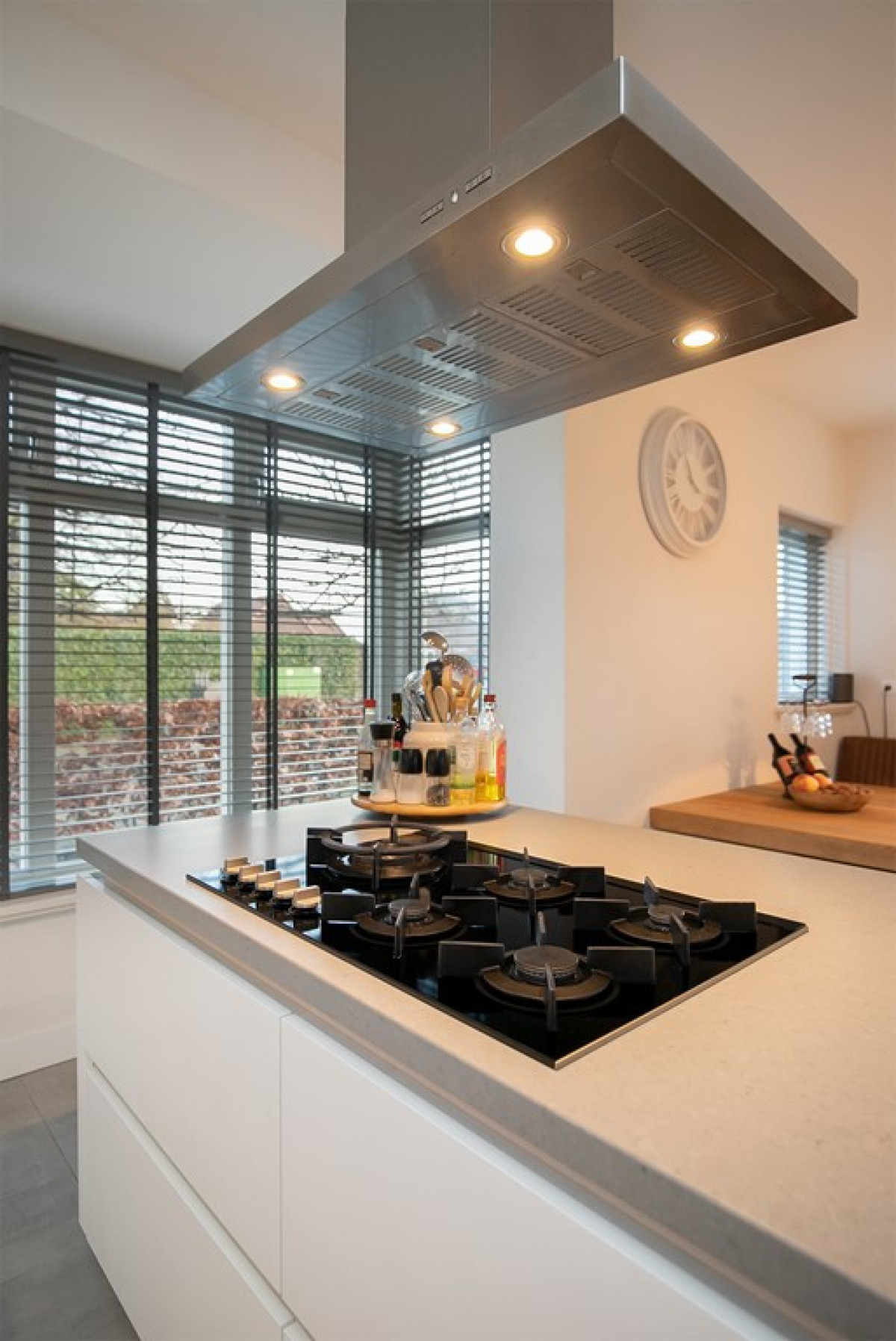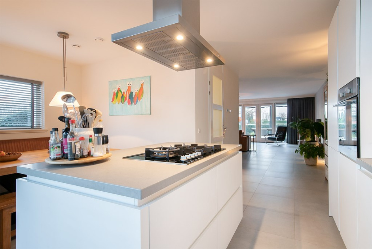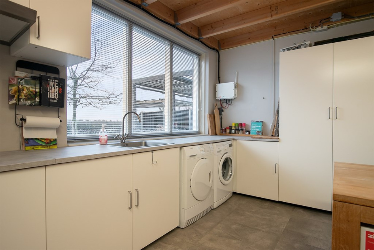 De moderne keuken is van alle luxe voorzien met een koelkast, aparte vriezer, vaatwasser, heteluchtoven quooker en een kookeiland met gaskookplaat, afzuigkap en aan beiden zijden opbergruimte. Zie jij jezelf al staan te kokkerellen in deze mooie keuken?
