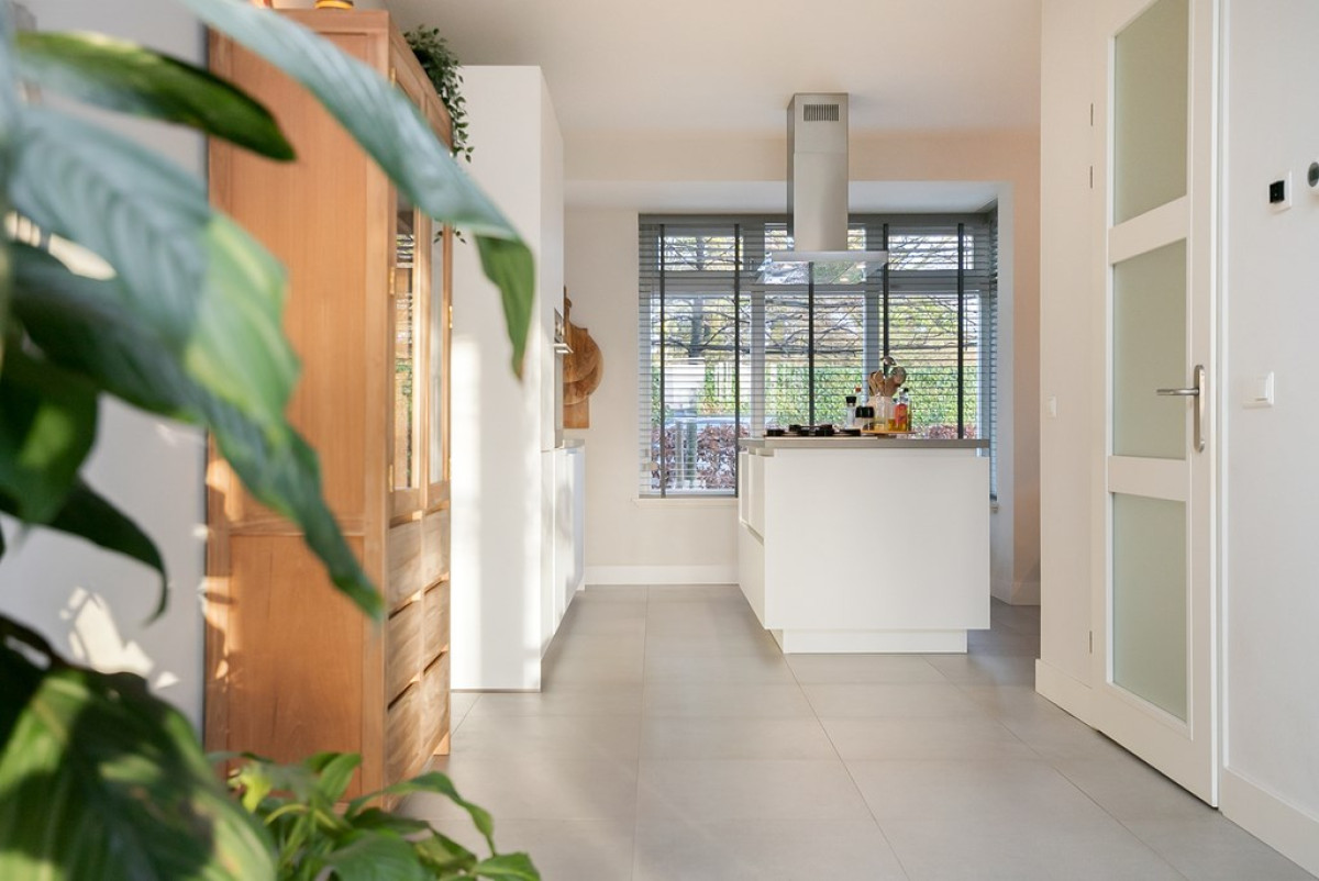 Op de gehele begane grond ligt een mooie lichte tegelvloer met vloerverwarming.