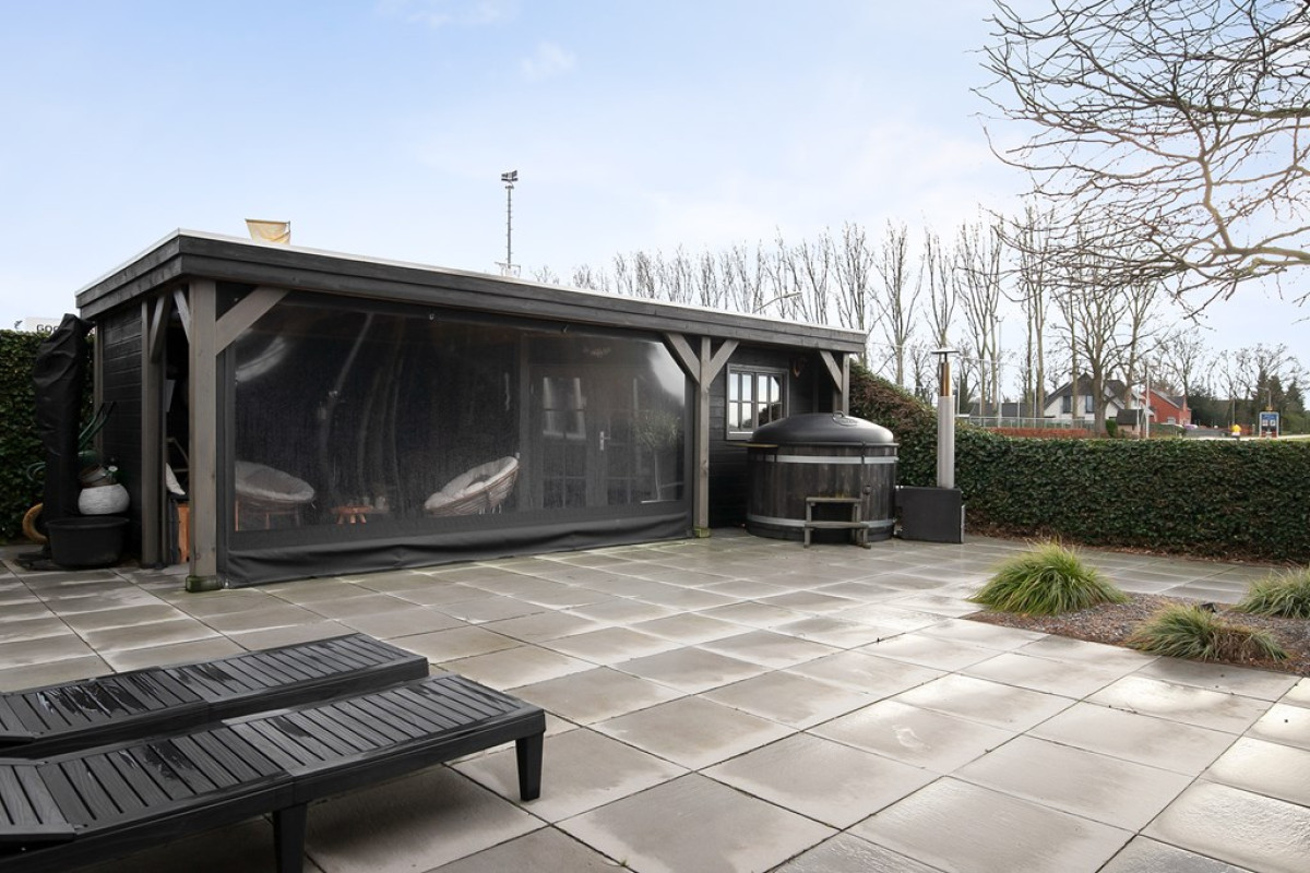 Vanuit de veranda is het knusse en sfeervolle tuinhuis te bereiken.