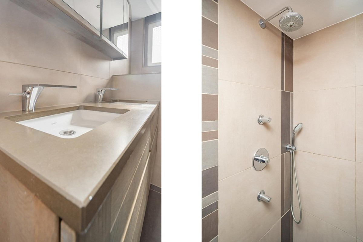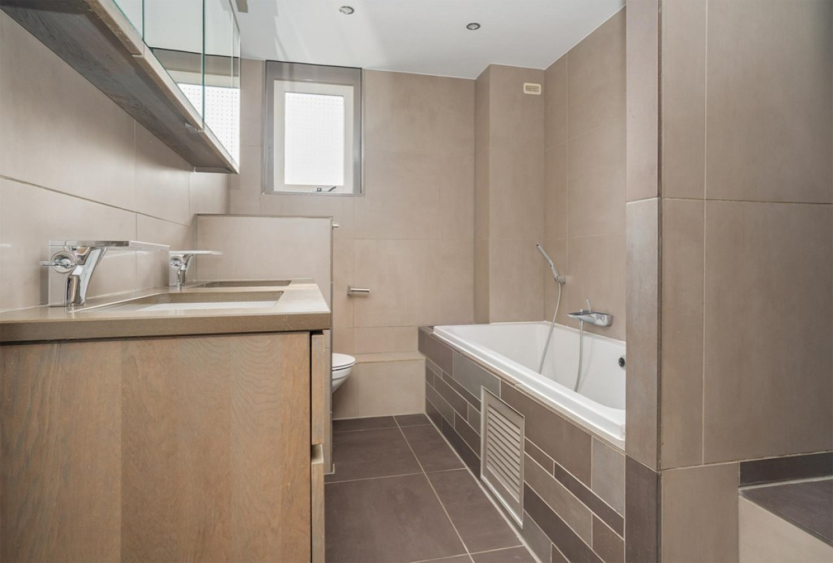 De badkamer is behalve compleet ook zeer smaakvol gestileerd. Zo is alles in rustgevende bruin/grijs tinten betegeld en beschik je over een riant ligbad, inloopdouche, zwevend toilet en een dubbele wastafel.