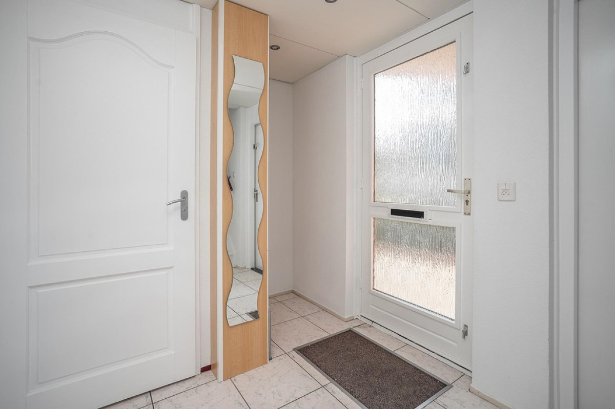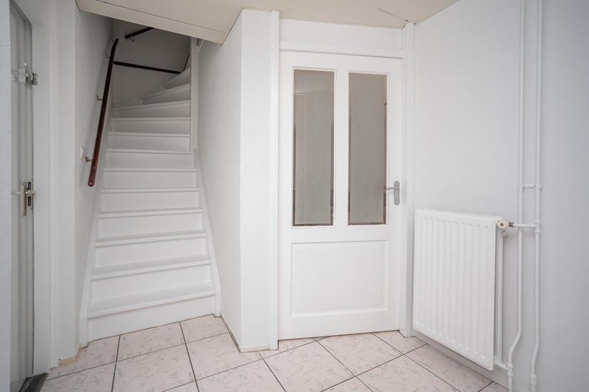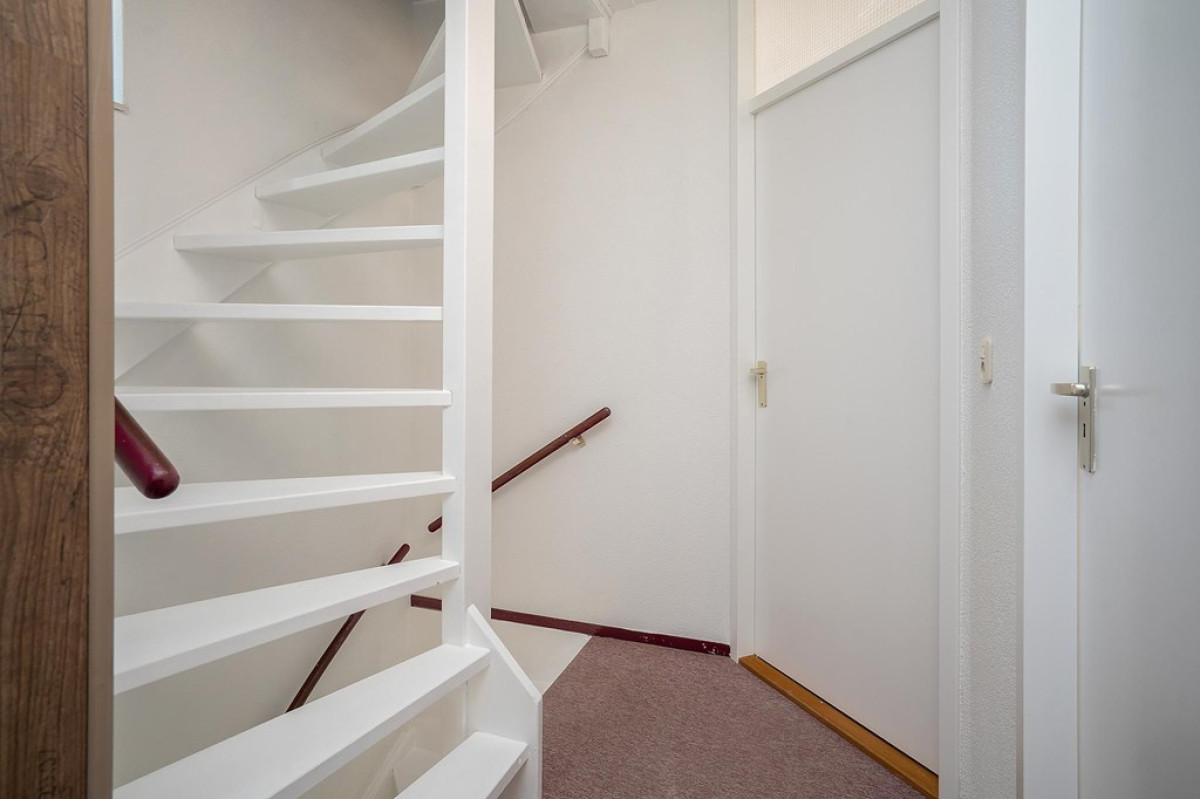 Zodra je aan komt lopen vallen direct de speelse rode garagedeur en idem raamkozijnen op. Eenmaal binnen kom je uit op een lichte hal, waar je behalve de meterkast het toilet vindt, de trap naar boven, de deur naar de garage en die naar de woonkamer.