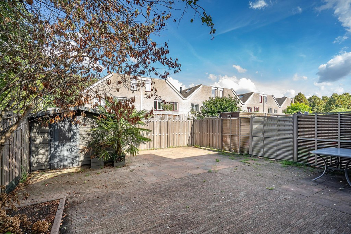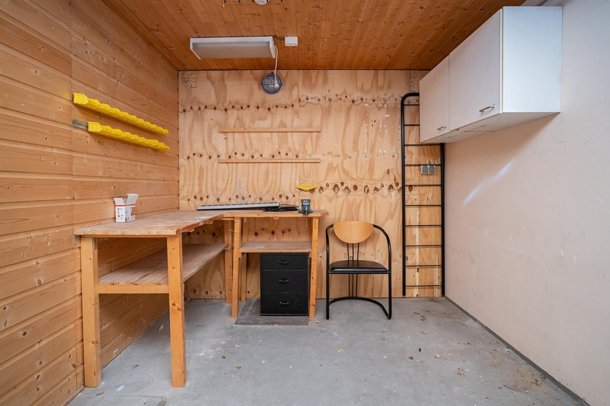 De achtertuin bestaat vooral uit vakkundig straat- en tegelwerk, met linksachterin nog een handige houten berging om bijvoorbeeld je fiets(en) en/of tuinspullen in op te bergen. Al is deze ook van eigen stroompunten voorzien, waardoor er met hetzelfde gemak een mooie werkplaats van te maken is.