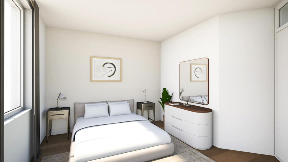 Aan de achterzijde leidt een dubbele schuifdeur naar een slaapkamer op de begane grond. Voorzien van een enkel raam uitkijkend over de achtertuin, wordt de kamer vooral licht gehouden door een luxe skylight in het plafond.