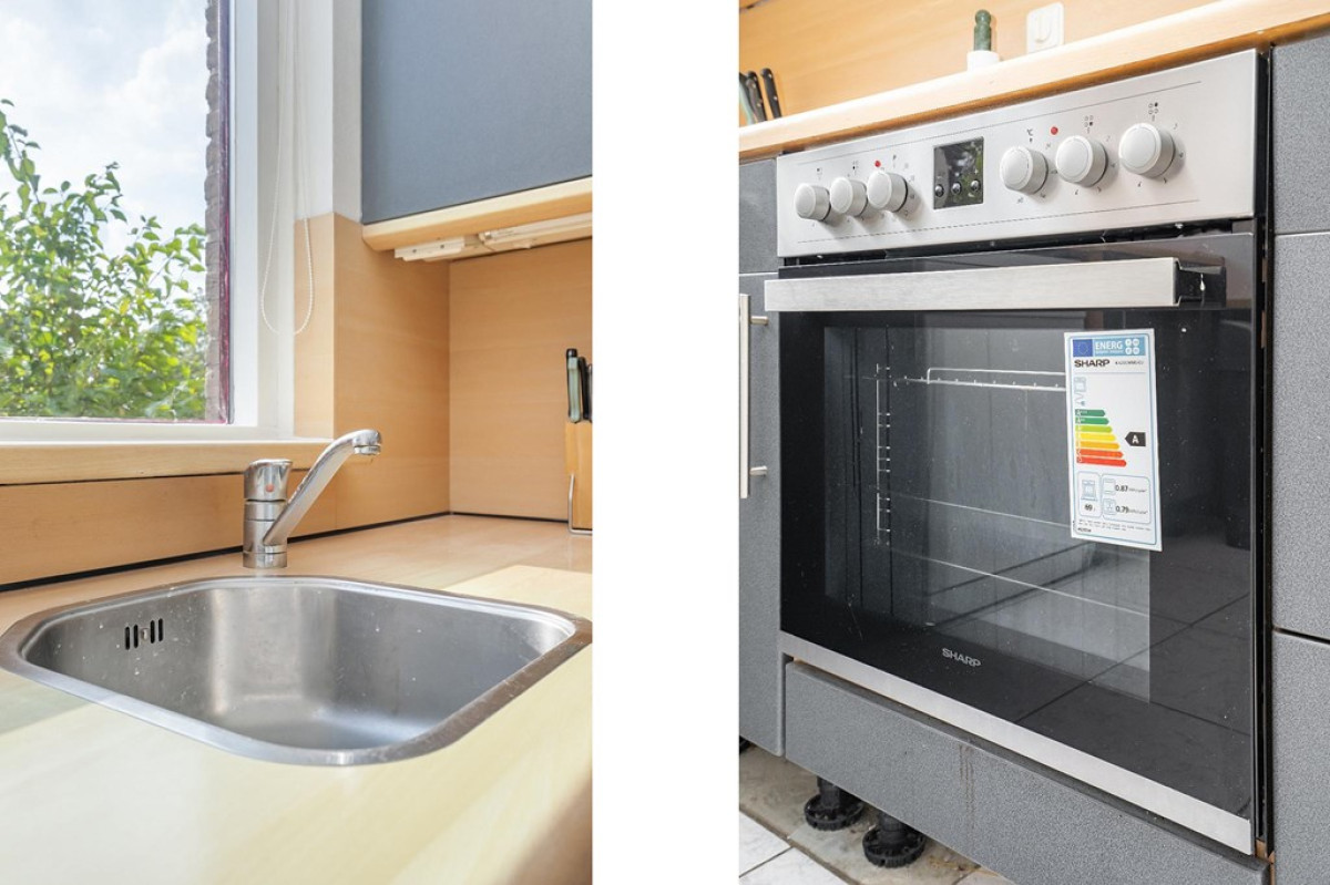 De keuken bevindt zich aan de voorzijde van de woning, met ramen uitkijkend op het zuidwesten is het hier vooral na het middaguur heerlijk zonnig koken. Ook ben je van alle gemakken voorzien met een inductiekookplaat, heteluchtoven, French Door koel/vriescombinatie, vaatwasser en een afzuigkap. Dit alles rondom/achter strakke grijze deurtjes en een aanrecht met houtprint.