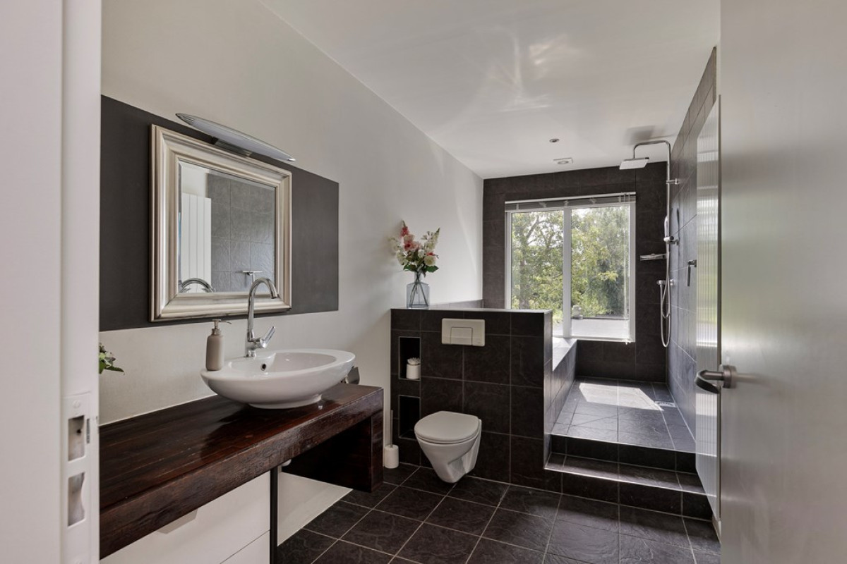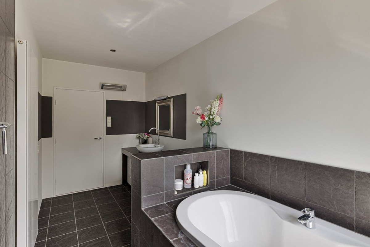 De badkamer is niet alleen stijlvol, maar ook heel praktisch ingedeeld met een extra ruim ligbad, aparte inloopdouche, wastafelmeubel en toilet. Je bent hier van alle gemakken voorzien. Zie jij jezelf hier al ontspannen in een warm bad of genieten van een heerlijke douche?