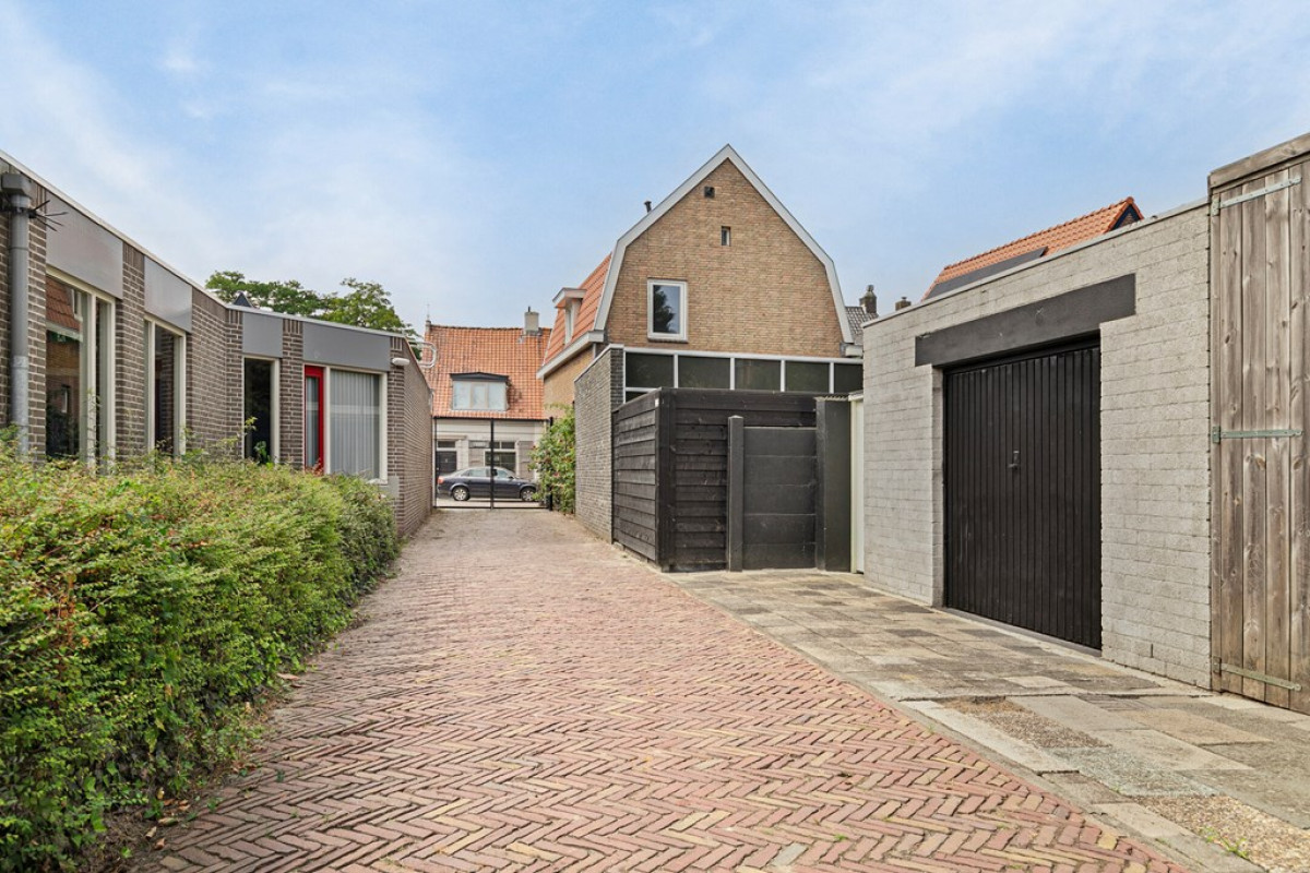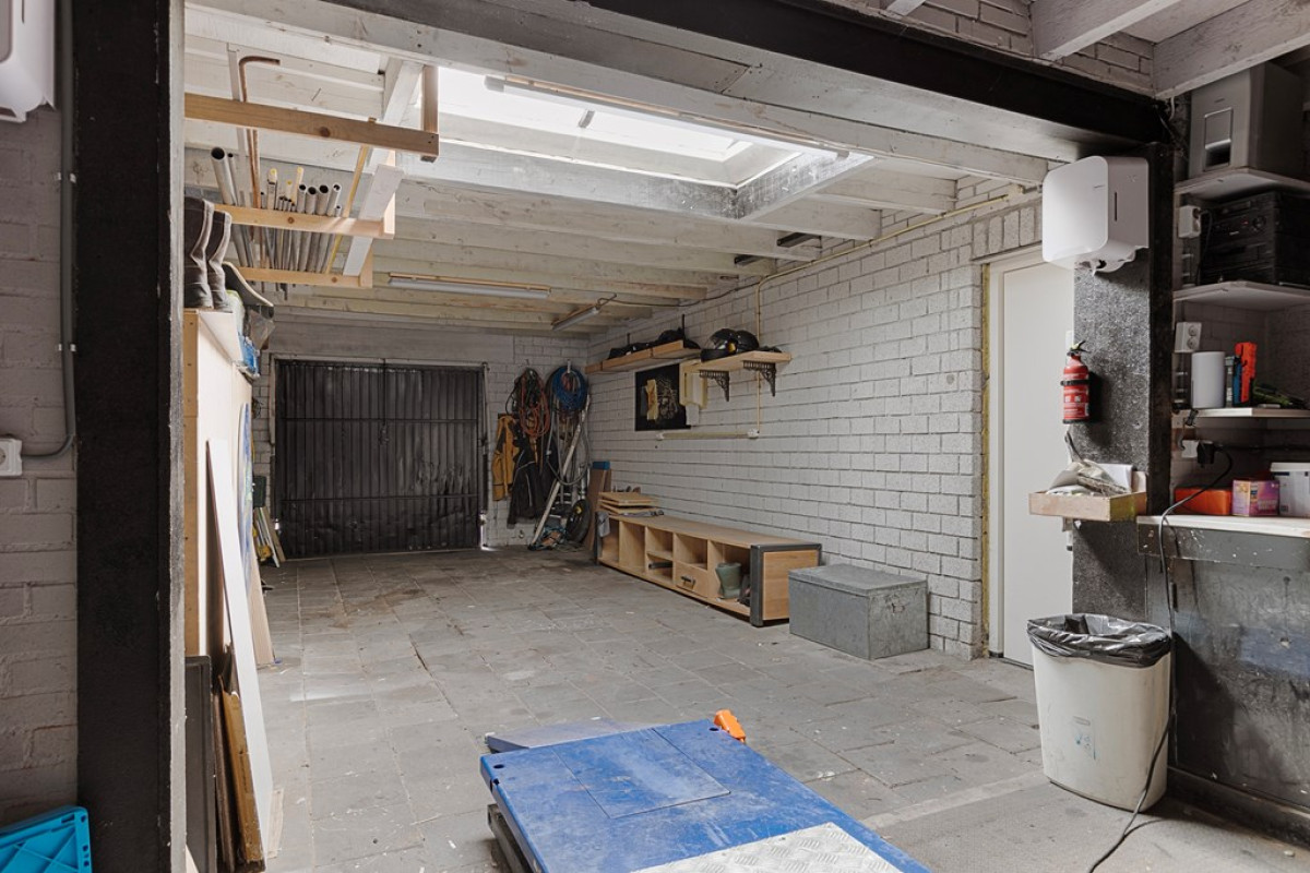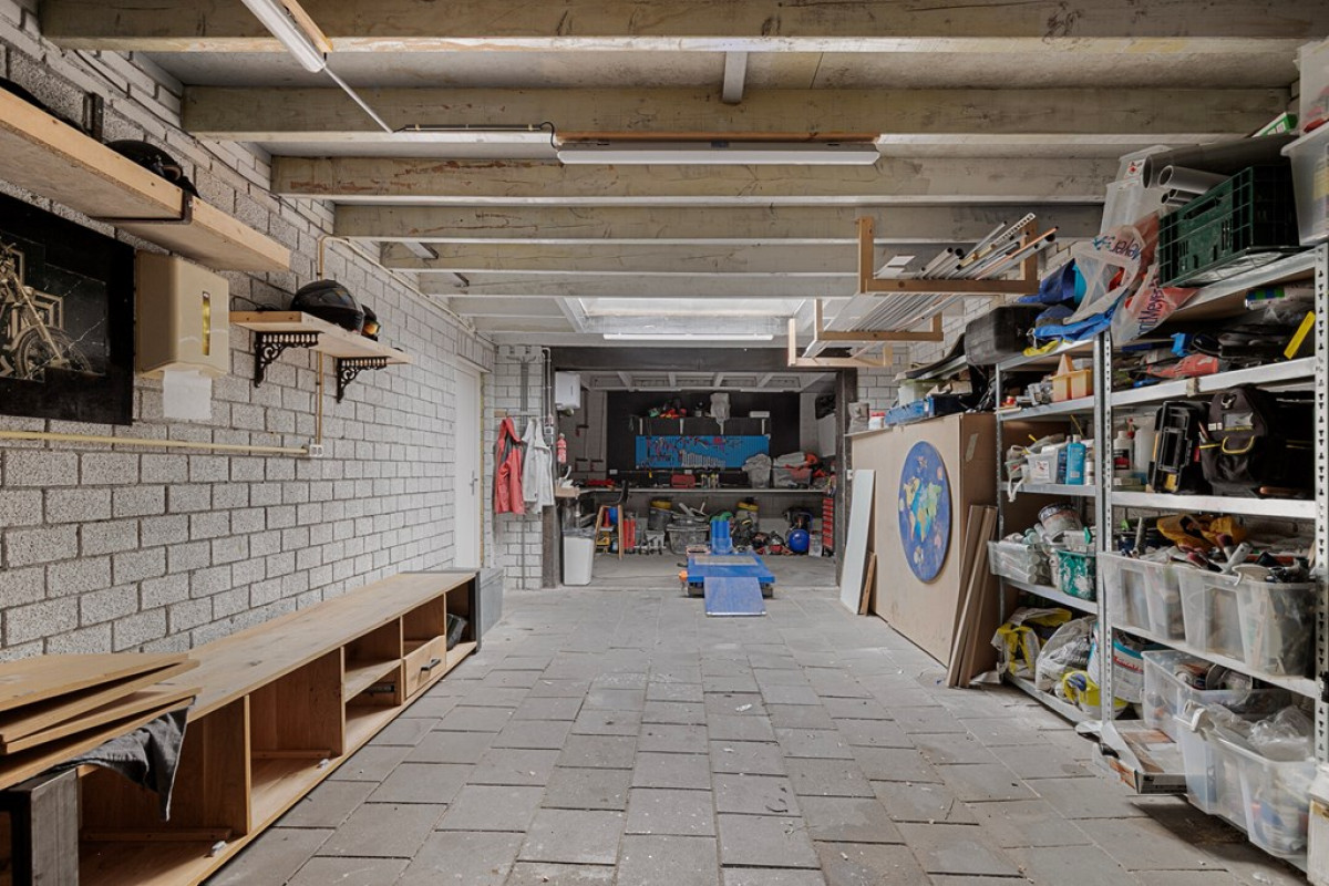 Achterin de tuin bevindt zich de ruim 10 meter diepe garage/werkplaats met aangrenzend een privé parkeerplaats.