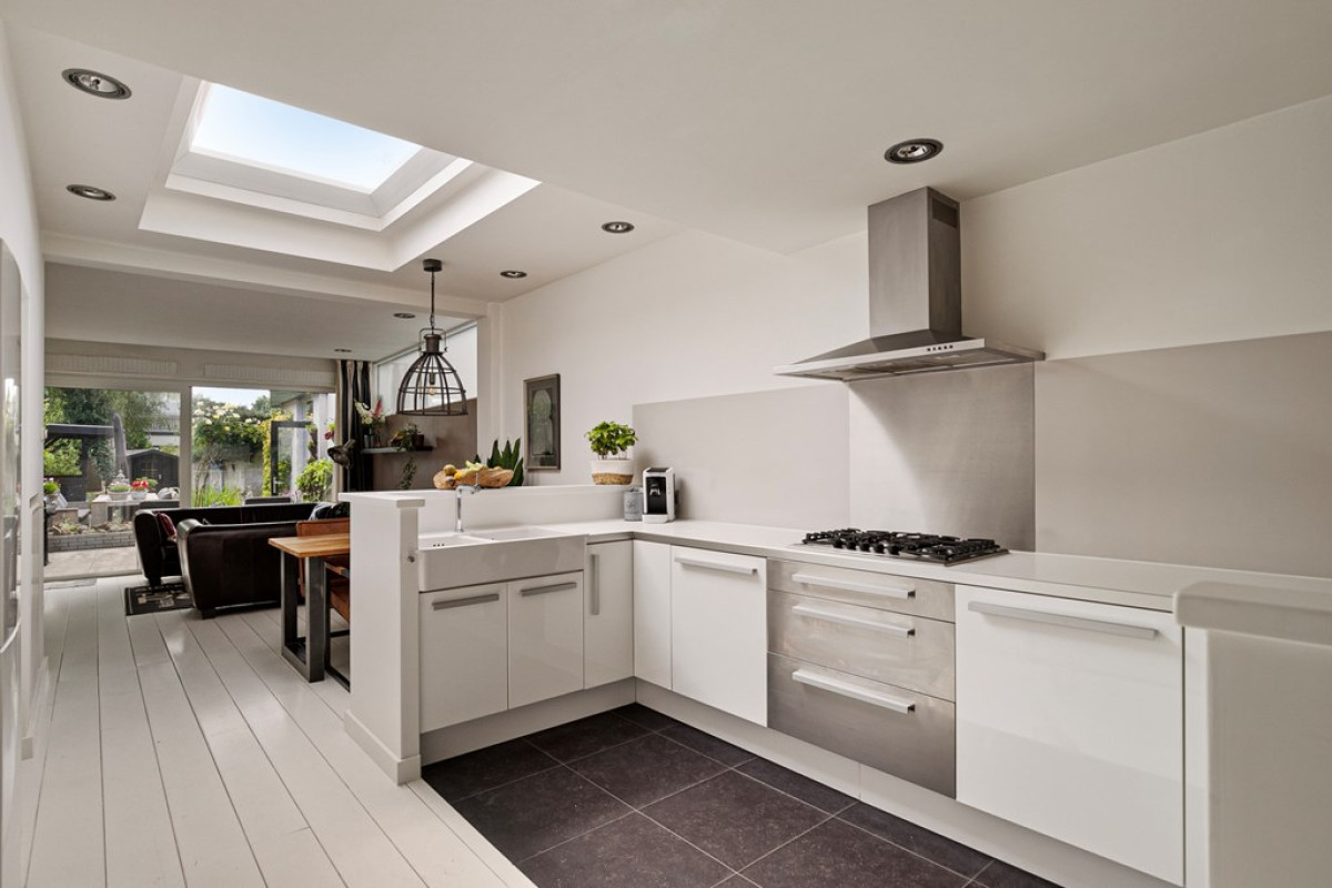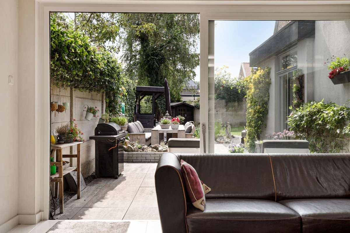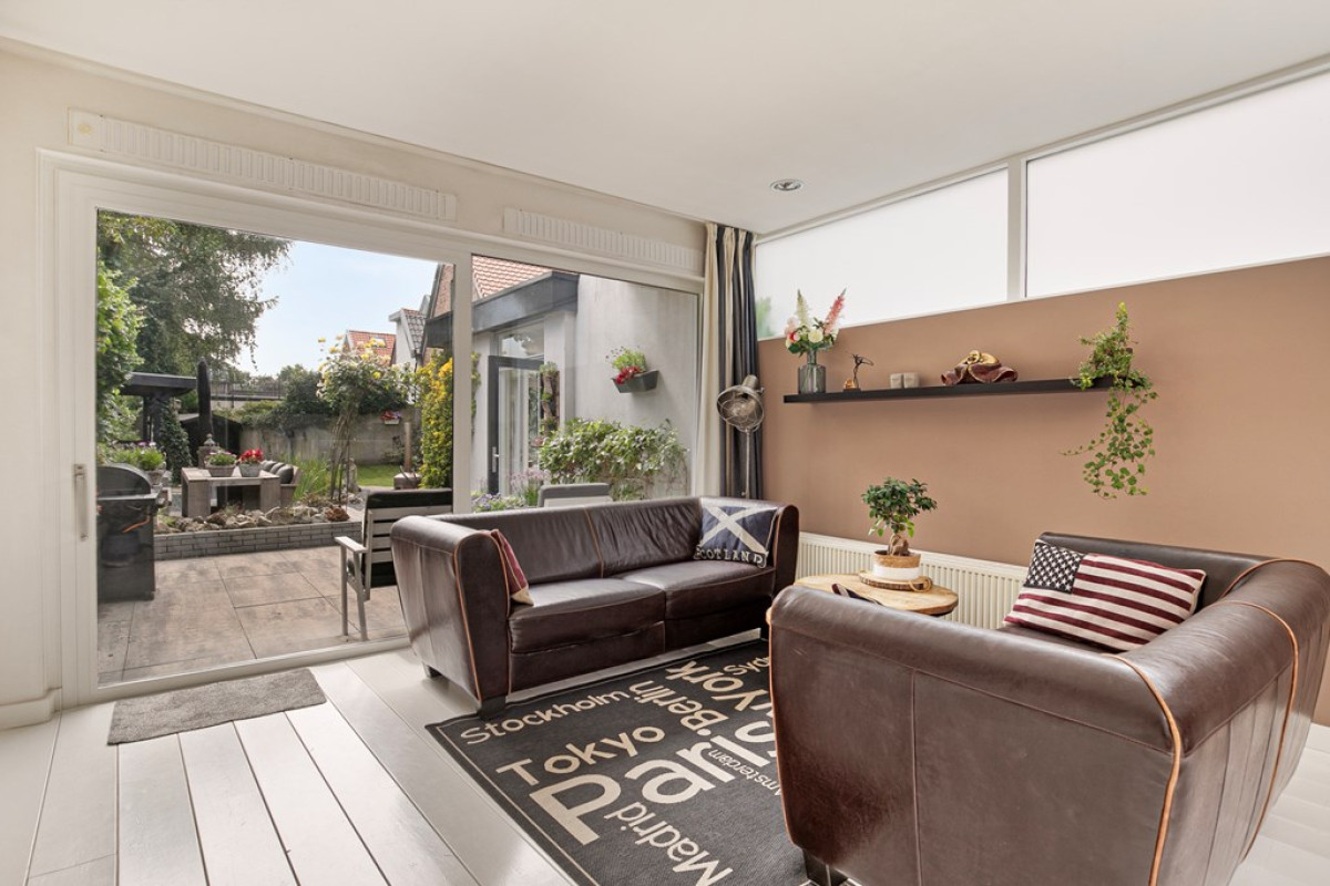 Het voorraam en het zijraam aan de straatkant, de sfeervolle ramen bij het lounge gedeelte, de lichtkoepel en het bovenlicht in de aanbouw en de grote schuifpui aan de tuinzijde, zorgen voor een fijne lichtinval.