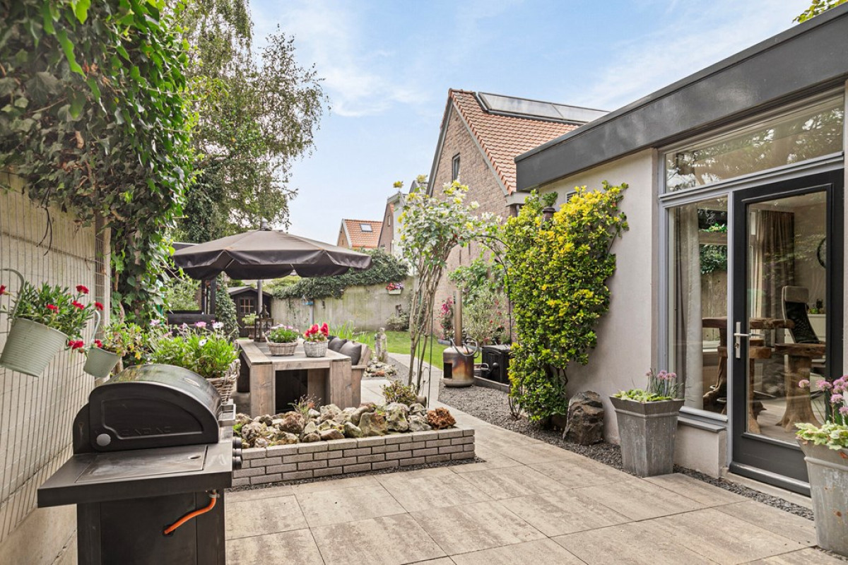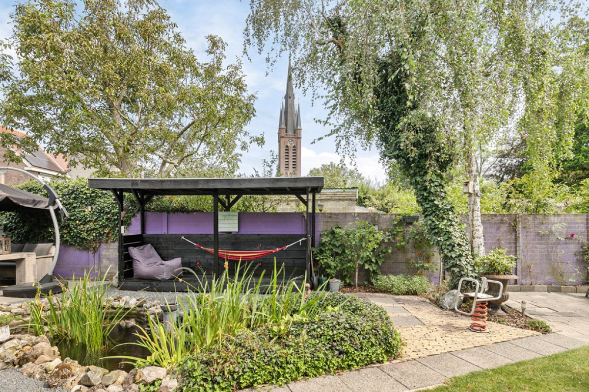De tuin die op het zuiden ligt, is werkelijk een paradijs! Met zijn mooie terrassen, vijver, loungeruimte en schitterende bloemen en planten, kun je hier altijd wel een fijn plekje vinden om heerlijk te kunnen vertoeven. Deze prachtige achtertuin biedt bovendien veel privacy en uitzicht op de Sint-Martinuskerk. In deze tuin is het genieten met een grote “G”!