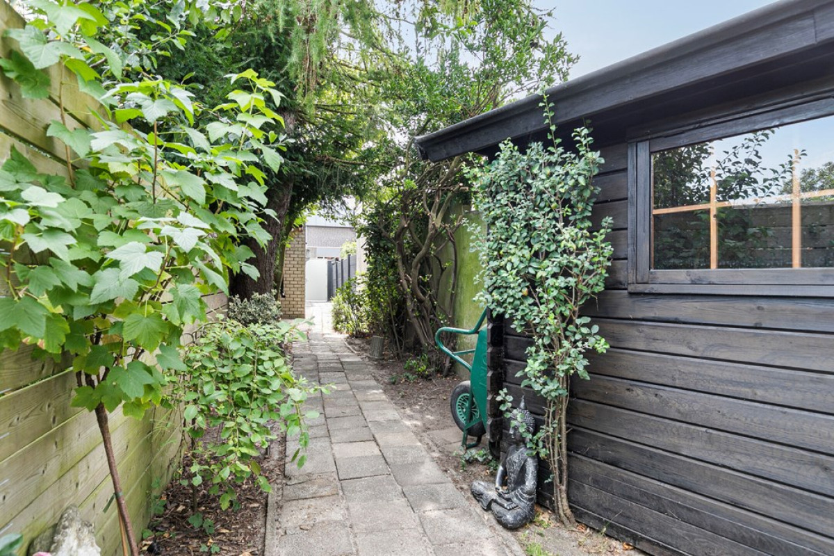 In de achtertuin is een tuinhuis aanwezig, deze wordt momenteel gebruikt voor al het tuingereedschap.