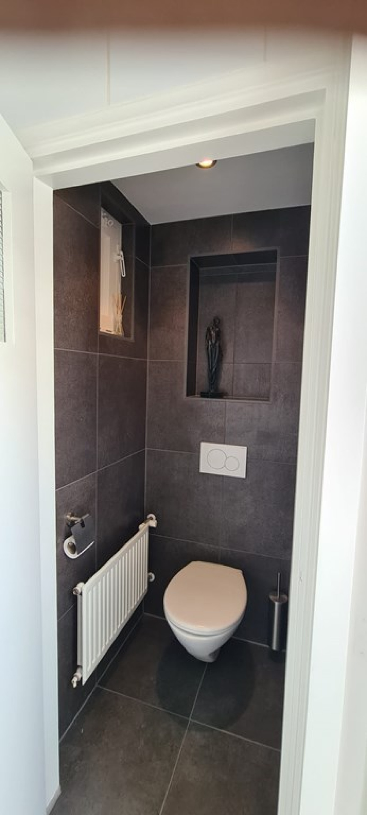 De muren in de badkamer zijn deels betegeld. De rest van de muren op deze verdieping zijn net als beneden bekleed met strak stucwerk.