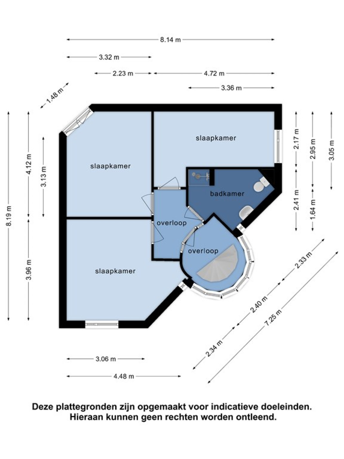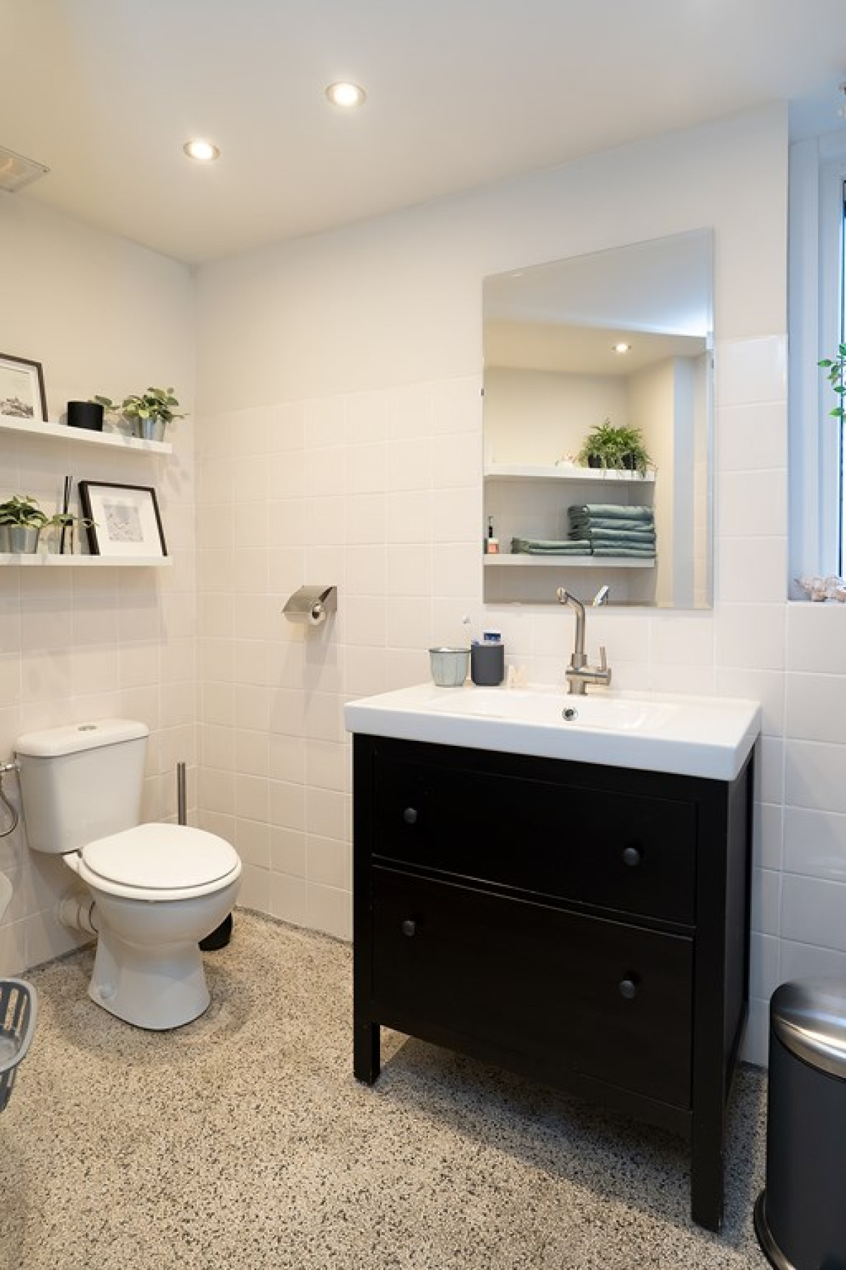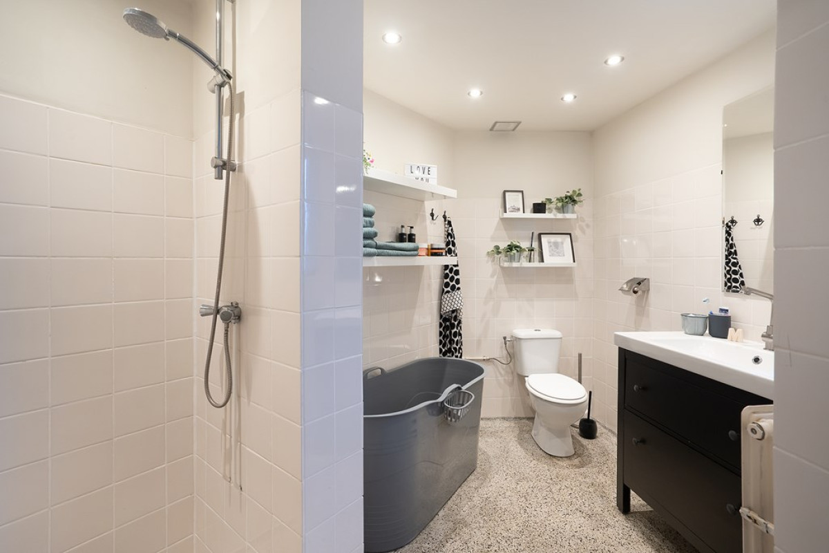 Op de bovenste verdieping bevinden zich de drie slaapkamers en een verzorgde badkamer. Elke slaapkamer biedt voldoende ruimte en de mogelijkheid om deze naar eigen smaak in te richten. De badkamer, uitgerust met een lichte vloer en crèmekleurige wandtegels, beschikt over een vast toilet, een wastafelmeubel en een douchecabine.