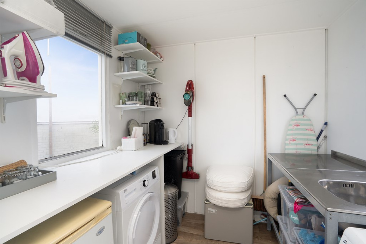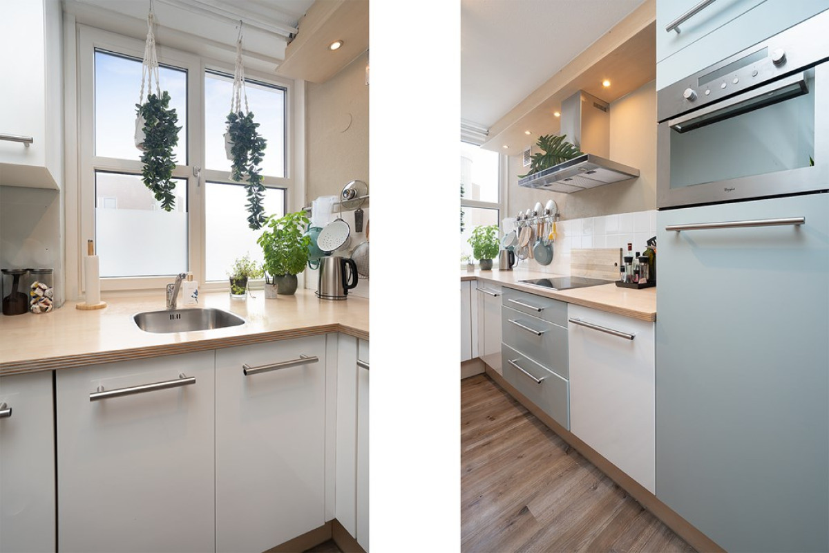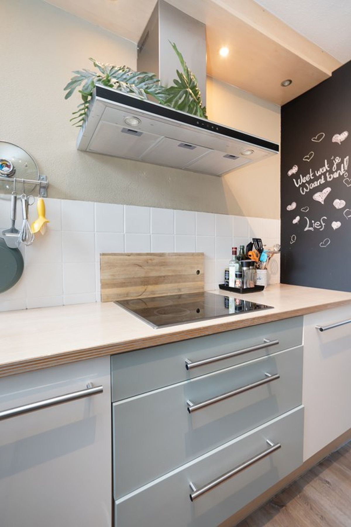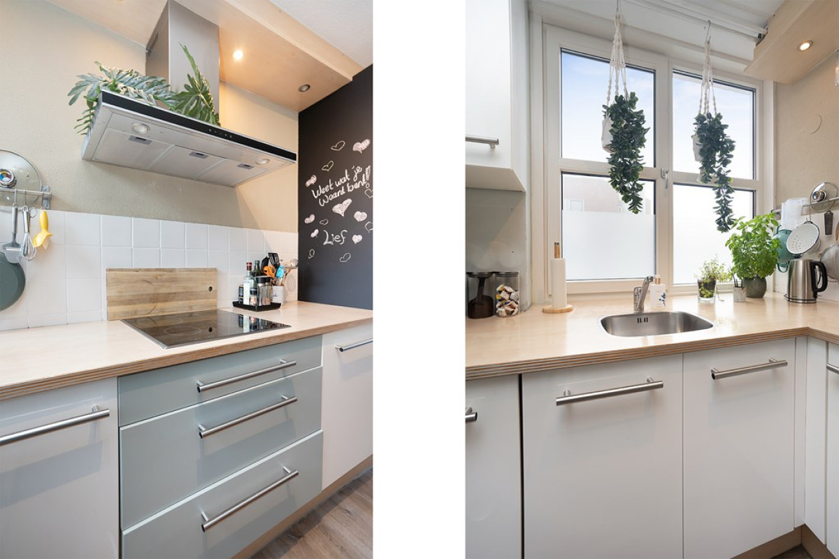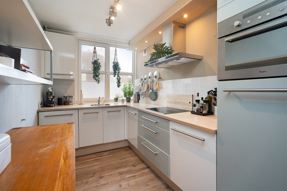 Deze keuken zelf is een droom voor iedere thuis kok: witte keukenkasten, chromen handvatten, een licht keukenblad en voorzien van alle moderne apparatuur zoals een inductiekookplaat en een inbouwoven van Whirlpool.