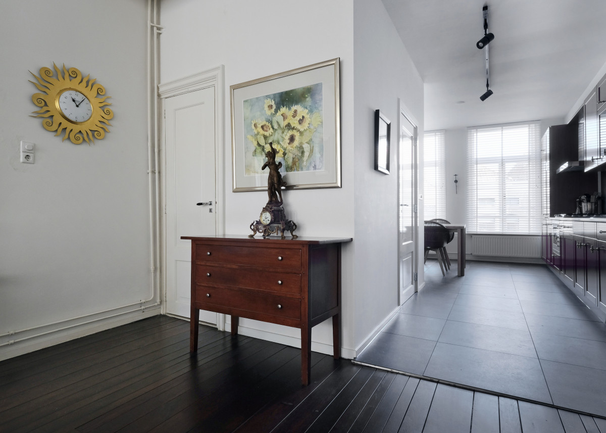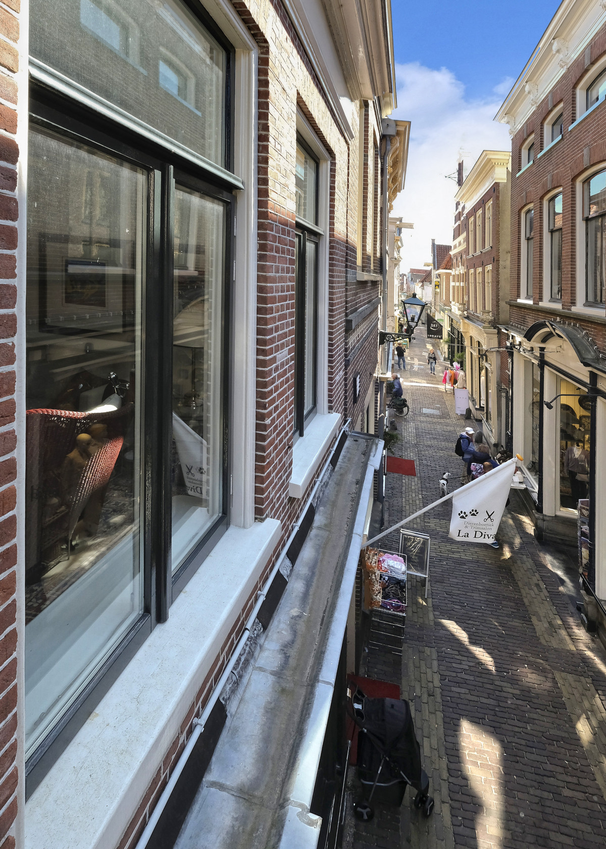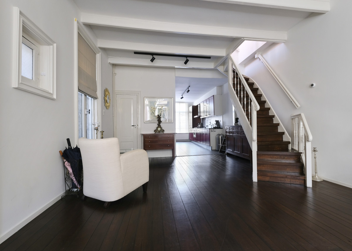 U komt binnen in de woonkamer met aan de voorzijde een fraaie grote raampartij. Hier moet u gewoon even zitten en genieten. Het uitzicht vanuit hier is formidabel. U wandelt zo naar het Waagplein of de binnenstad van Alkmaar. Een kopje koffie is helemaal zo gehaald als u de voordeur uitwandelt.