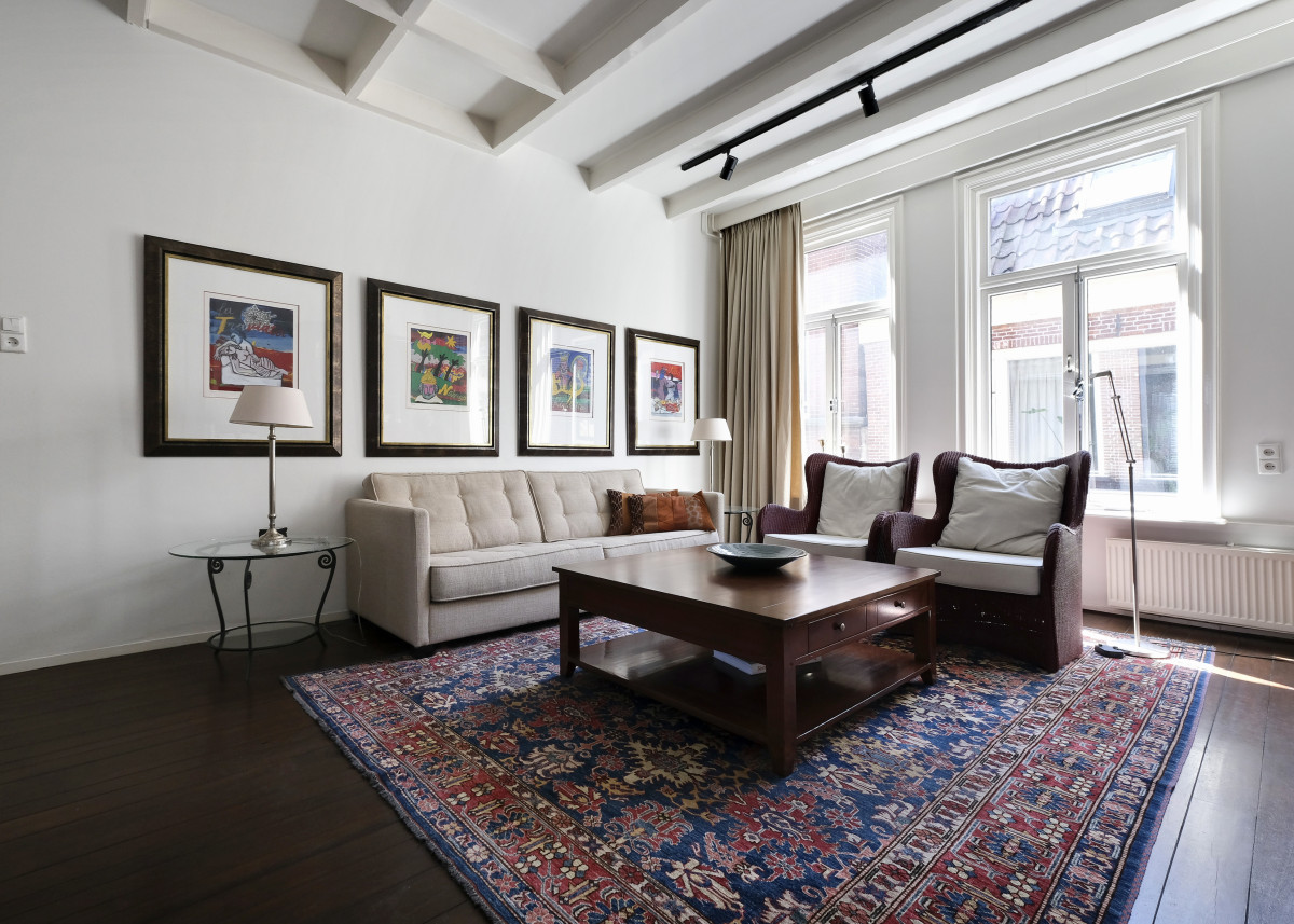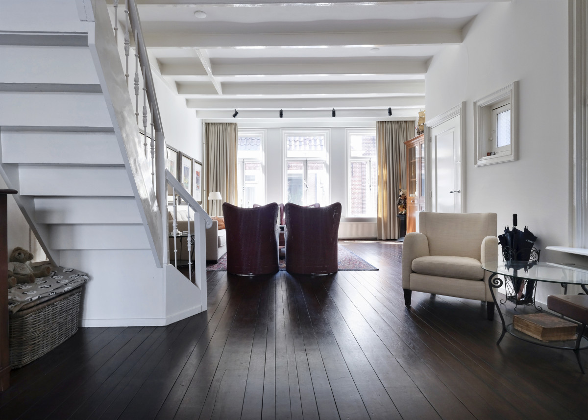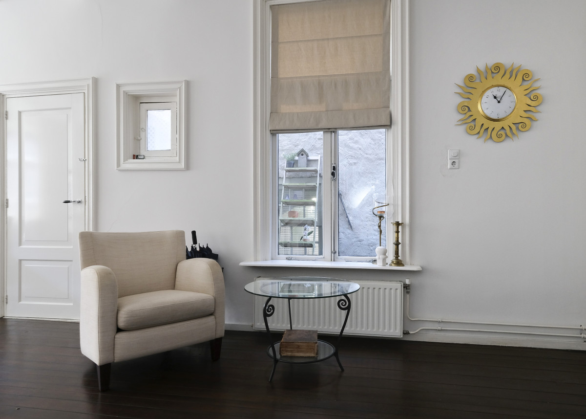 U komt binnen in de woonkamer met aan de voorzijde een fraaie grote raampartij. Hier moet u gewoon even zitten en genieten. Het uitzicht vanuit hier is formidabel. U wandelt zo naar het Waagplein of de binnenstad van Alkmaar. Een kopje koffie is helemaal zo gehaald als u de voordeur uitwandelt.