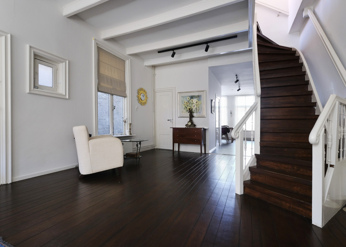 In de woonkamer ligt een nette houten vloer. En de wanden zijn licht afgewerkt. De hoge plafonds geven een ultiem gevoel van ruimte!