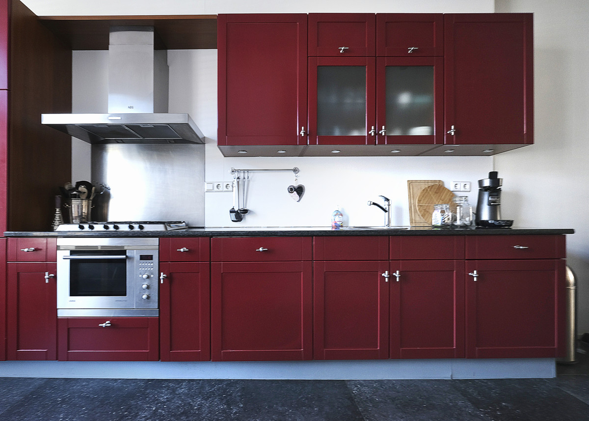 De keuken in lengte-opstelling heeft een warme rode kleur (eventueel overschilderbaar) en is van alle gemakken voorzien u heeft hier de beschikking over een vaatwasser, gaskookplaat, afzuigkap, koel-vriescombinatie en combi-magnetron. Ook