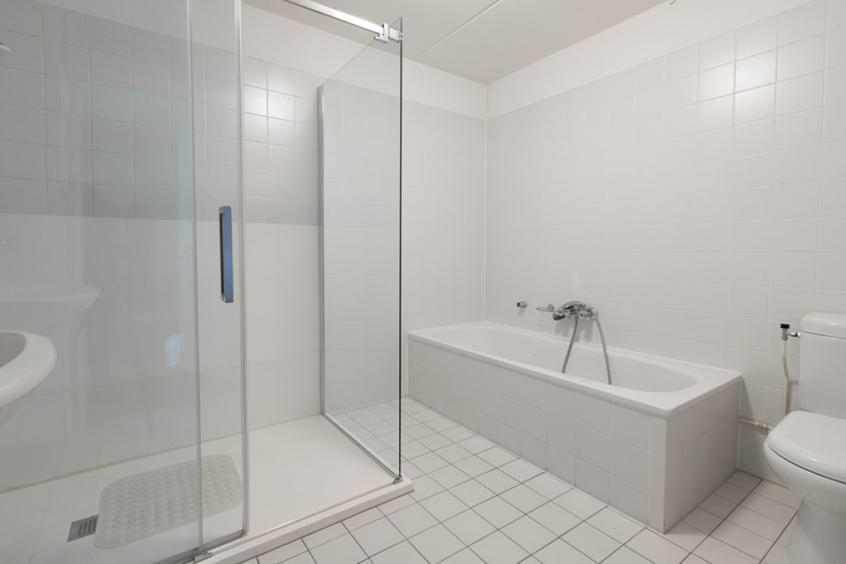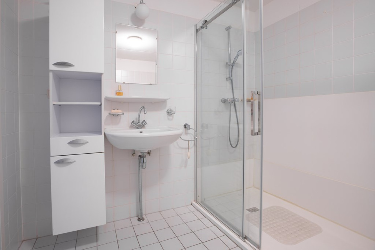 De betegelde badkamer is met een toilet, bad, ruime inloopdouche, wastafel en bergkast, van alle gemakken voorzien.