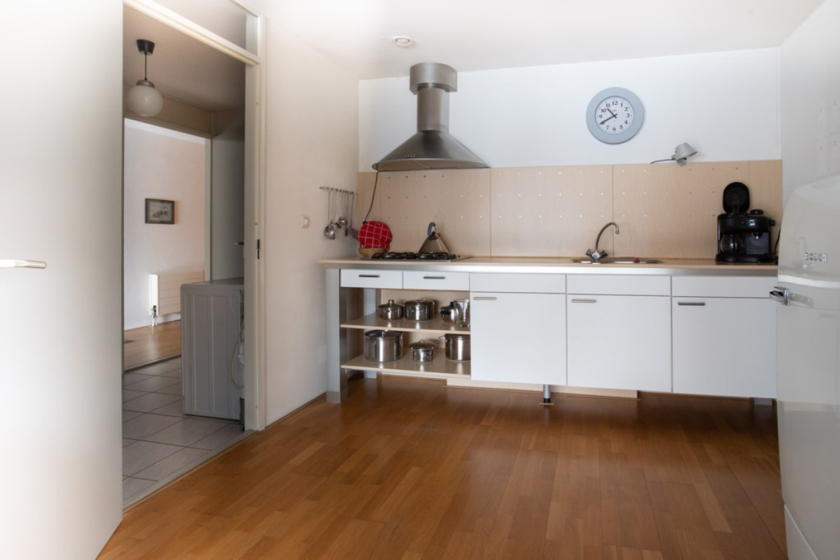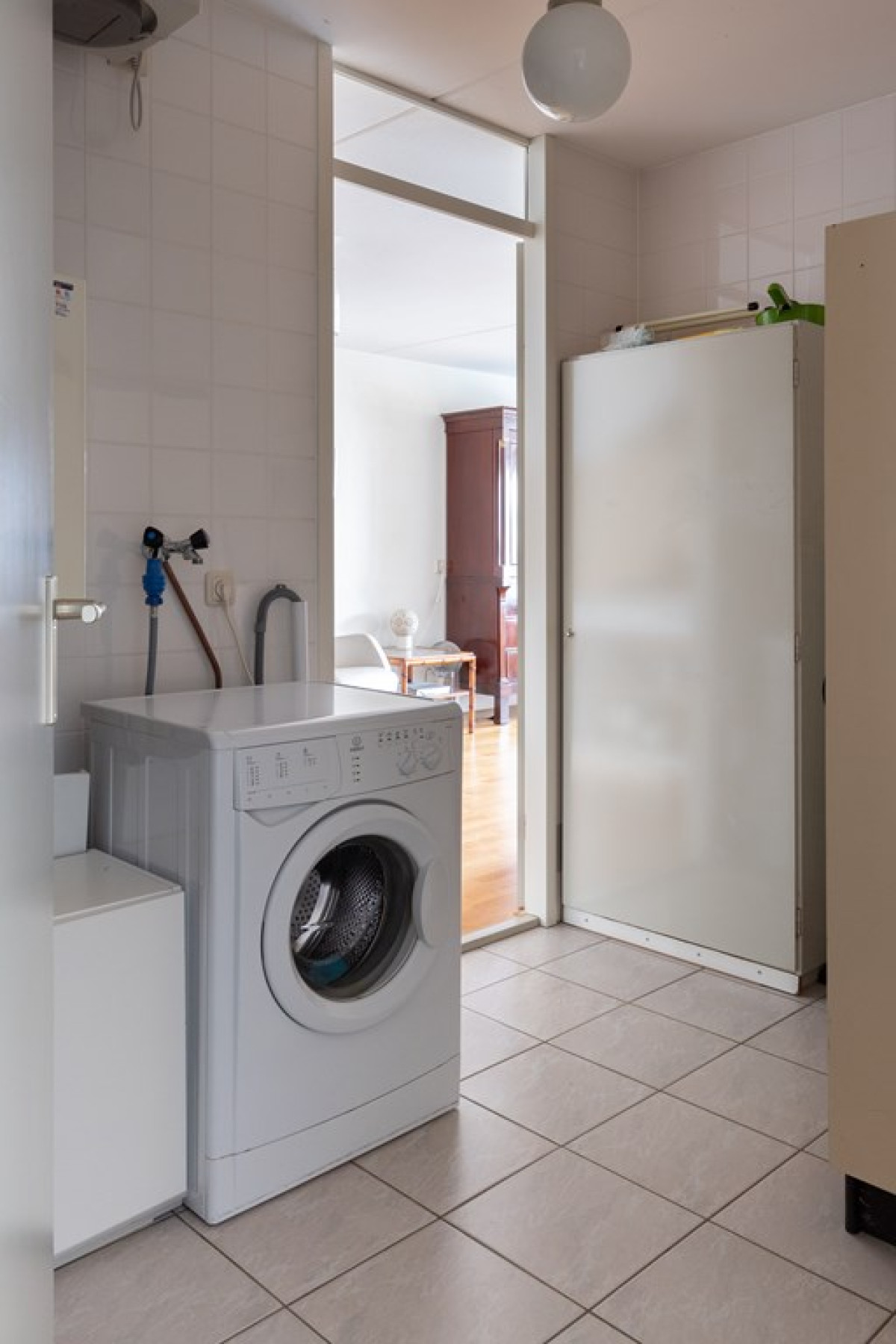 Zowel vanuit de hal als de keuken is de bijkeuken te bereiken. In deze ruimte zijn de CV installatie en het mechanische ventilatiesysteem te vinden. Hier is ook bergruimte en de aansluiting voor de wasapparatuur en vaatwasser aanwezig.