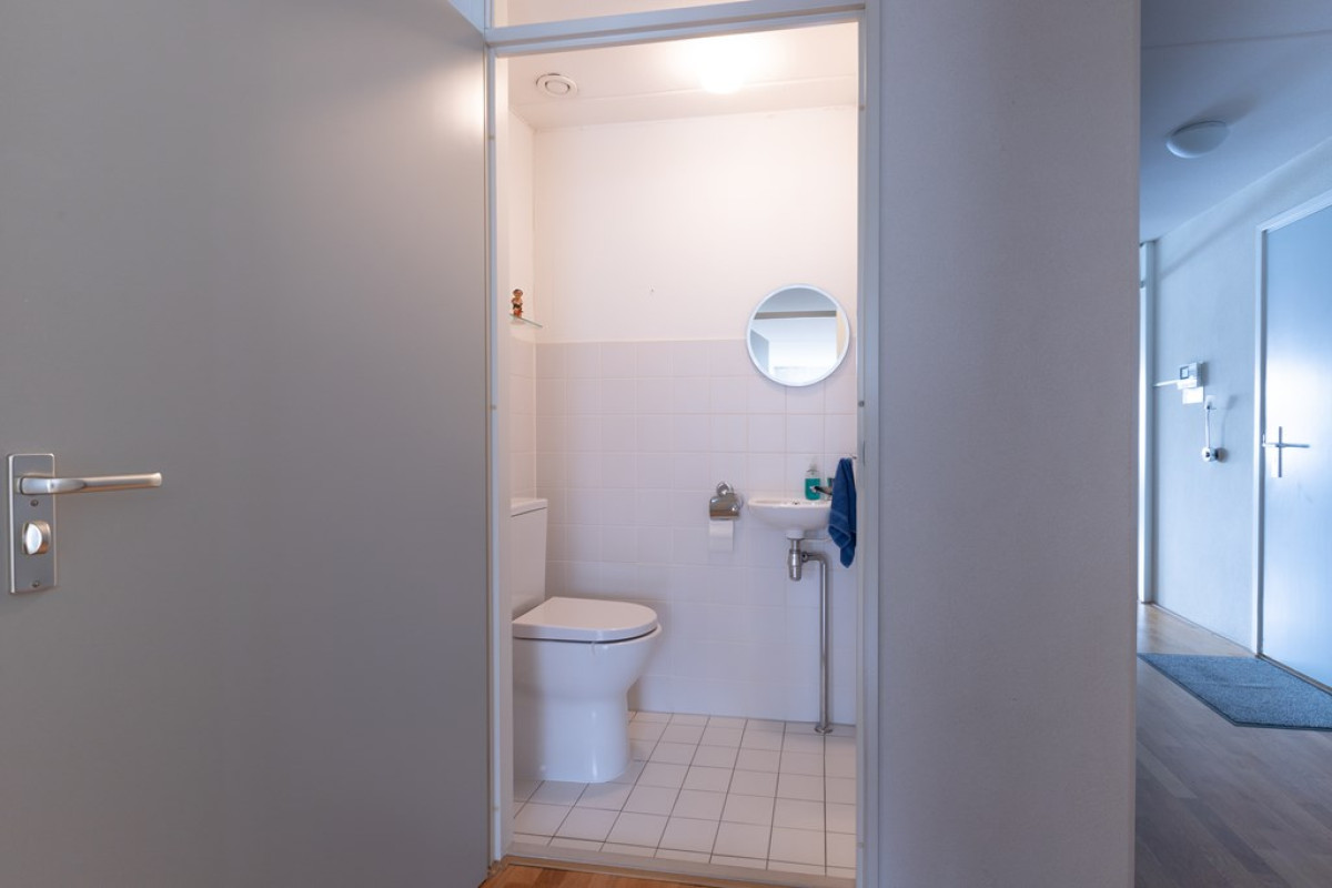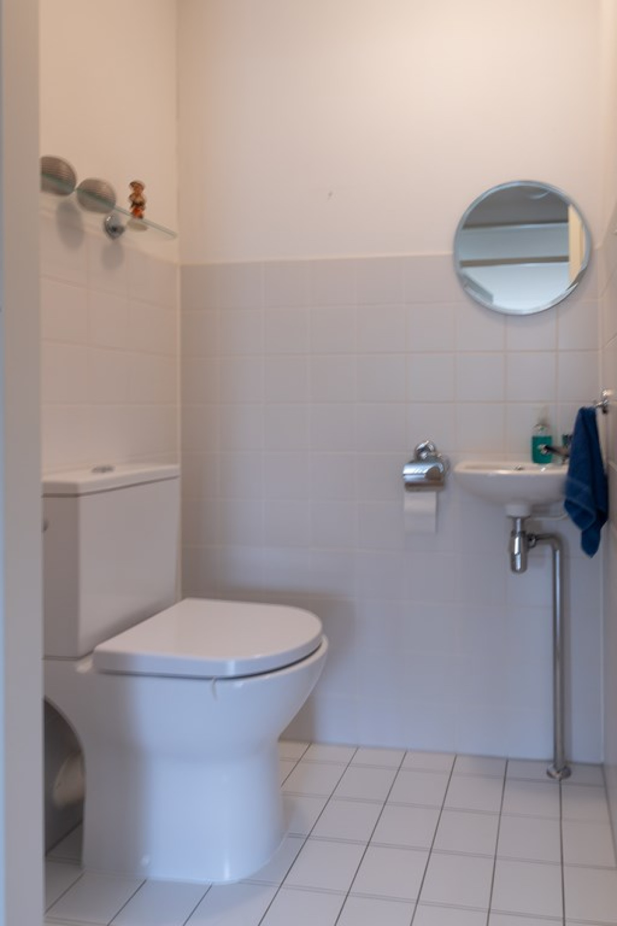 Het aparte toilet is deels betegeld en voorzien van een fonteintje.