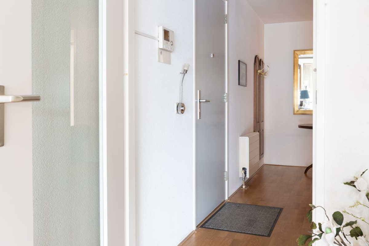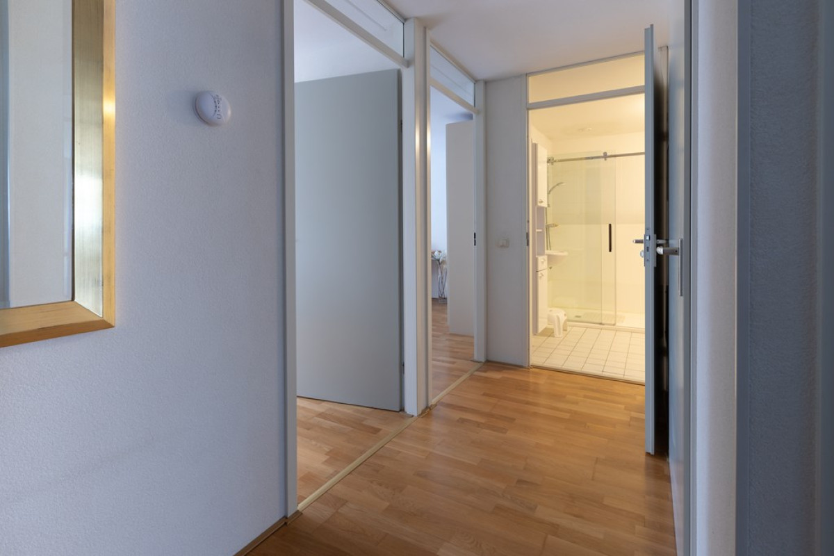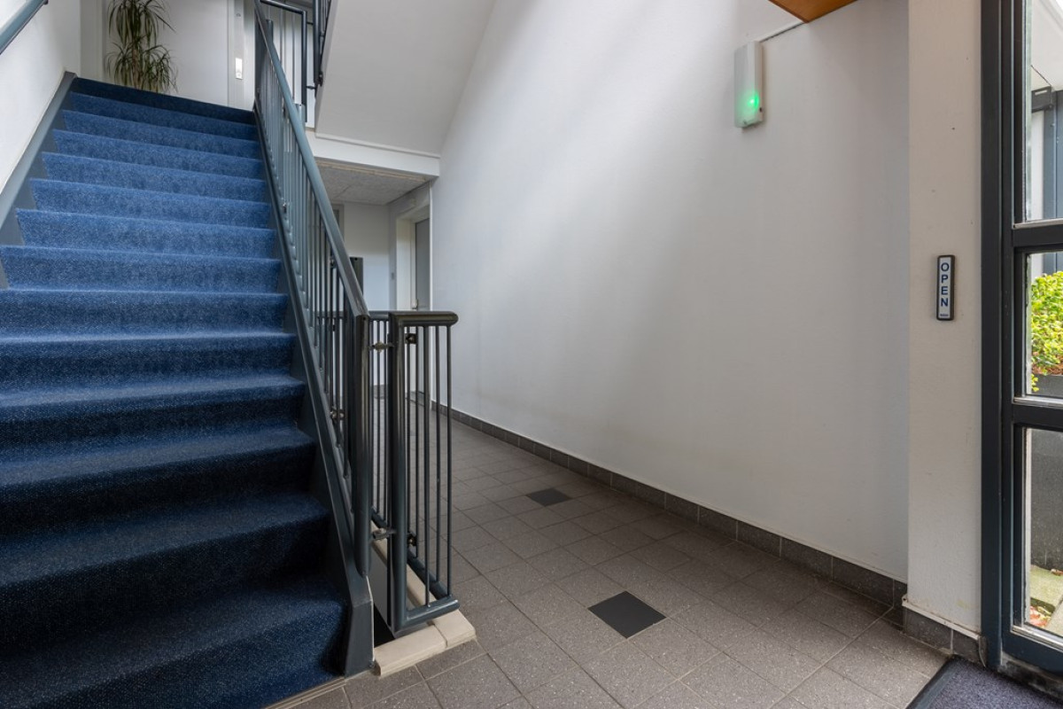 Via de centrale hal komt u via de trap of lift op de eerste verdieping. U stapt de woning binnen in de hal. In deze hangt de videofoon waarmee de buitendeur bediend kan worden. Vanuit de hal kunnen alle ruimtes bereikt worden. In de hal ligt een houten vloer die doorloopt in de woonkamer, keuken en de slaapkamers.