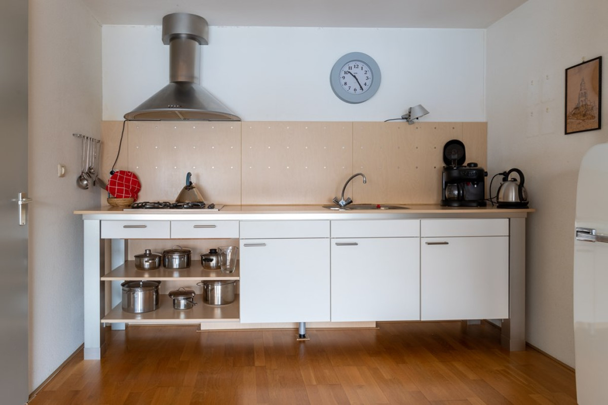 De keuken met rechte opstelling, staat in open verbinding met de woonkamer. De keuken is voorzien van onderkastjes, een gaskookplaat, afzuigkap en een spoelbak.