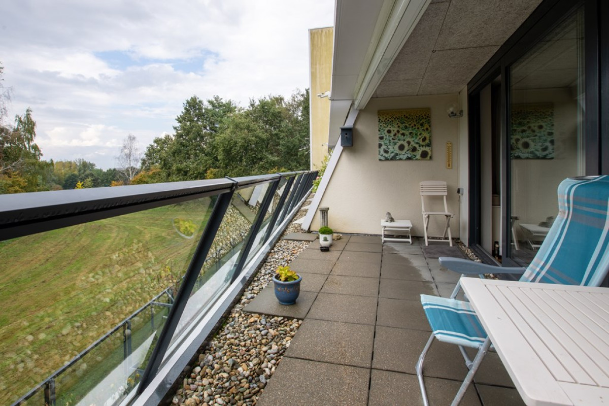 Bij binnenkomst in de woonkamer wordt u aangenaam verrast door de ruimte, het licht en het mooie groene uitzicht. De raampartij is over de volle breedte van de living en via de schuifdeur is het balkon te bereiken.