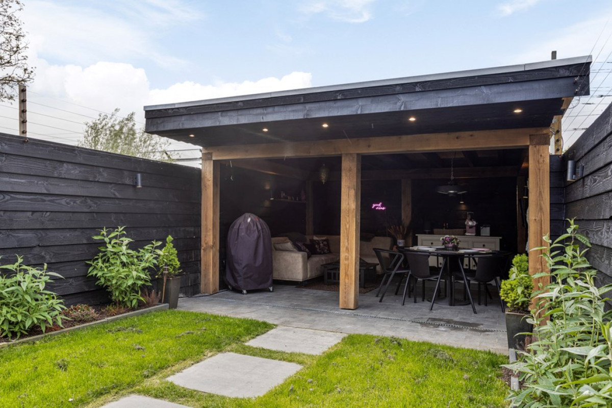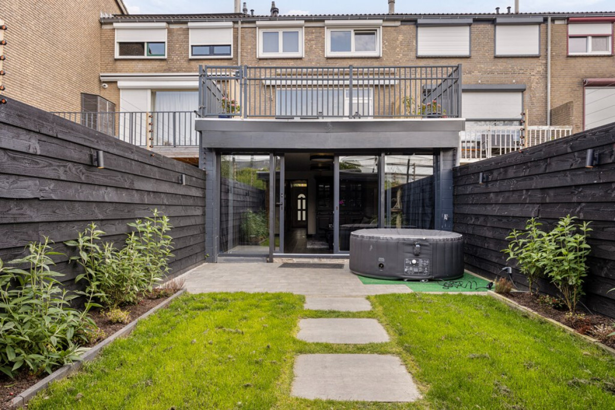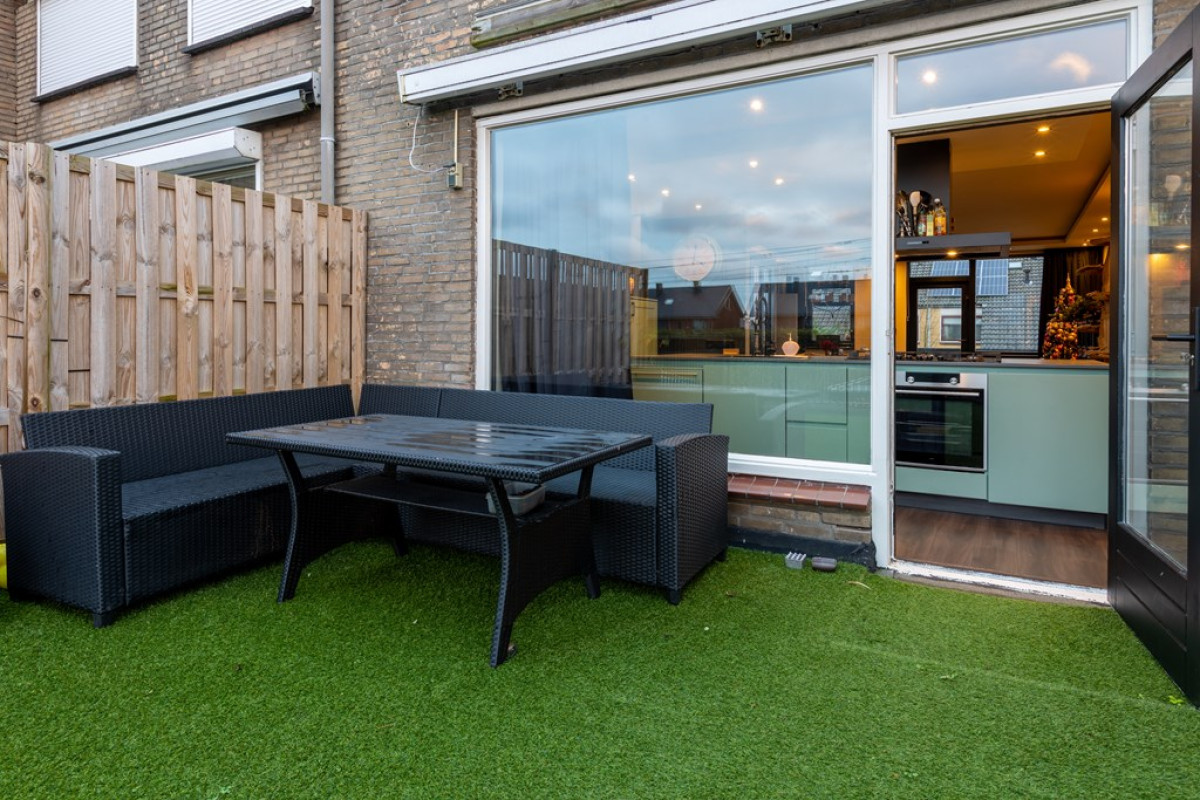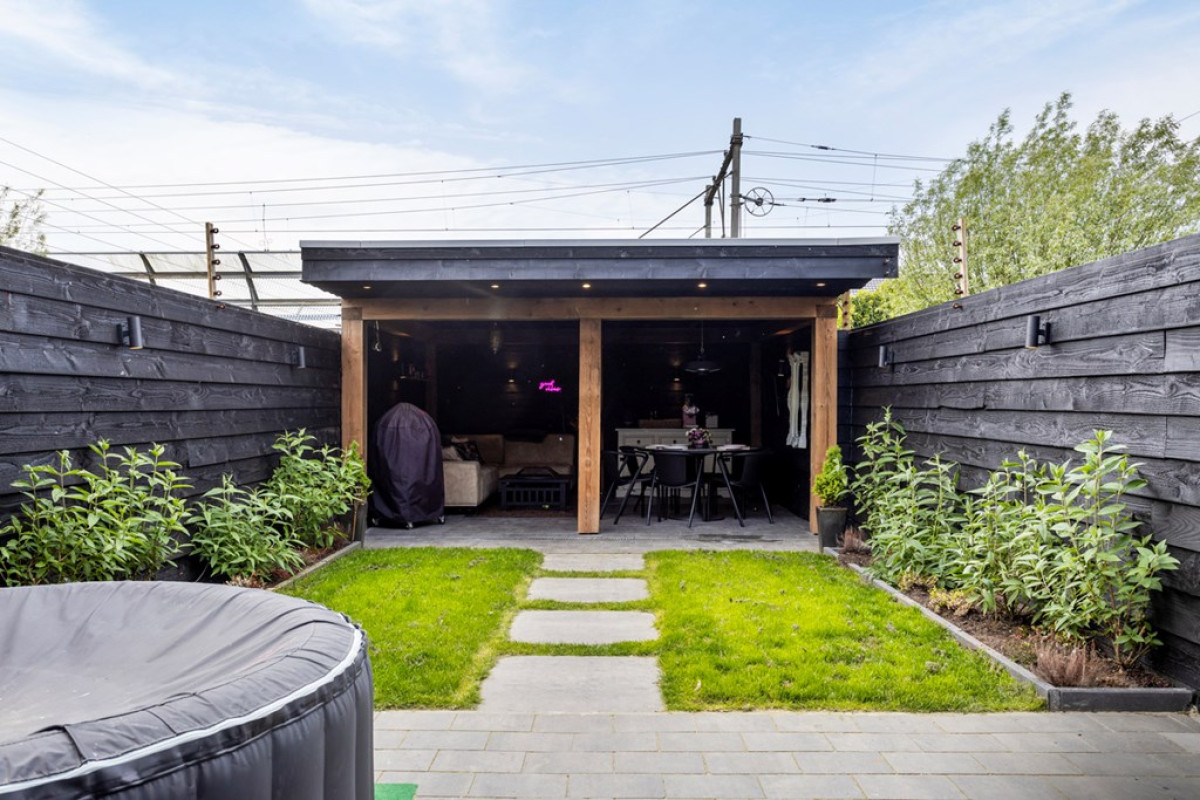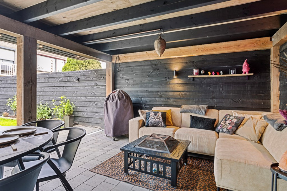De tuin is sfeervol ingericht met grasstroken, beplanting en bestrating. Onder de veranda van kun je een gezellig zit- en eetgedeelte inrichten, ideaal voor warme zomeravonden met vrienden.