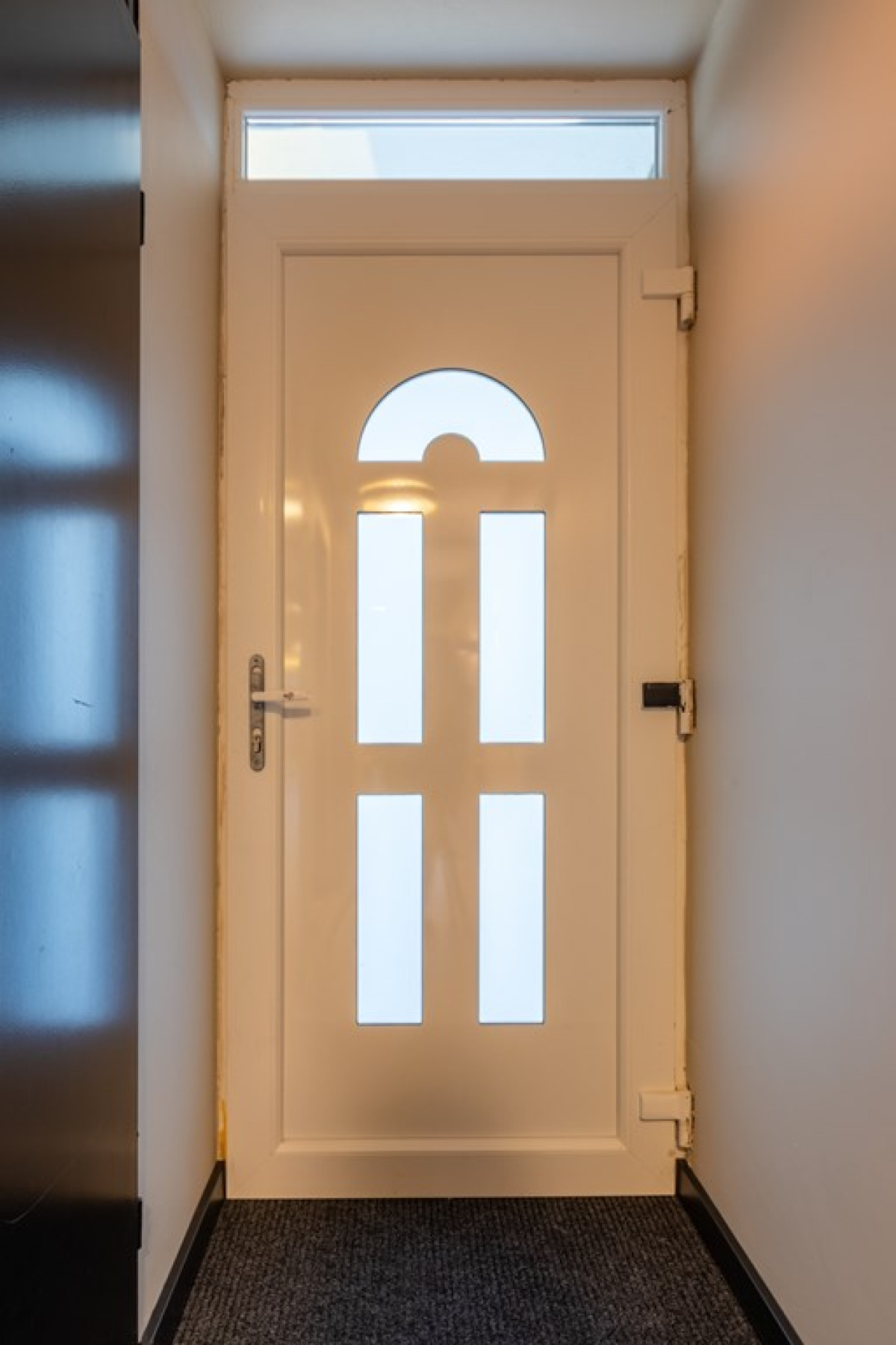 • Gedeeltelijk kunststof kozijnen met draaikiepramen en dubbel glas;