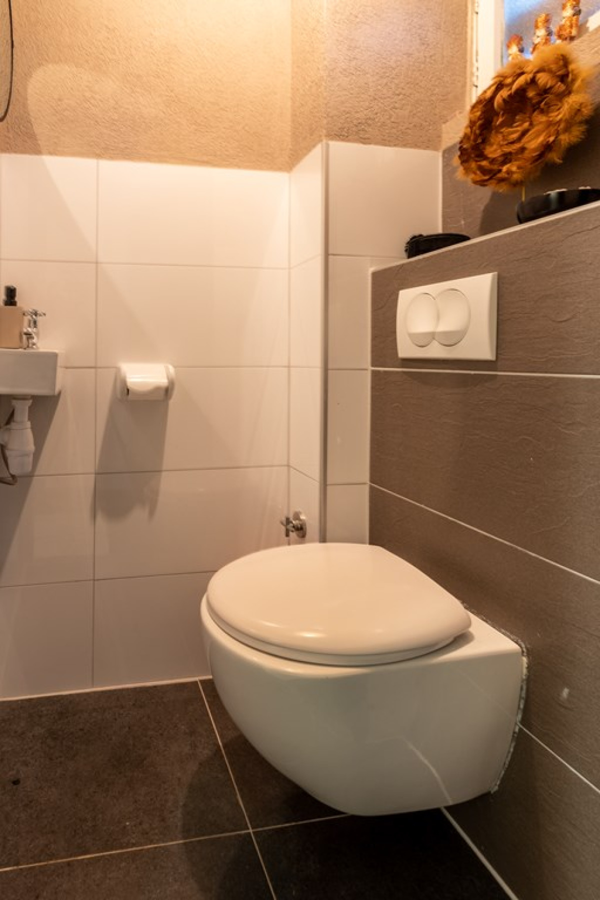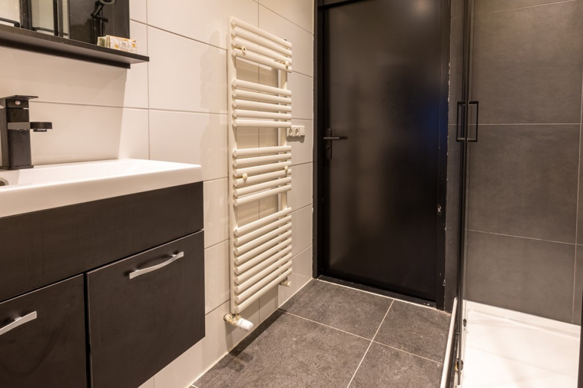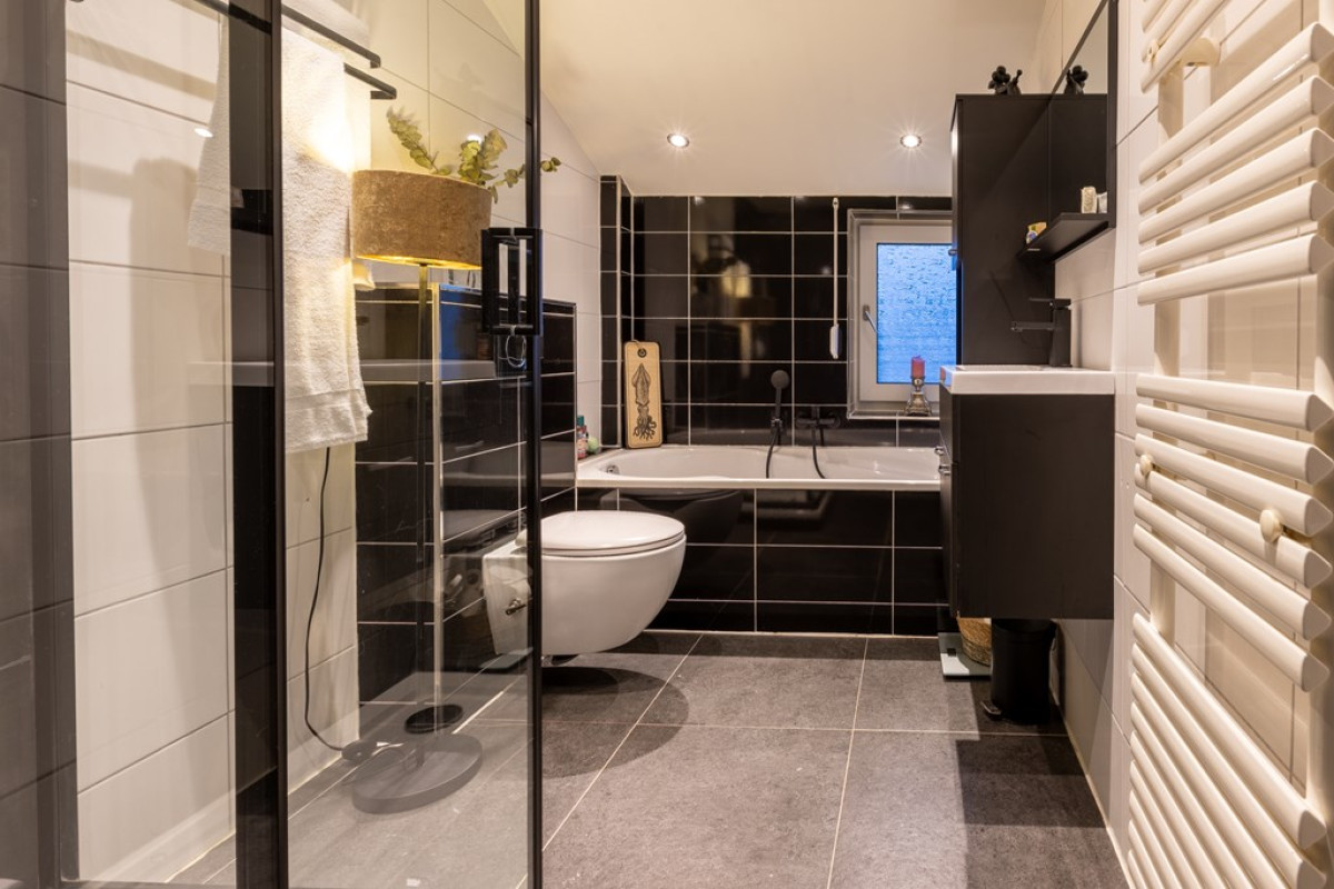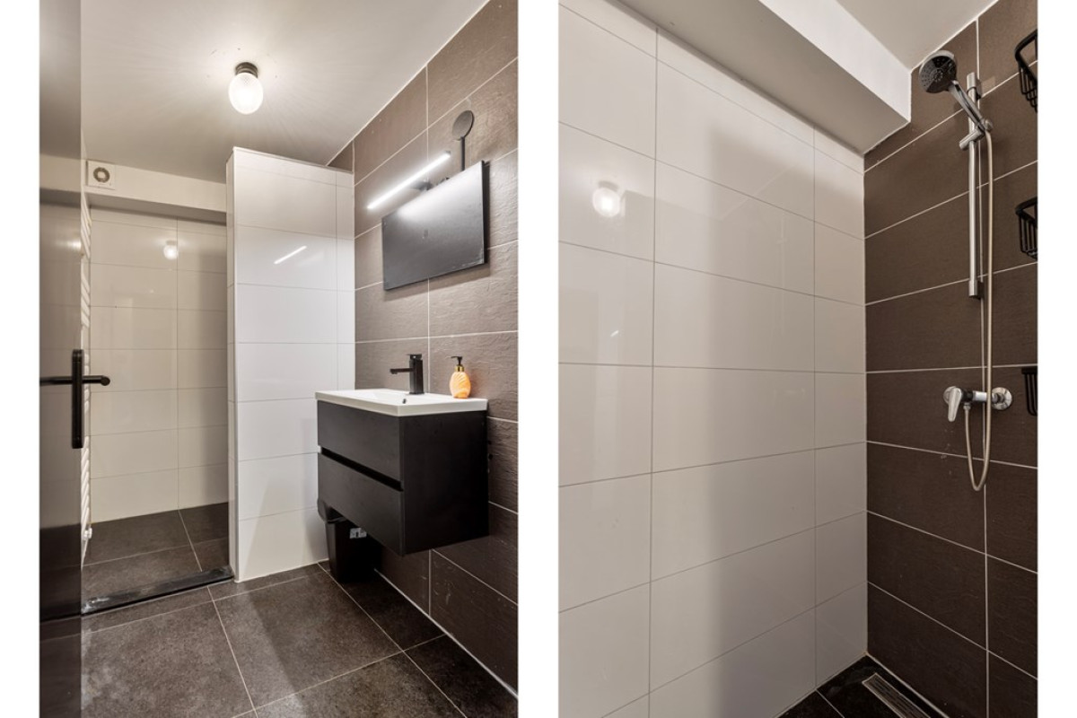 Vanuit de hal heb je toegang tot de badkamer op de begane grond, voorzien van een wastafelmeubel en inloopdouche.